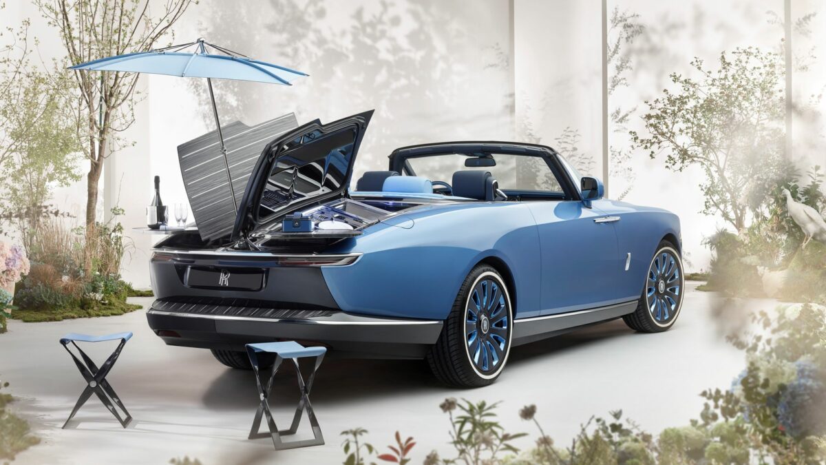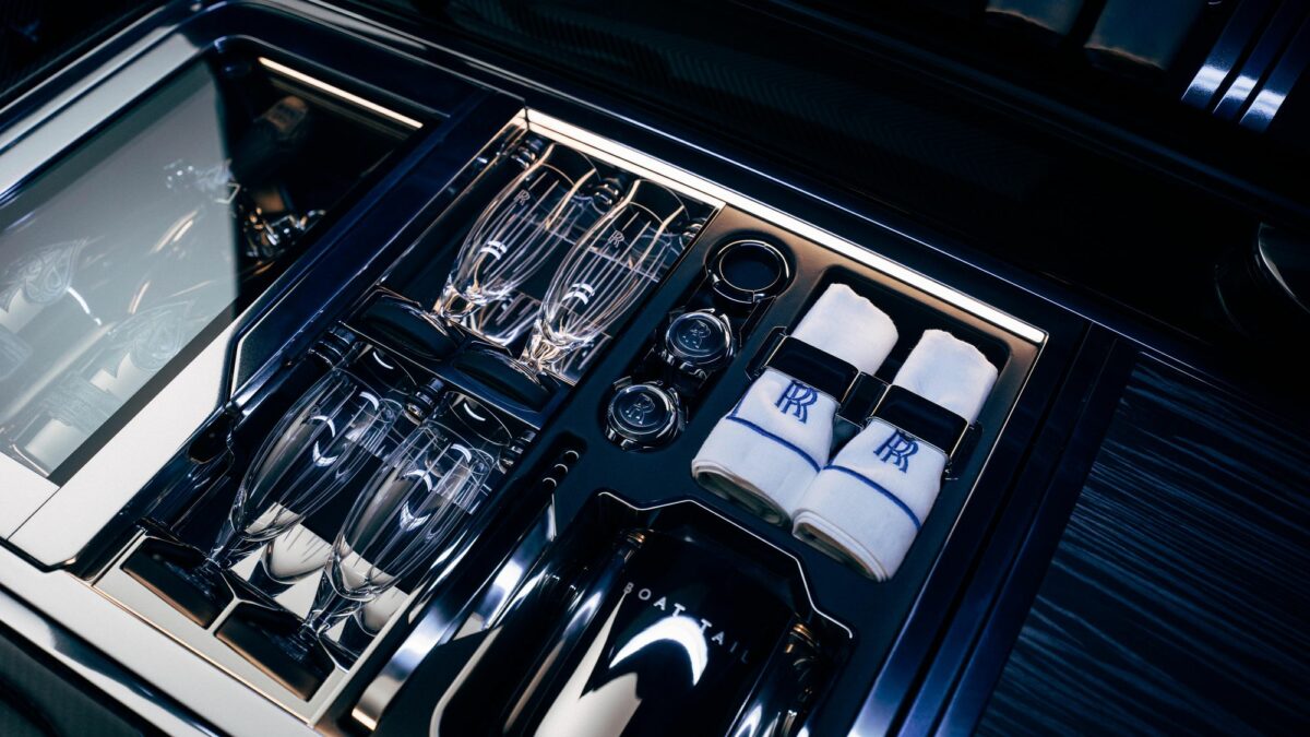 Ráadásul a Boat Tail elnevezés sem újdonság, hiszen a csónakszerű far már az 1930-as években megjelent a palettán. Nem meglepő módon az az ügyfél is rendelkezik ilyen modellekkel, aki megrendelte az új guruló luxusjachtot. Az 5,8 méter hosszú Boat Tail alumínium karosszériaelemeit kézzel formázták, alattuk a Phantom váza rejlik. Elöl és hátul is egyedi fényszórókat kapott, de még érdekesebb a fából készült csomagtérfedél, az alóla felnyíló napernyő, a kivehető kempingszékek, illetve a benne található hűtőszekrény. Persze ott hűl benne két üveg drága pezsgő, amelyekhez a poharakat is mellékelték, de vannak még itt porcelántányérok és ezüst evőeszközök is egy puccos piknikhez.