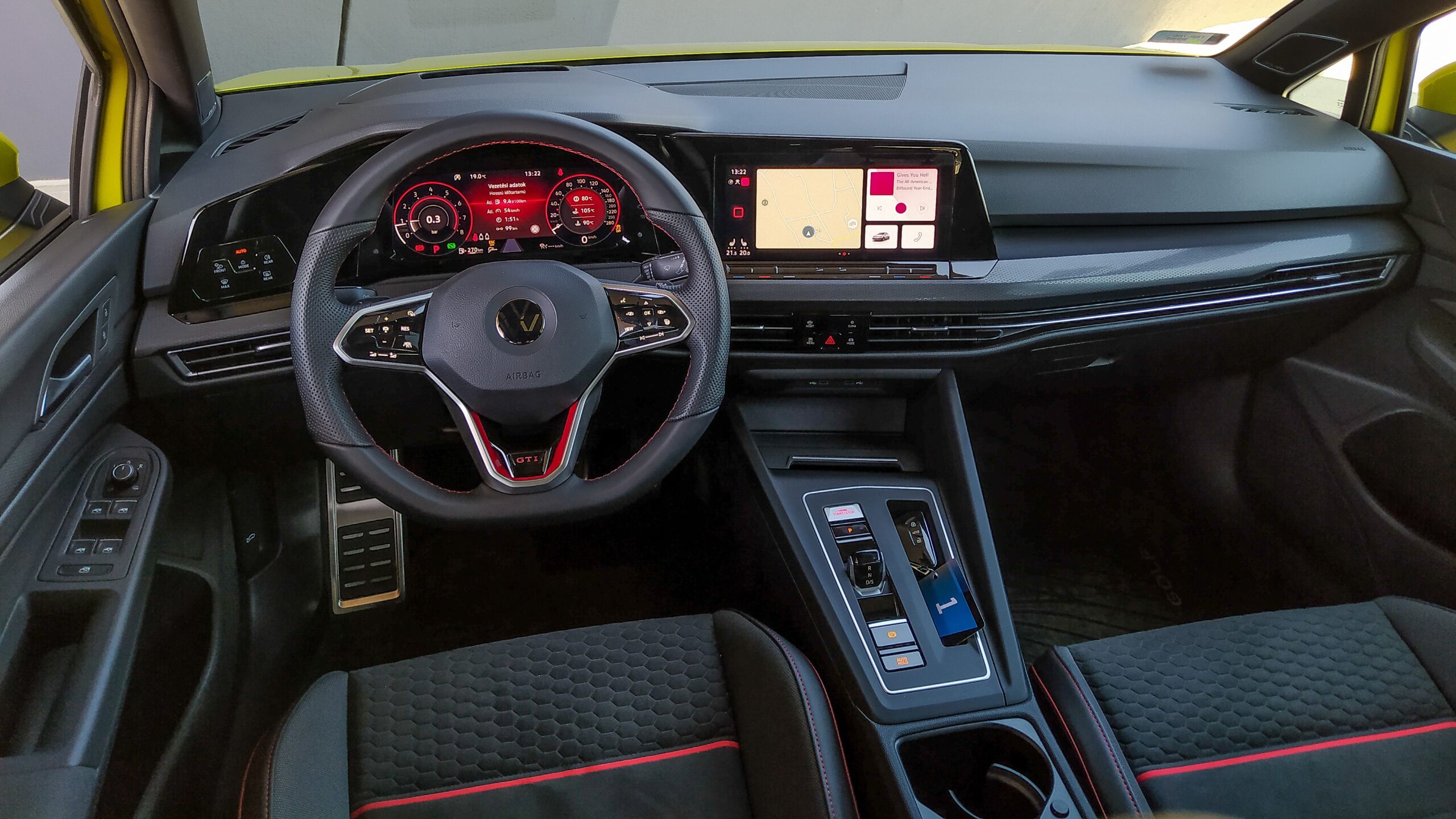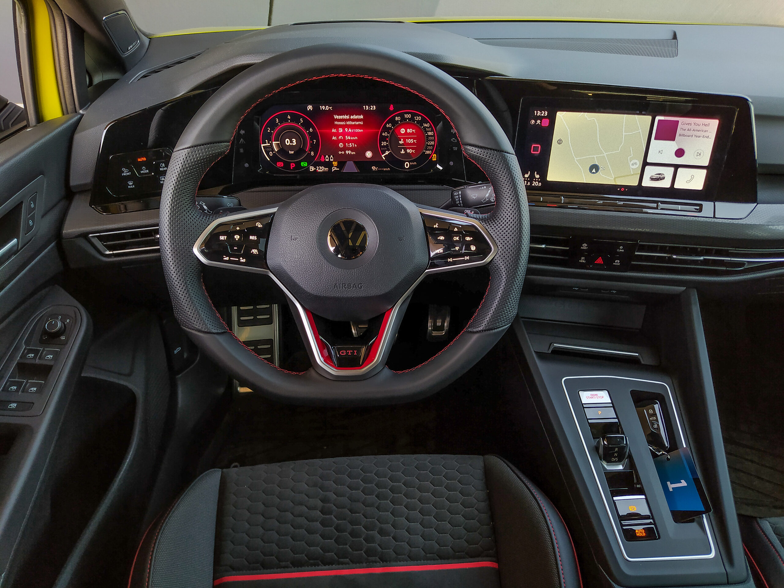 A hetedik generáció valamivel analógabb érzetével még gond nélkül belefért változatlanul hagyni a műszerfalat, ám itt az azonos recept változtatta meg a végeredményt: a nyolcadik generáció extra sterilsége hatványozottan ütközik ki a sportos változaton. Hiába kerül több versenypálya-centrikus adat a sofőr elé, az óracsoport akkor is csak egy hatalmas LCD marad, és hiába a rengeteg sportfunkció a központi képernyőn, amitől továbbra is egy guruló számítógépben érzed magad. Nem segít a Harman/Kardon hifi sem, ami az ugyanezen gyártó hangcuccával szerelt BMW termékek hasonlóan tökéletes, de kissé jellegtelen zenei élményét adja, sem pedig a temérdek háttérbe rejtett extra: bizony, a GTI Clubsport lényegében egy csúcsfelszereltségű, már-már prémium kompakt a sportos részletek felszíne alatt.