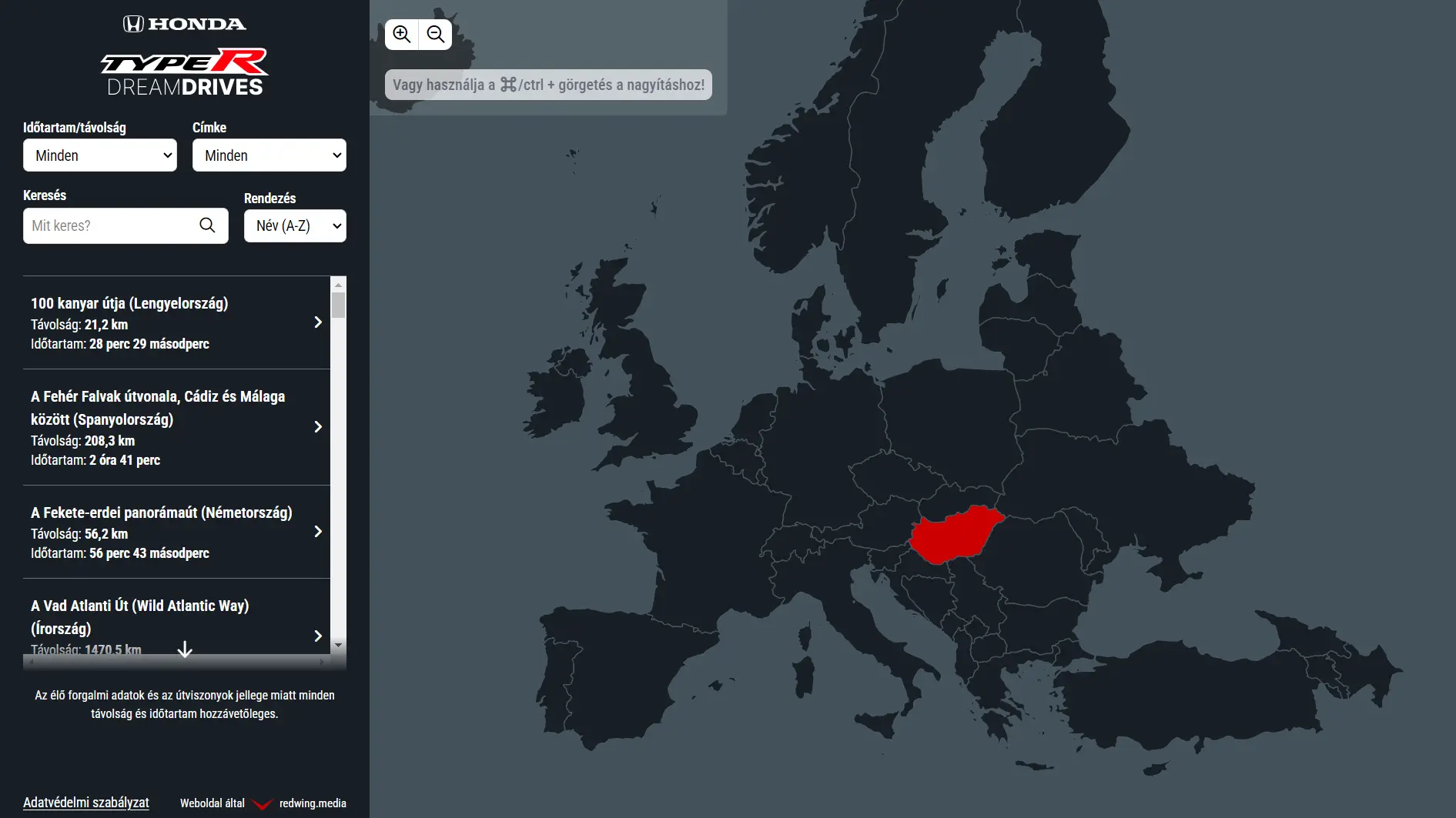 A Honda interaktív Civic Type-R térképe megmutatja, hol élvezheted ki igazán a sportautódat Európában