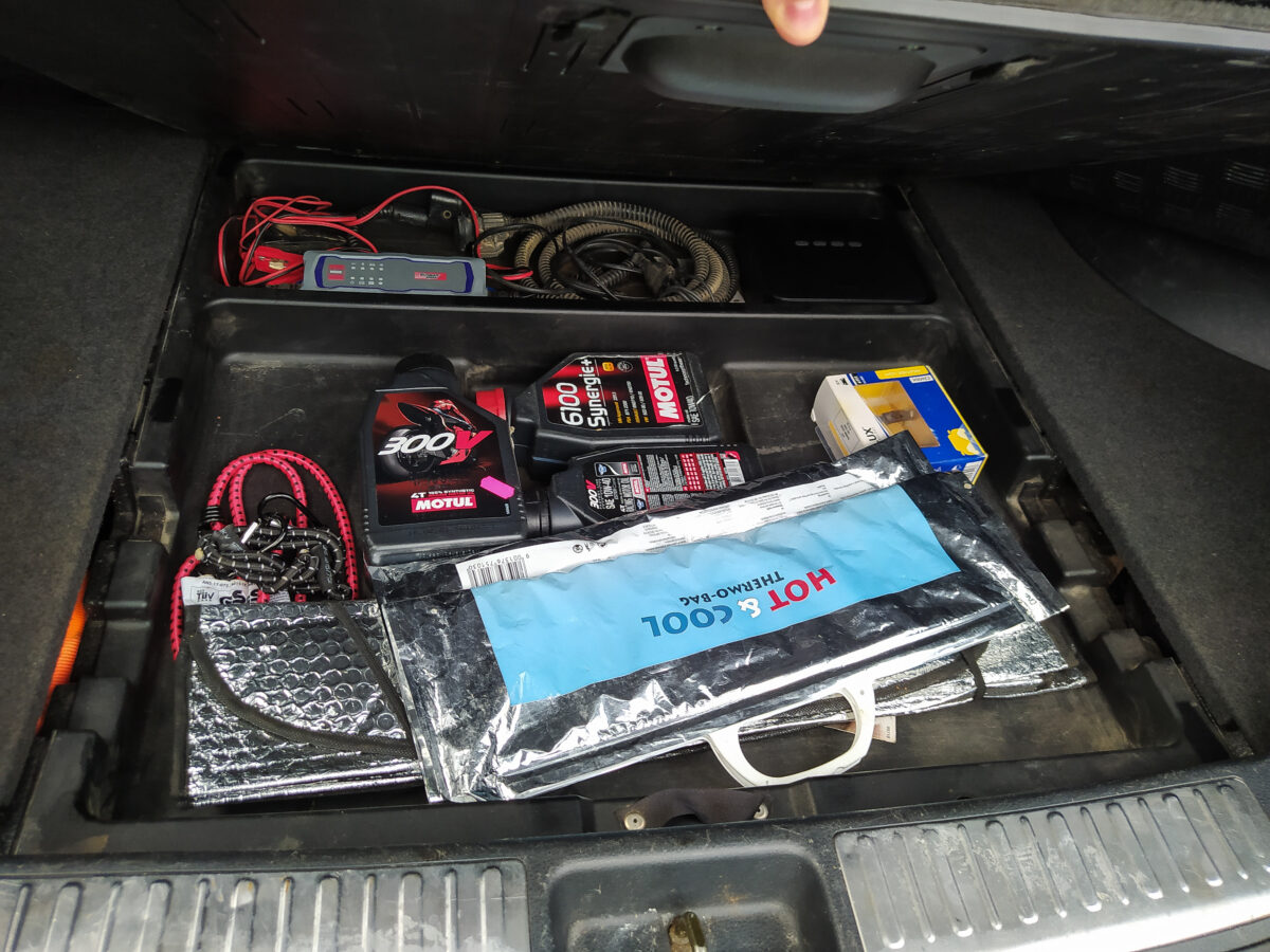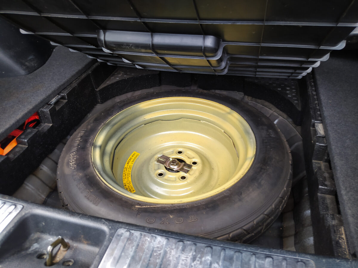 A csomagtérpadló alatt a szerszámoknak és kellékeknek kialakított tárolót, azalatt pedig a mankókereket találjuk