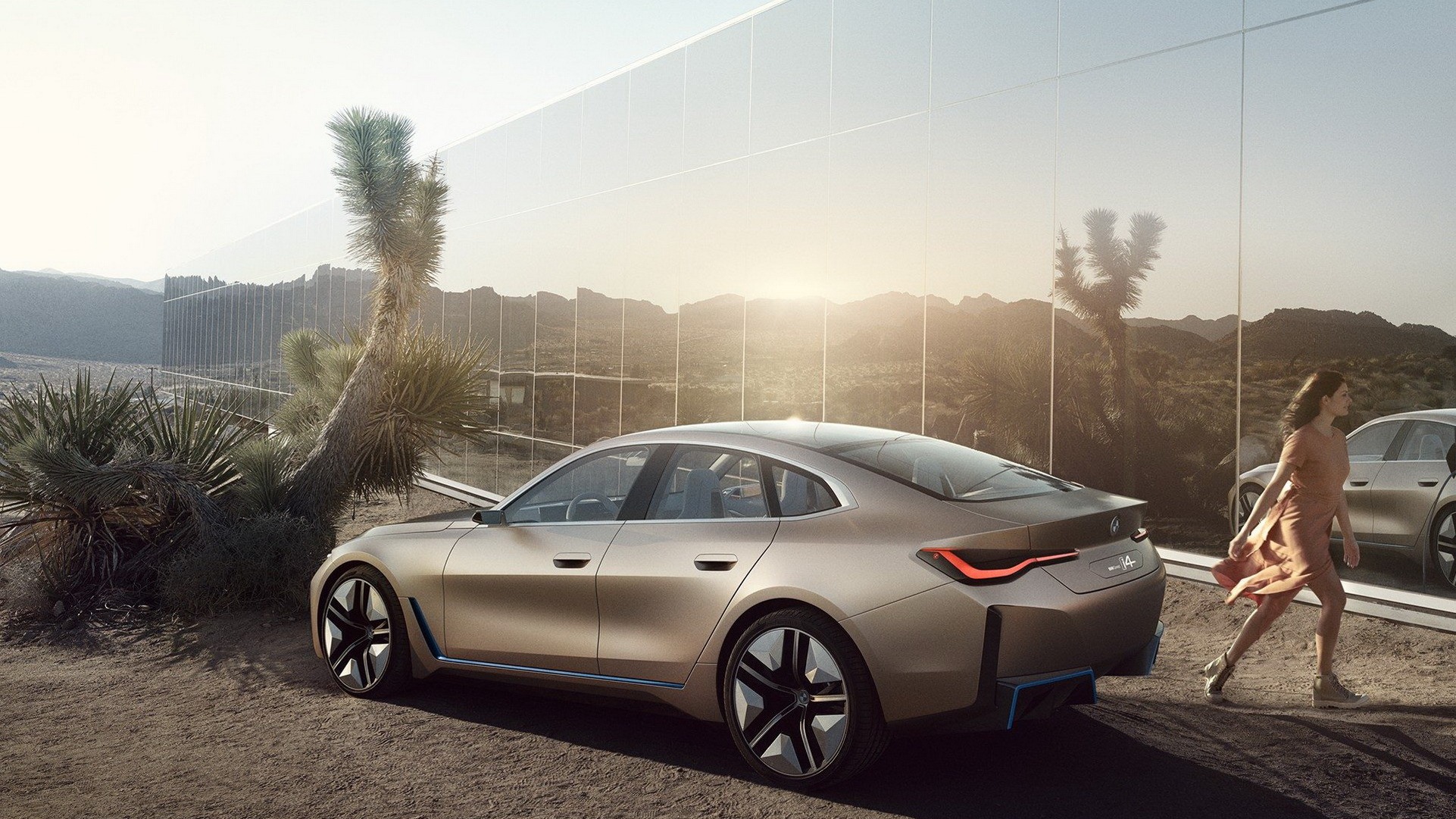Dizájn tekintetében radikális újdonság bevezetésére készül a BMW. Ez pedig nem más, mint az autó orrának teljes magasságában ágaskodó hűtőmaszk pár, pontosabban azok stilizált változatai, mivel a Concept i4 orrán funkciója aligha lenne. A remek arányú ötajtós sportos modell hátulján a már látott keskeny fényszórókat láthatjuk, az utastér fölött pedig teljes egészében üvegből készült a tető. A beltér letisztult, elegáns és fényűző is egyben. A világos bőr, Alcantara és szövet kárpit alkalmazása mellett bronzos-arany kiegészítő elemeket és kristályüvegből készült iDrive kezelőszervet, zár kapcsolókat és egyéb apró gombokat használtak. A legérdekesebb mindenképp a digitális műszerfal, mely két hatalmas kijelzőből áll enyhén hajlítva. A kijelzők felülete fény elnyelő hatású, vagyis nem csillan vissza rajtuk a nap sugara, fényes nappal is tökéletesen láthatóak. A Concept i4 érdekessége a három választható menetmód, Core, Sport és Efficient, melyekhez külön hangeffektek tartoznak. Ezeket maga Hans Zimmer a híres zeneszerző komponálta meg a BMW számára és nagy valószínűséggel a sorozatgyártásra kész autókban is fogunk vele találkozni.