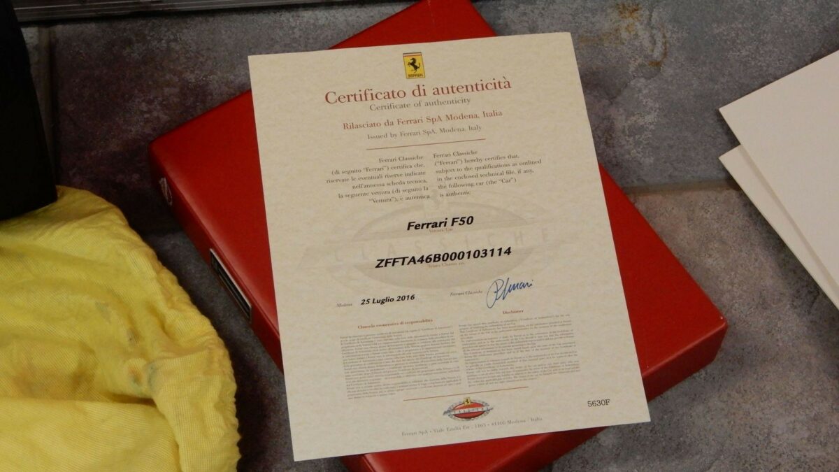 A Forma-1-es versenyautóból eredeztethető 4,7 literes V12-es szívómotorral szerelt szupersportautó közvetlen a kiállítás után magánkézbe került Németországban. Egy gyűjtő, Michael Gabel vásárolta meg, 2016-ban a Ferrari pedig hitelesítette is az autót, valamint átesett egy nagyobb szervizen, amikor kicserélték a benzintankját egy biztonságosabb darabra. 2017-ben az autó elhagyta Németországot, Amerikába hajóztatták, ahol 100 000 dollárért alakították át a helyi szabályoknak megfelelően és helyezték forgalomba. Ennek tekintetében külön is érdekes az autó futásteljesítménye, 5425 kilométert mutat csupán a számlálója. A New England-i Ferrari szerviznél átesett egy újabb szervizen a 8000-et forgó V12-es motorral szerelt F50, most pedig eladásra kerül az RM Shoteby's által. Az árverésre kerülő ikonért 2,5-2,75 millió dolláros összeget várnak.