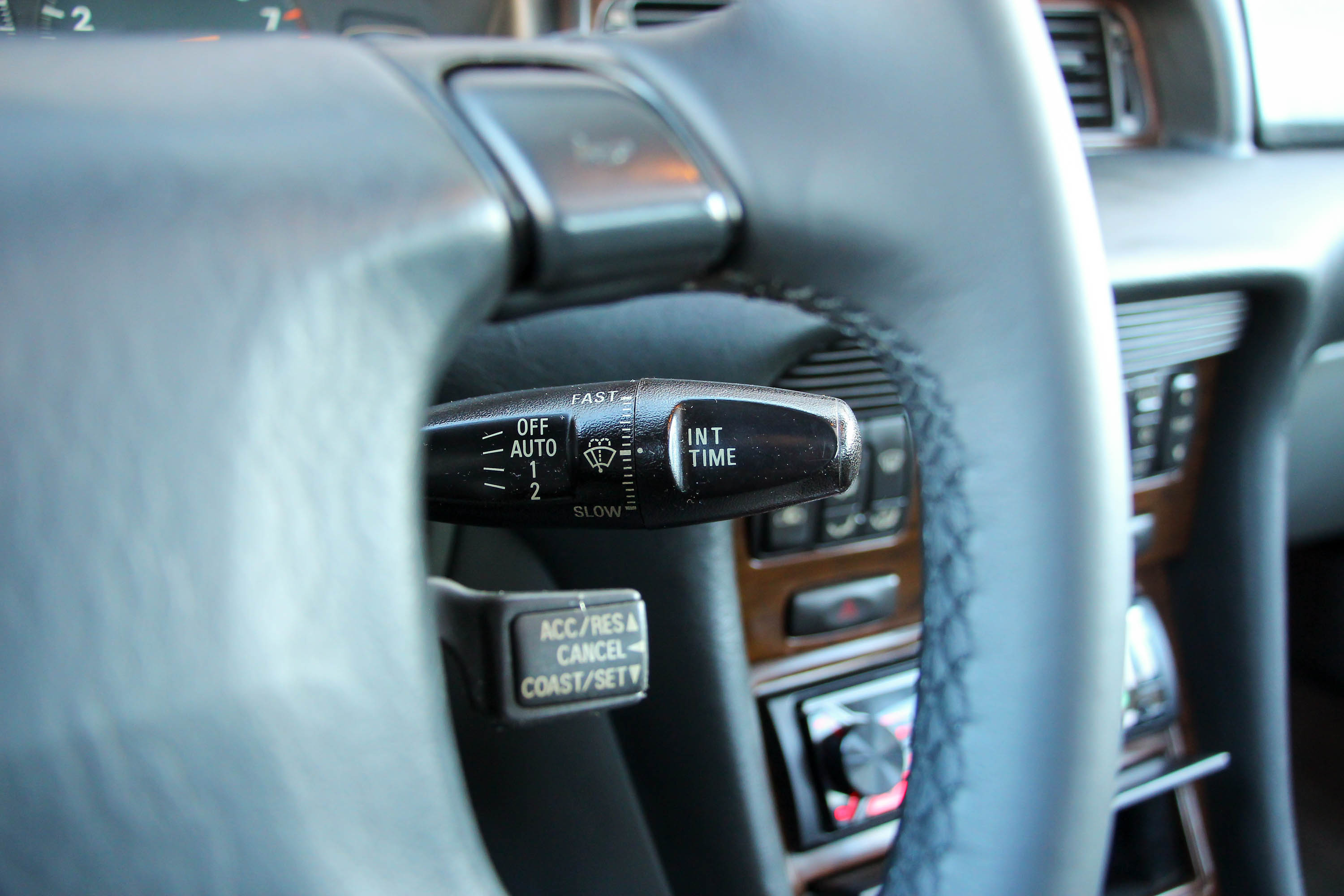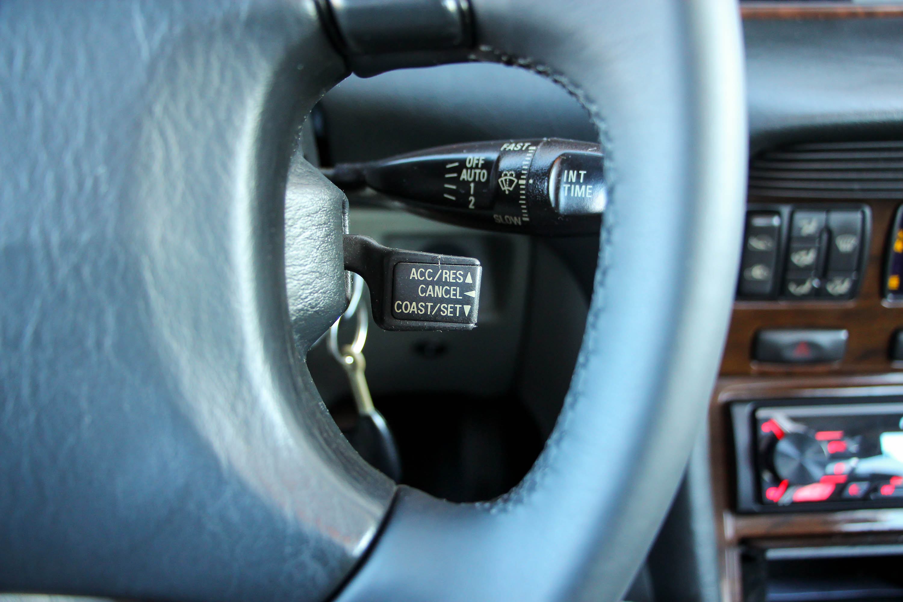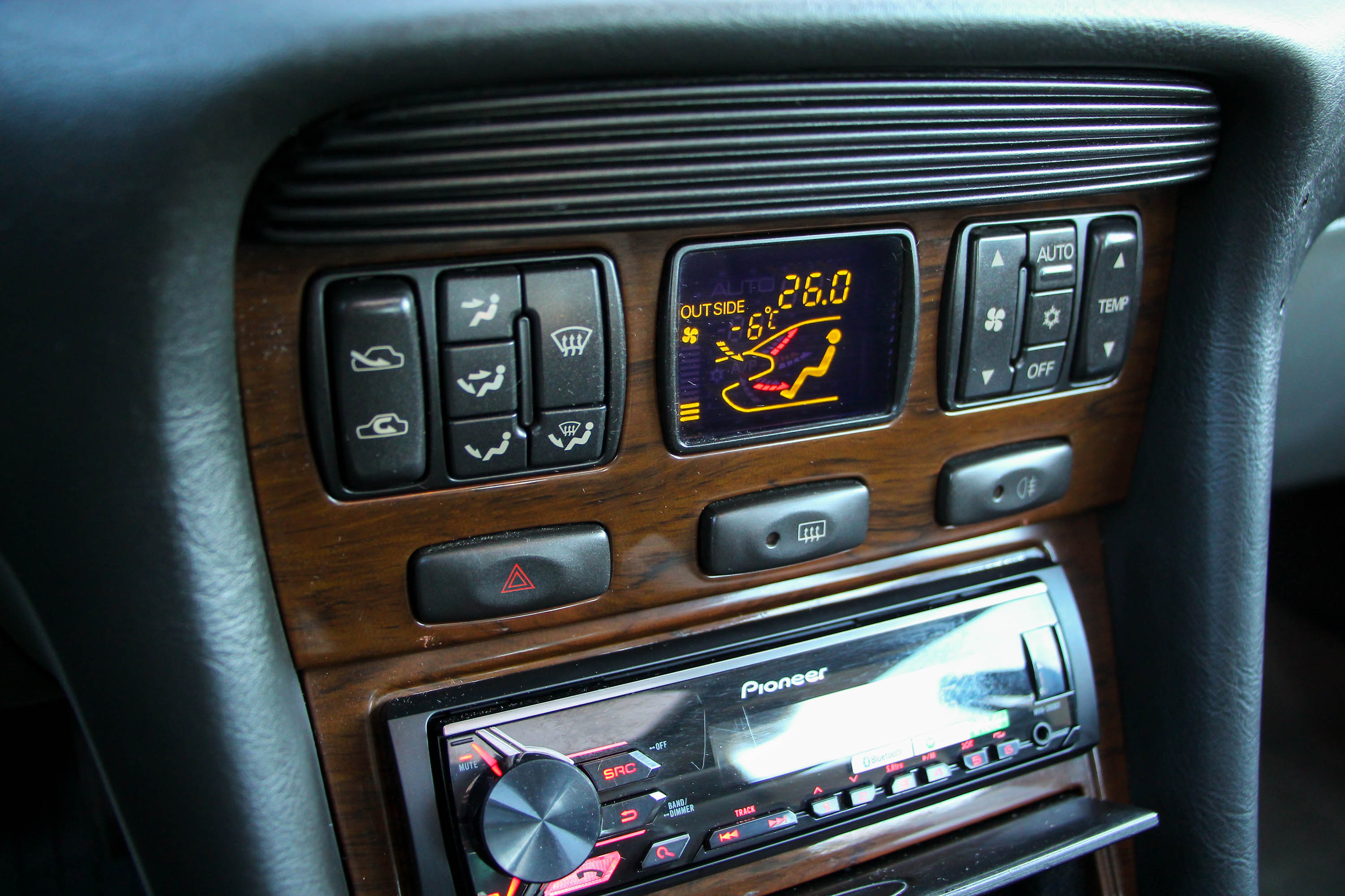 A sofőrt körülölelő műszerfal, a korabeliekhez képest egészen emészthető (ál) fabetéttel, automata klímával és persze az elmaradhatatlan kvarcórával
