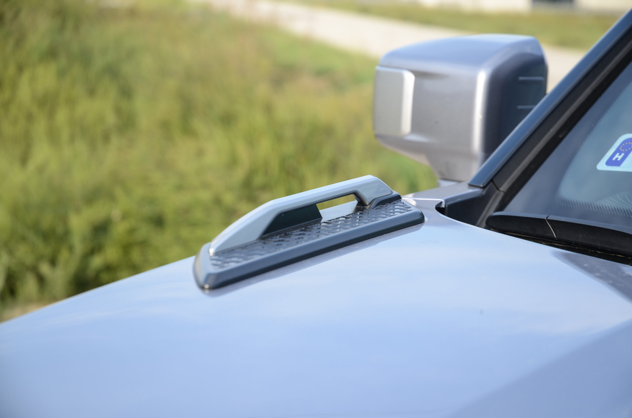 És, hogy miért nem szabad a komoly terepjárókhoz hasonlítani a Torrest, amelynek a külleméről azt próbálja elhitetni, hogy sarazásra született? Na, itt térnék vissza a cikk elején említett zsanérok hiányára. Mert a figyelmes olvasók biztosan észrevették már korábban, a csomagtartó fotóinál is, hogy bizony felfelé nyílik a méretes hátsó ajtó, ráadásul elektromosan. A hatalmas kilincset is hiába rángatná bárki, az ugyanis csak egy műanyag dísz, amelynek belső felén egy gomb ad jelet az elektromos teleszkópoknak. Ugyanígy szemfényvesztés a gépháztetőből kiálló két kallantyú és a piros négyzet is az első lökhárítón, mind olcsó dekoráció. Persze azért boldogul a terepen a SsangYong SUV-ja, ám egyáltalán nem a Defenderhez vagy a Wranglerhez mérhető a tudása, főleg nem így, elsőkerék-meghajtással. A 19,5 centis hasmagasság valóban segíthet a kavicsos, könnyebb erdei utakon, ám szerintem az átlagos felhasználóknak nem ad annyi extrát a valódi terepen, hogy megérje az egyértelműen billegősebb, érezhetően magasabb futómű hátránya az aszfalton.