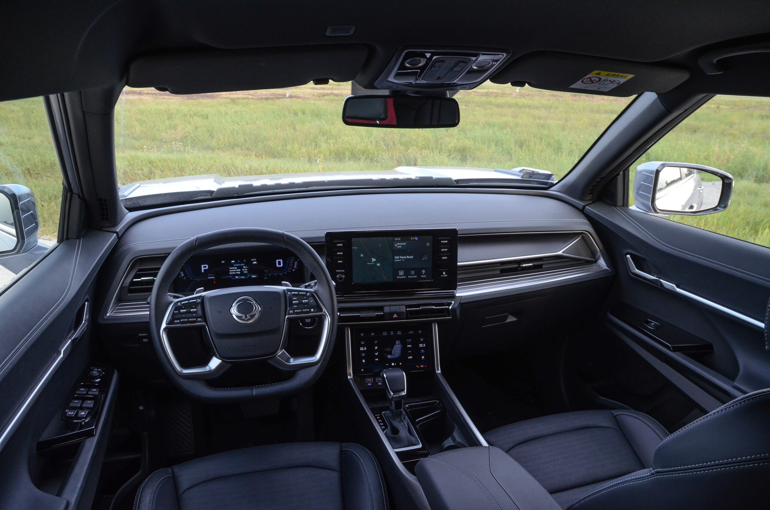 A beltérben már egy teljesen más érzet fog el. Amíg kint a nyers és zord terepgép vad ordítása kísér, addig az ajtót magamra csukva egy prémiumautó nyugalmas csendje fogad. Mondjuk a kormánykerék formája és a klímavezérlő-képernyő láttán nehéz lenne letagadni, hogy melyik német márka csúcsmodelljei inspirálták a belteret, ám a két különböző technikát egyesítő digitális műszeregység és a szögletes, mégis kreatív vonalakkal dolgozó műszerfal-sziluett még az ismerős részletek ellenére is eredeti karaktert biztosít az utastérnek.