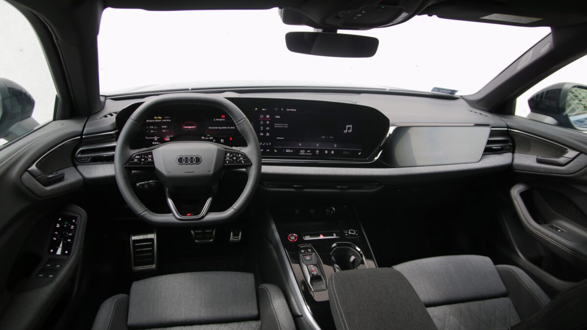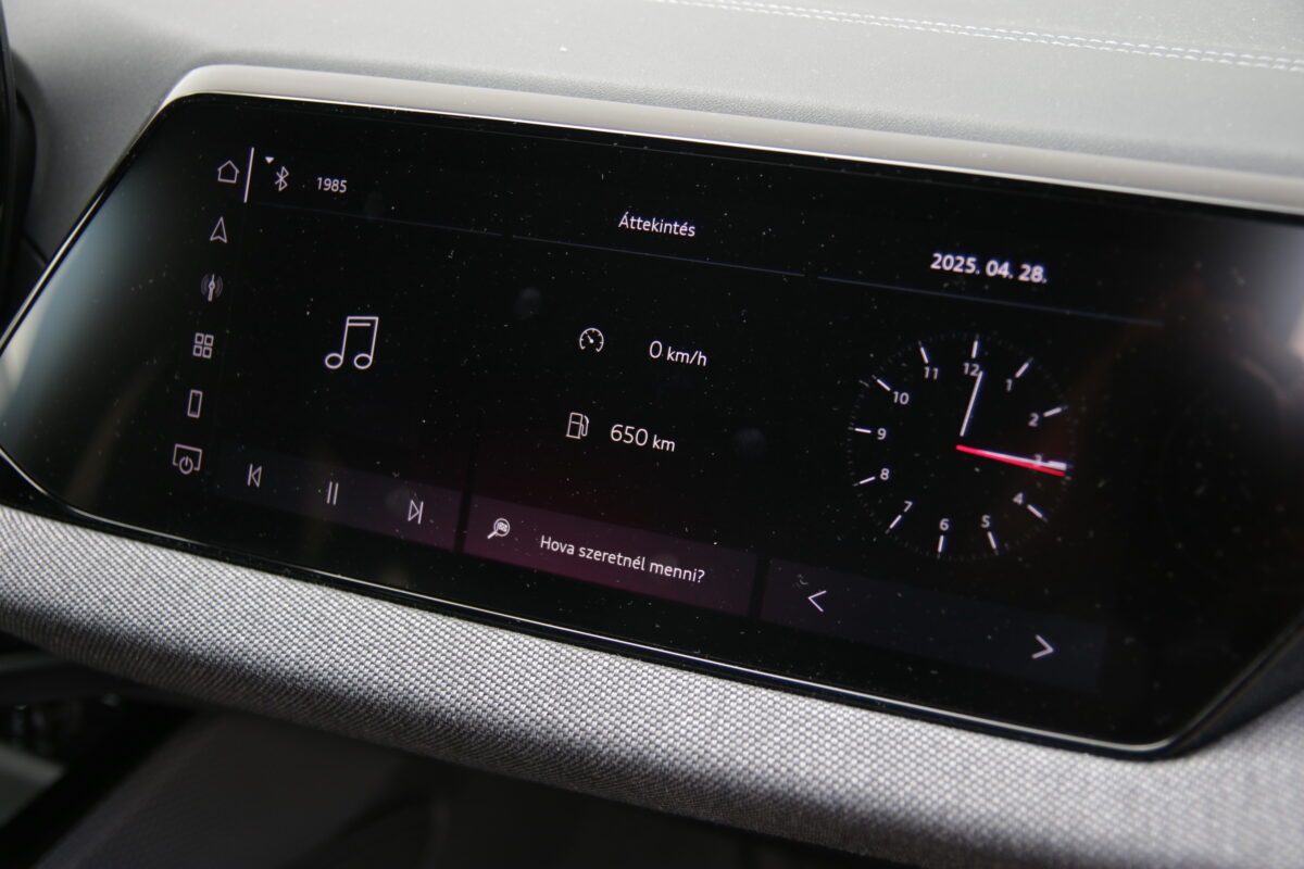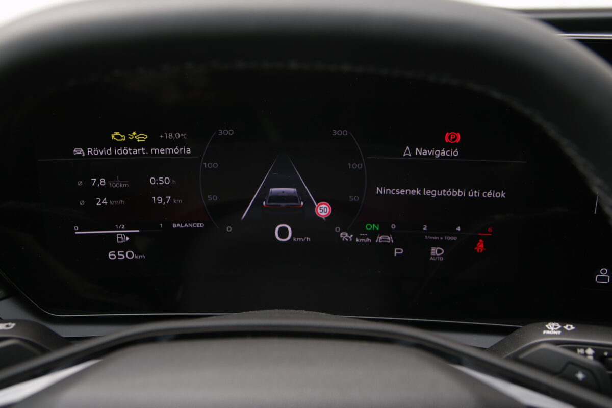 Az Audi új formanyelve a belteret is meghódította. Így a legfrissebb generációs négykarikásokból már jól ismert három képernyő fogad a műszerfalon. Az ajtókárpitokon található érintőpanelre összezsúfolt funkciógombokat, illetve az érintőgombos multikormányt még mindig nem szerettem meg, de talán már lerágott csont, hogy ezeket ekézem az új Audi modellekben. Az ülések azonban ebben az Audiban is kiválóak, akár a formát, akár a tartást, akár az anyagok minőségét nézzük: legalább egységesek a megoldások a teljes kínálatban.