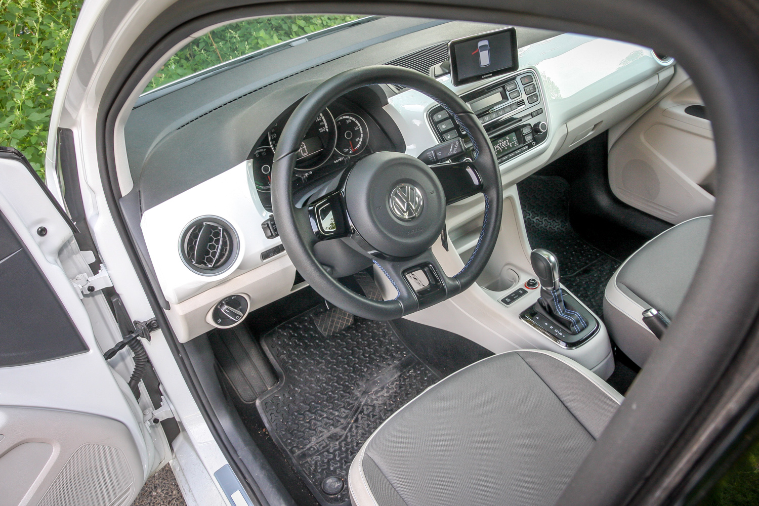 Némi kékítéssel a volánon, a váltó helyetti menetmód-választó szoknyáján, pár extra kapcsolóval és más műszerfallal, de lényegében az e-up! beltere az up! benzines miniével azonos. Széria a bőrkormány, az ülésfűtés, a szélvédőfűtés, a maps + more infotainment, a klíma, az alufelni, az ESP, a hifi, feláras pl. a tolatóradart és tempomatot adó Komfort csomag (83 ezer Ft.). A világos kárpit gyorsan koszolódik