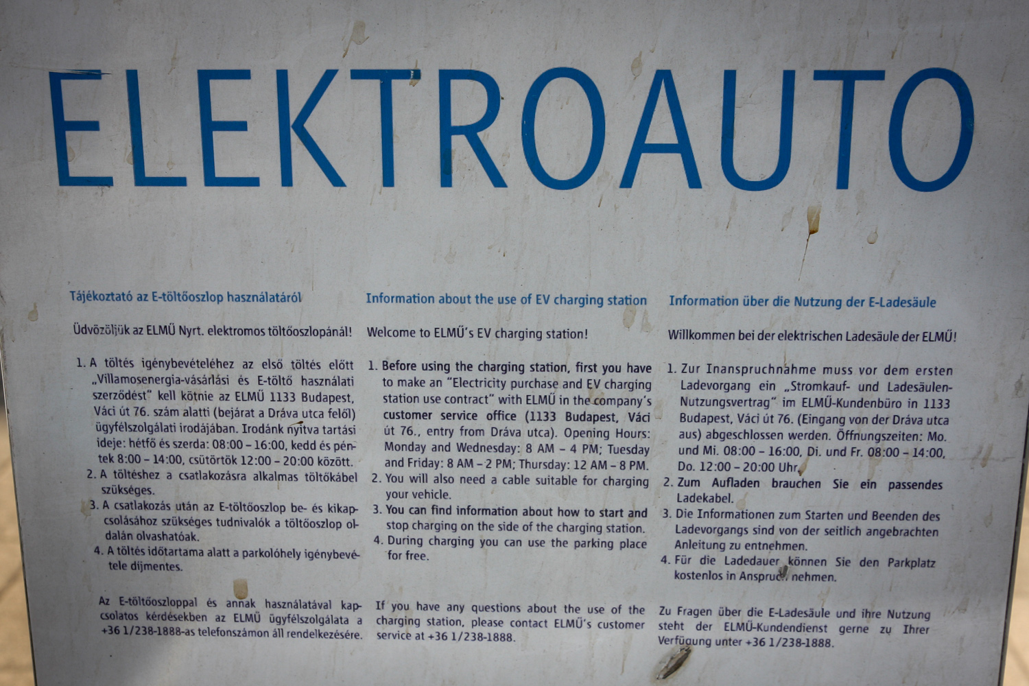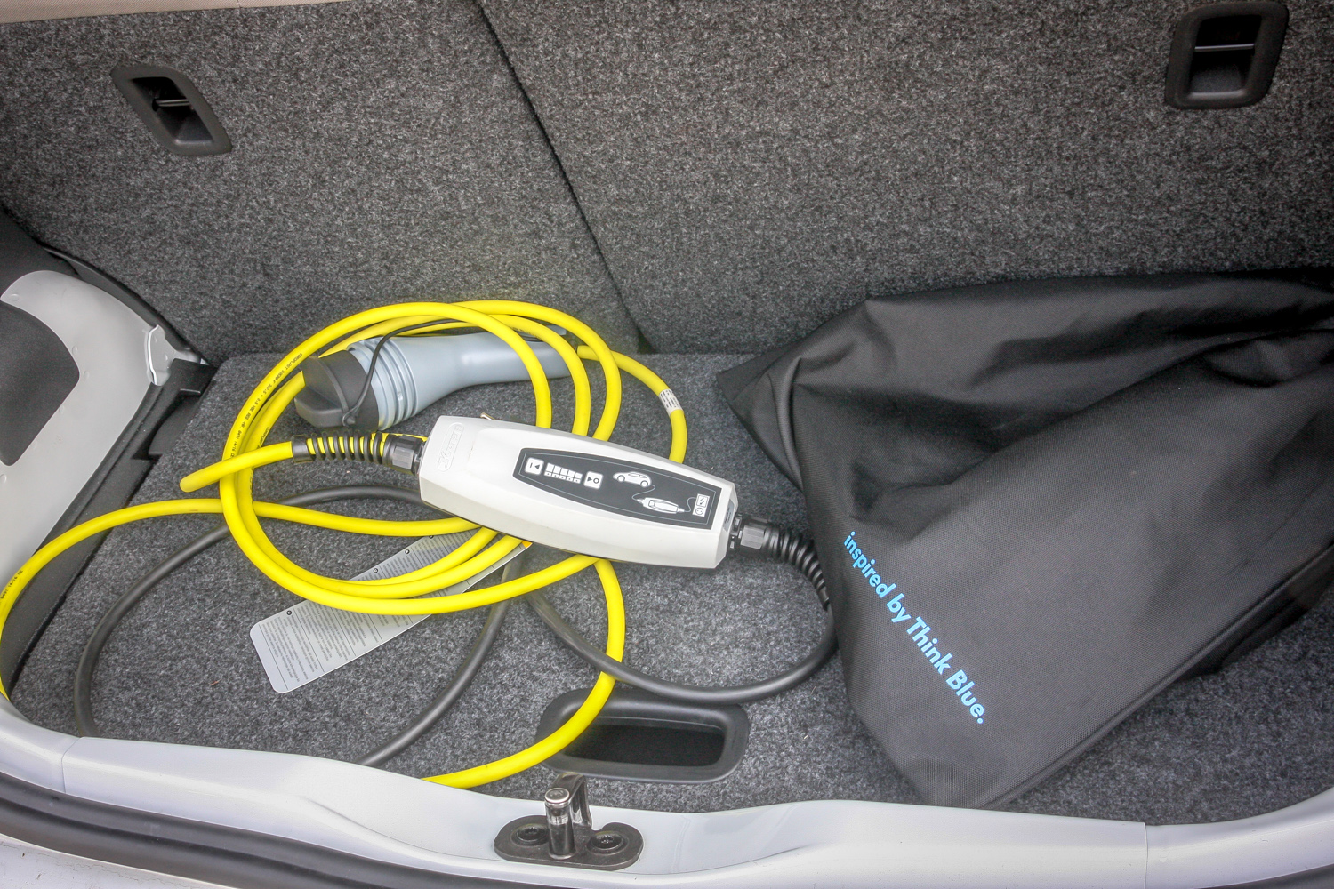 Nem volt szükségünk töltésre, csak modellezni akartuk az egyelőre, tudomásunk szerint az év végéig ingyenes "tankolást" a fővárosi ELMŰ székháznál. Elméletileg telefonálni kellett volna, hogy elinduljon a folyamat, de aztán hiphop, már jött is az áram. Utólag kiderült, hogy az oszlopon is feltüntetett tájékoztatás ellenére nem kell telefonálni és regisztrálni. Az autó csatlakozóihoz a távirányító nyitójára hosszan nyomva férünk, a rendszer abszolút biztonságos, ha valahol megszakítjuk a töltést, kizárólag az egyenáramot tároló akkumulátorban van áram. A központi zárral a csatlakozót is reteszeljük, idegen kezek nem vihetik el a kábelt