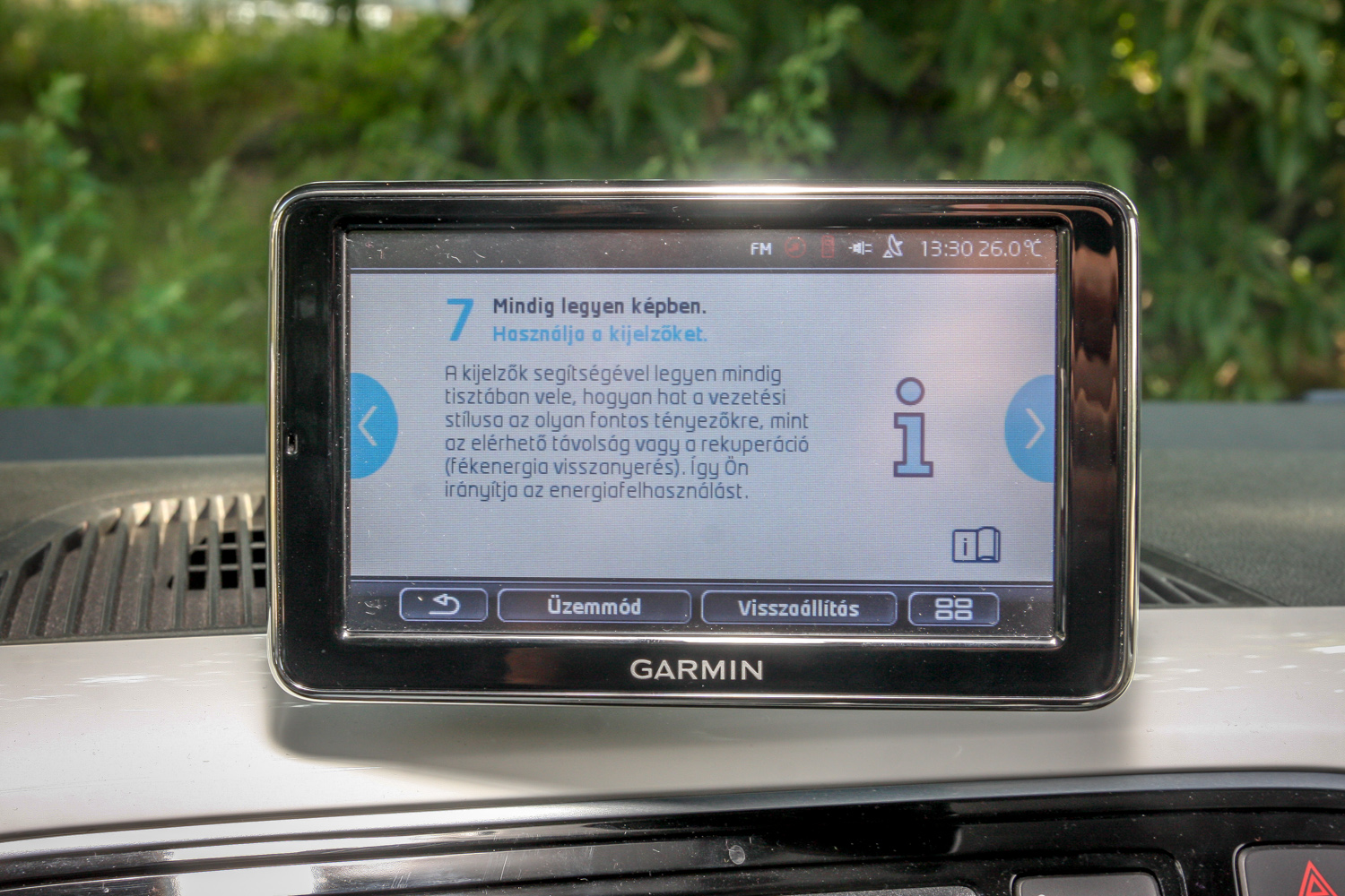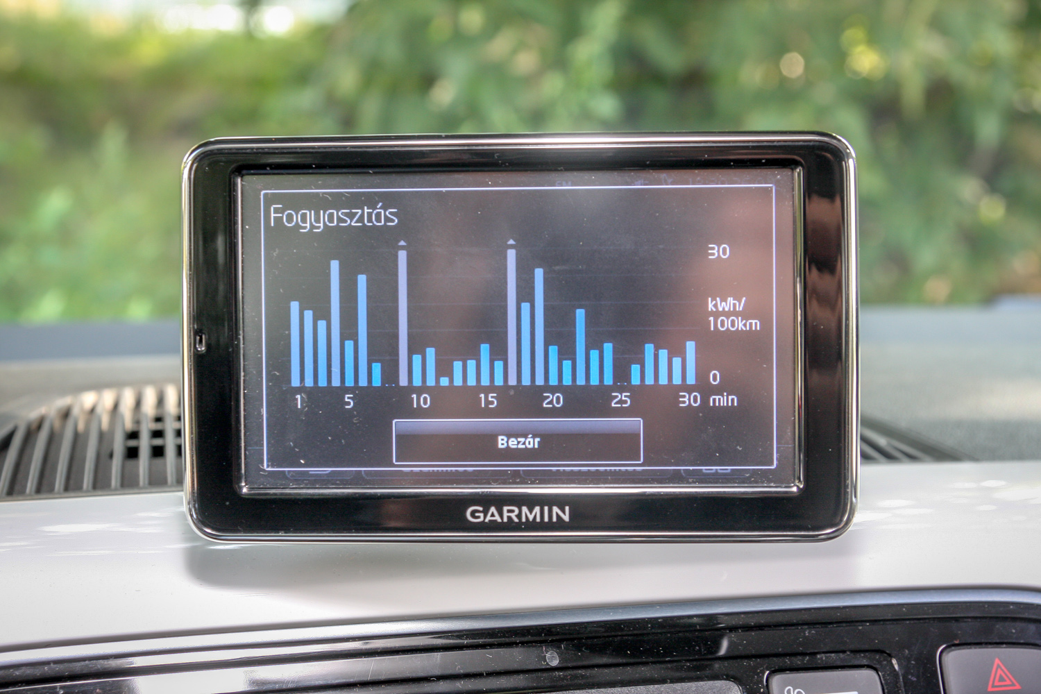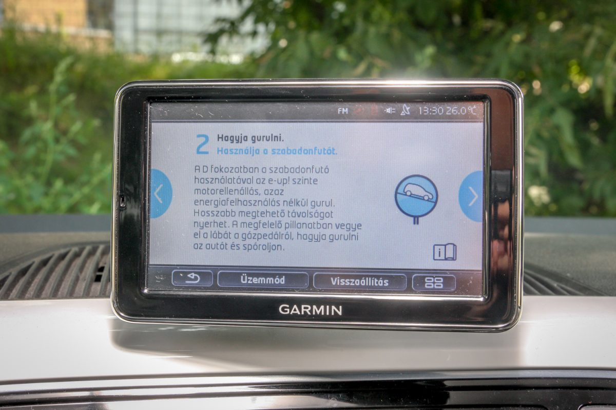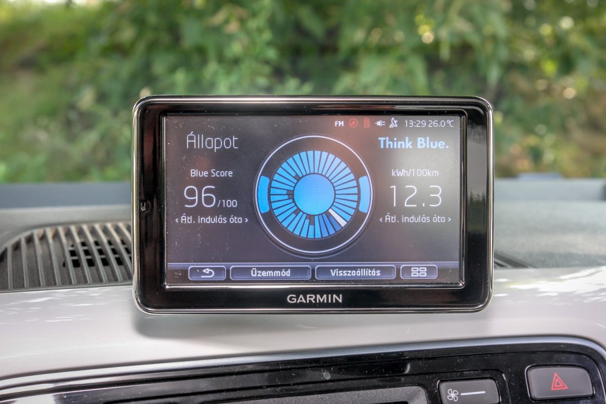 Think Blue. Légy kék, ami zöld, gondolkozz zölden, kéken, mindegy. A középkonzol fölött trónoló, navigációt, telefon-kihangosítót is adó Garmin-kütyü egy rakás ábrával, folyamatjelzéssel, szöveges tanácsokkal ügyködik azon, hogy minél kékebb/zöldebb legyél, de nem pofonoktól, hanem persze attól, hogy okosabban, előrelátóbban, nyugodtabban, s gyakorlatilag lassabban vezetsz, és ettől neked nagyon jó, mert tovább bírja az akksi, később, ritkábban kell újratöltened. És akkor még többet spórolsz. Az aktuális áram(lás)irányról is tájékoztató kijelző balra-jobbra, le-föl állítható, ki is vehető, viheted magaddal, de talán jobb is, ha kiveszed, s nem hagyod ott tolvajok prédájának.