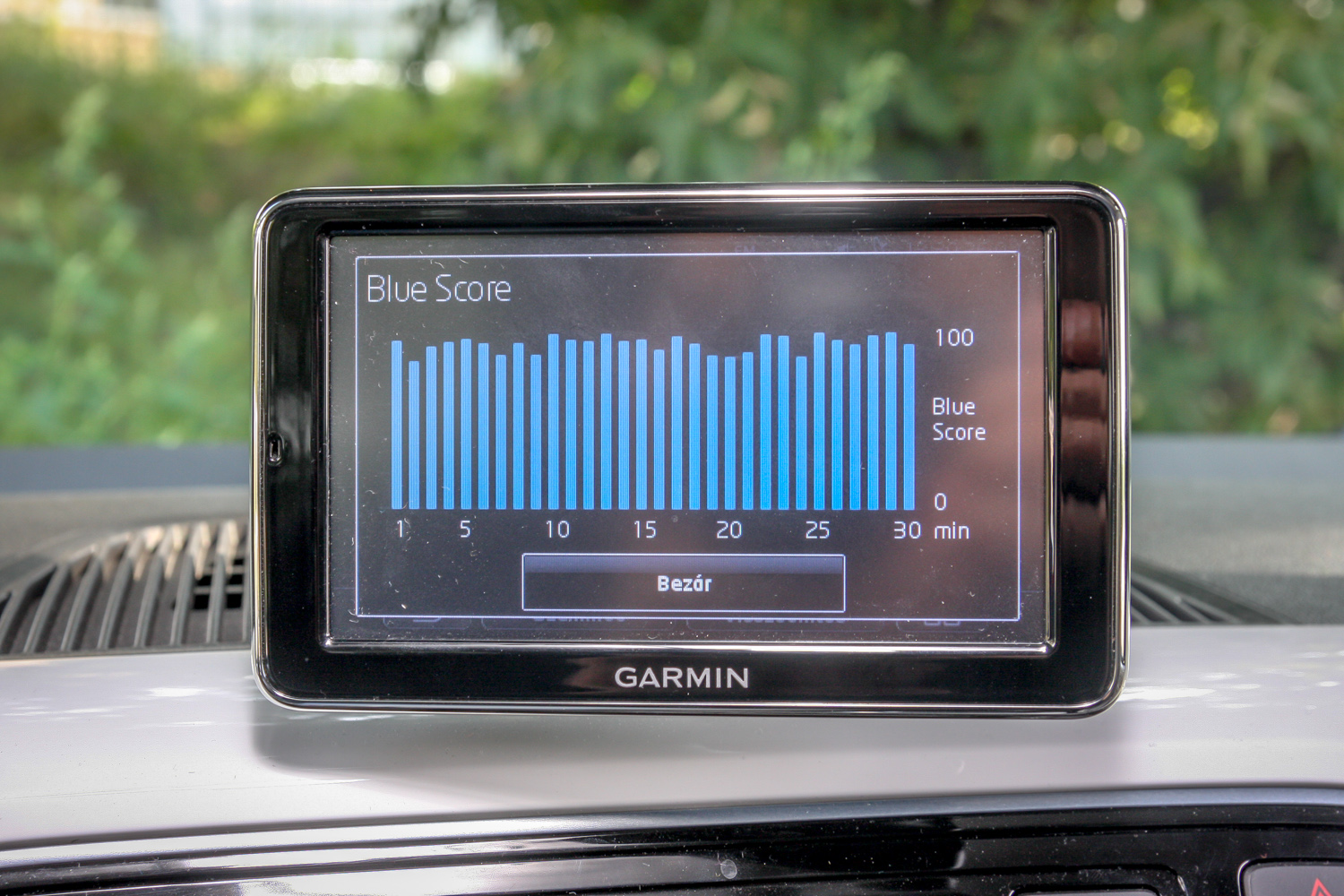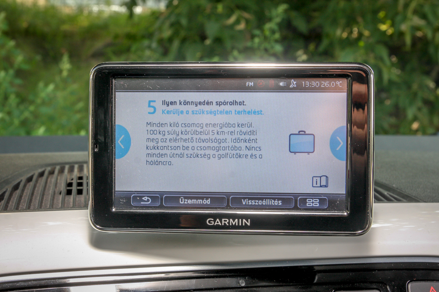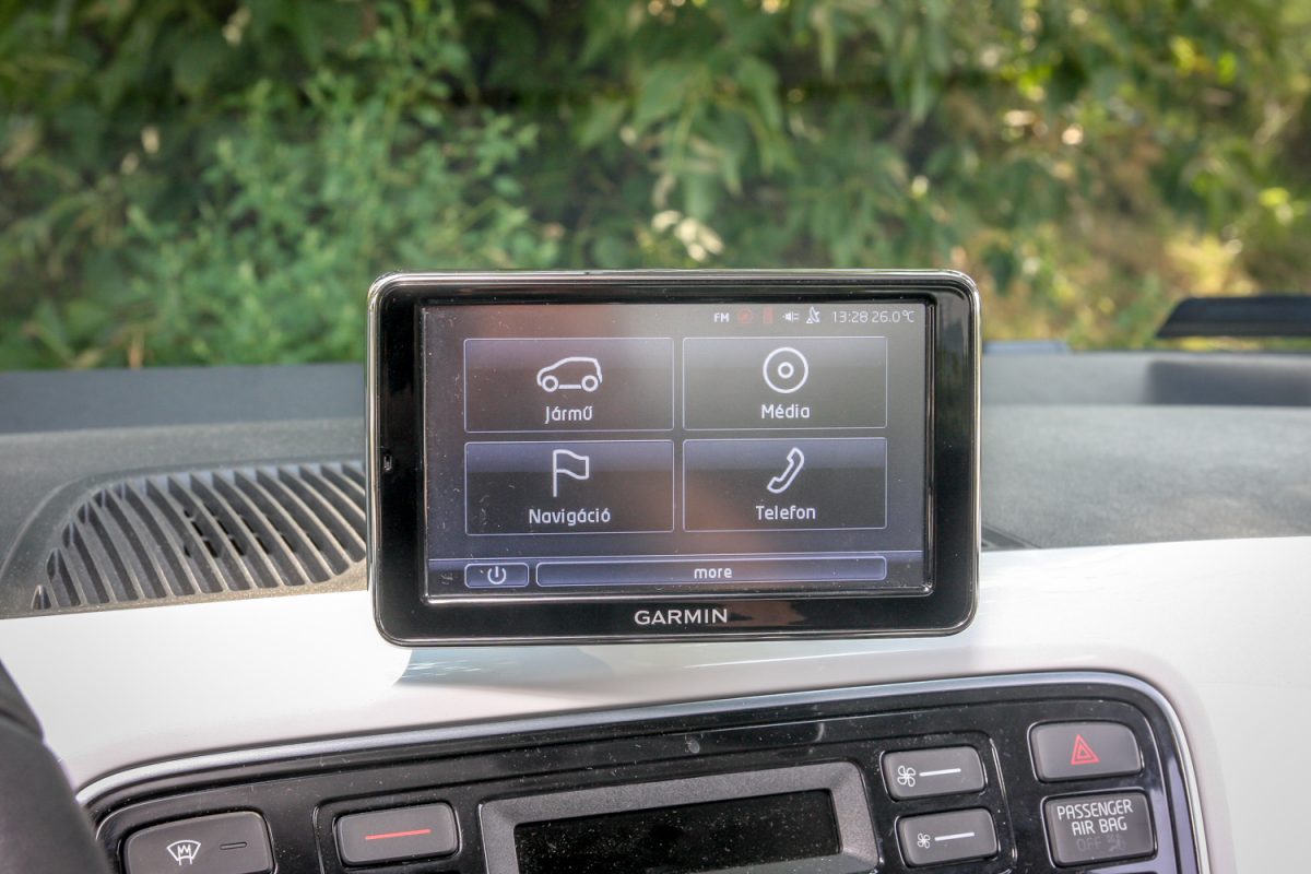Think Blue. Légy kék, ami zöld, gondolkozz zölden, kéken, mindegy. A középkonzol fölött trónoló, navigációt, telefon-kihangosítót is adó Garmin-kütyü egy rakás ábrával, folyamatjelzéssel, szöveges tanácsokkal ügyködik azon, hogy minél kékebb/zöldebb legyél, de nem pofonoktól, hanem persze attól, hogy okosabban, előrelátóbban, nyugodtabban, s gyakorlatilag lassabban vezetsz, és ettől neked nagyon jó, mert tovább bírja az akksi, később, ritkábban kell újratöltened. És akkor még többet spórolsz. Az aktuális áram(lás)irányról is tájékoztató kijelző balra-jobbra, le-föl állítható, ki is vehető, viheted magaddal, de talán jobb is, ha kiveszed, s nem hagyod ott tolvajok prédájának.