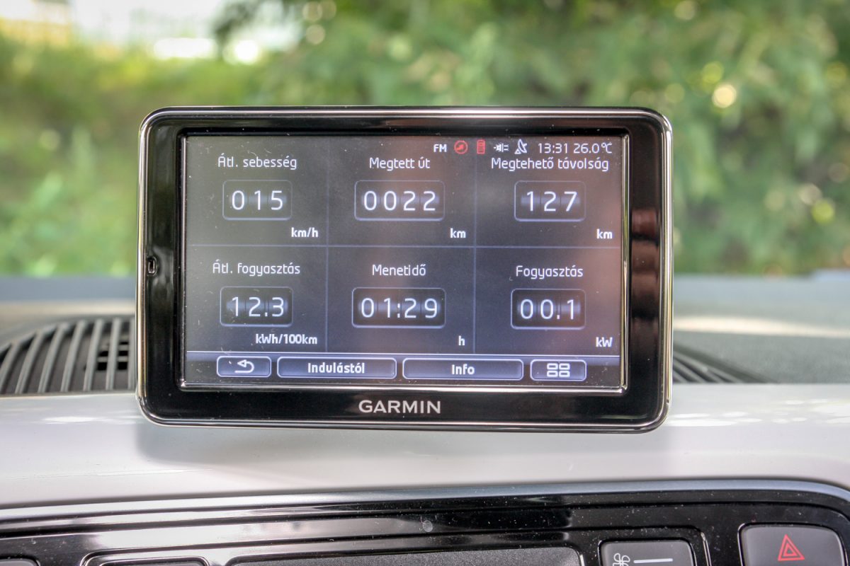 Jó-jó, de valójában mennyit bír? Az autót reggel úgy hoztuk el, hogy a megtehető táv valamivel több, mint 130 km volt. Aztán kóricáltunk vele Budapesten, országúton, néhány km-t sztrádán is hajtottuk ugye óra szerint 135-tel, a fotózás-forgatás során, de összességében egyáltalán nem koncentráltunk arra, hogy minél takarékosabbak legyünk. Nyomogattuk a klímát, az ülésfűtést, a szélvédőfűtést, tempomatoztunk is. Kormányzás? Korrekt. Rugózási komfort? Az is. Úttartás, stabilitás, kanyarjellemzők? Minden rendben. Menetzaj? Kicsit trolisan a motor felől alig valami, csak gumi és szél. S a tesztnap végén, 65 km után Normal módban 65, Eco + módban még 75 km-t írt ki a számítógép. A fogyasztásunk 11,5-13,5 kWh/100 km között alakult. Mi vaaaan?