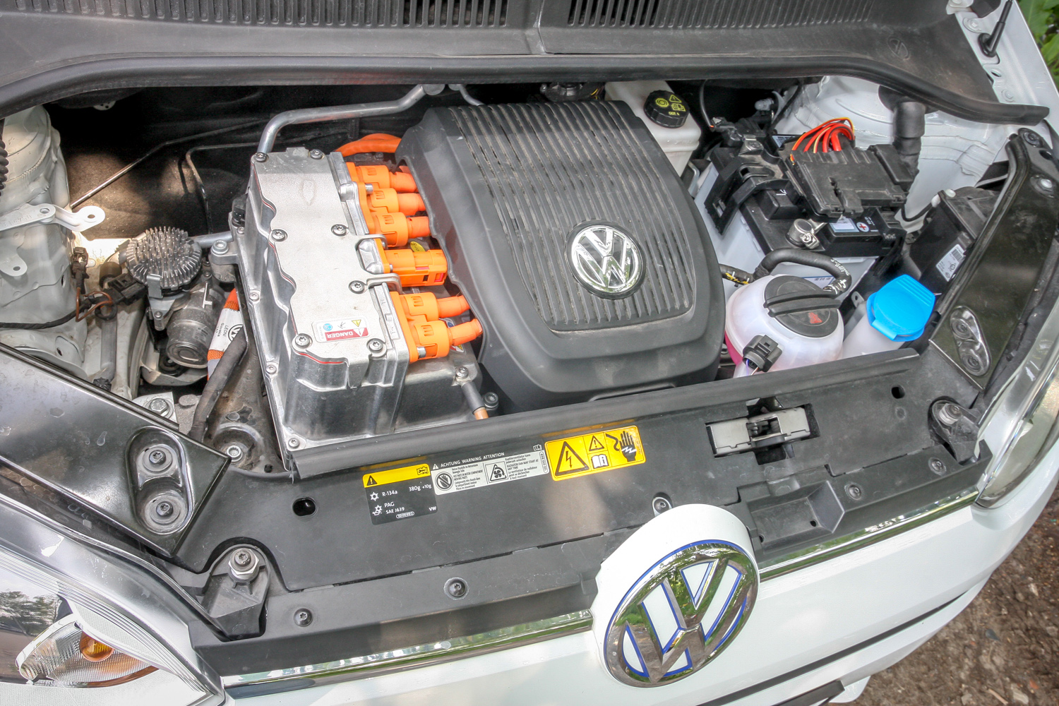 Felül takarásban a vezérlőelektronika, alul valahol a kis villanymotor kb. olyan súllyal, mint a benzinmotor. Az üresen 1,14 tonnás e-up! 230 kilóval nehezebb a sima up!-nál, ennyit nyom az akkumulátor. A lítium-ionos nagy, nem ez a rendes 12 V-os kicsi a világításra és satöbbire, ami jobbra látható. A nagyfeszültségű rész a narancssárga kábeleknél 374 V névleges feszültségű, gondosan szigetelt, mégsem ajánlatos fogdosni. Van hűtőfolyadék-kiegyenlítő tartály, hűtésre a vezérlőelektronikának és a villanymotornak van szüksége. Az akku nem igényel külön hűtést, mint a hibrideknél, mert sokkal nagyobb, s ugyanakkora áramkivétel nem okoz akkora melegedést. A hűtő meg ugyanolyan radiátorral van összekötve, mint a benzinesnél. Csak kisebb hűtőteljesítmény szükséges, ezért is minimális a légbeömlő a kocsi orrán. A géptetőt egyébiránt tán csak amiatt kell néha felnyitni, hogy pótoljuk az ablakmosót... A tesztkörön 65 km-t mentünk, leadáskor Eco + módban végül is még 75 km megtehető távolságot jelzett a computer