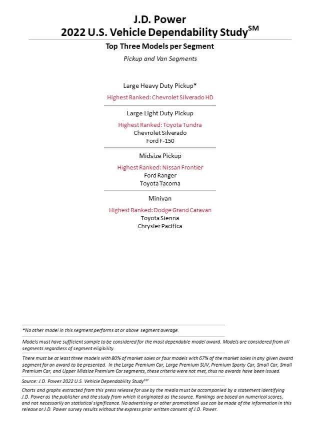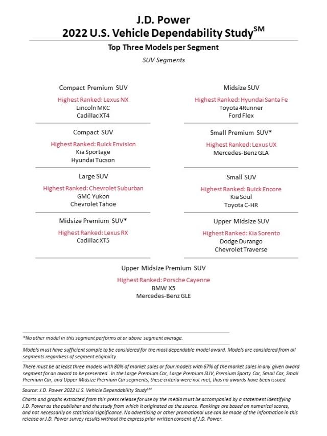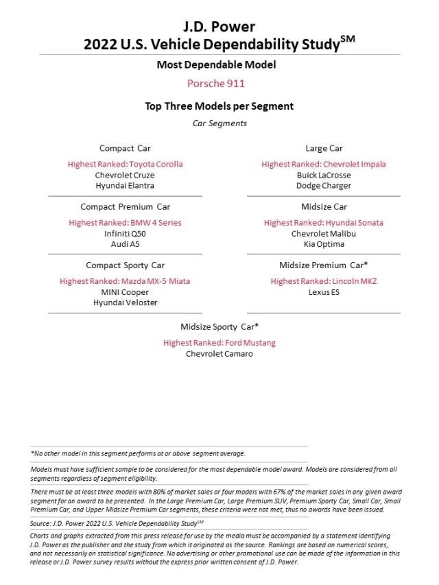 Viszont, ha modellekre bontva nézzük, akkor a legmegbízhatóbbnak a Porsche 911 bizonyult, immár második éve (100 autóra vetített átlagok alapján készül a végeredmény, szóval arra odafigyelnek, hogy a kisebb szériában készülő modellek „helyzeti előnye” ne nagyon torzítsa azt). Természetesen kategóriákra is lebontották a végső következtetéseket, így érdemes megemlíteni, hogy több Chevy modell is kategóriagyőztes lett, valamint saját kategóriájában élen végzett a Toyota Corolla és a Tundra, továbbá a Lexus NX, RX és UX is. További kategóriagyőztesek a BMW 4-es, a Mazda MX-5, a Lincoln MKZ, a Ford Mustang, a Porsche Cayenne, a Hyundai Santa Fe, a Hyundai Sonata és a Kia Sorento.