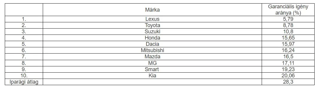 Az adatok szerint a Lexusok tulajdonosai nyújtják be a legkevesebb garanciális igényt: a márka hibaaránya mindössze 5,79%, az átlagos javítási költség pedig forintra átszámolva 278 ezer lenne. A második helyen a Toyota (8,78% és 188 000 Ft), a harmadikon a Suzuki (10,80% és 195 000 Ft) végzett. A fenti számokat érdemes kontextusba helyeznünk: a vizsgált 35 márka modelljeire benyújtott garanciaigény átlagos aránya 28,3 százalék, az átlagos javítási érték pedig 270 ezer forint. A Lexus modelljeivel kapcsolatban tehát mintegy ötször kevesebb garanciális igény érkezik a szervizekhez, de a Toyoták is az átlagosnál több mint háromszor kevesebb hibát produkálnak.