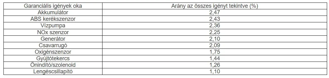 A WSG statisztikájából kiolvasható az is, hogy mely alkatrészekkel adódott a legtöbb probléma. A leggyakoribb hibát az akkumulátor jelentette, amelyek a garanciális igények 2,47%-át tették ki, ezt követték az ABS-érzékelők (2,43%) és a vízpumpa meghibásodásai (2,36%). A legköltségesebb javítások közé a dízel részecskeszűrők és a kormányműhibák tartoztak: előbbiek átlagos költsége 607, utóbbiaké 565 ezer forint volt.