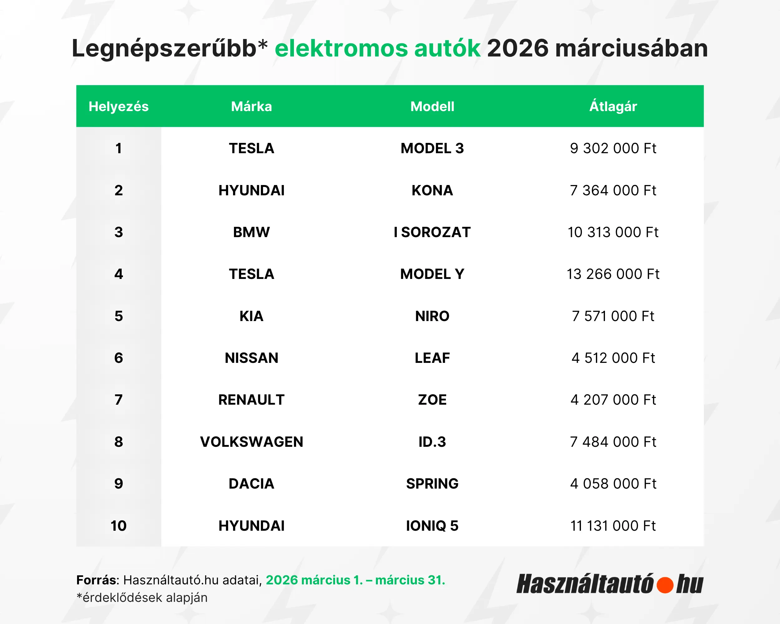A lista negyedik helyén a Tesla Model Y következik, majd a top 10-et a Kia Niro, a Nissan Leaf, a Renault Zoe, a Volkswagen ID.3, a Dacia Spring, illetve a Hyundai Ioniq 5 teszi teljessé. Átlagár szempontjából nem meglepő módon a román-francia márka aprósága a legelérhetőbb (4 058 000 Ft), míg a másik végletet a Model Y jelenti a mag 13 266 000 forintos átlagával.