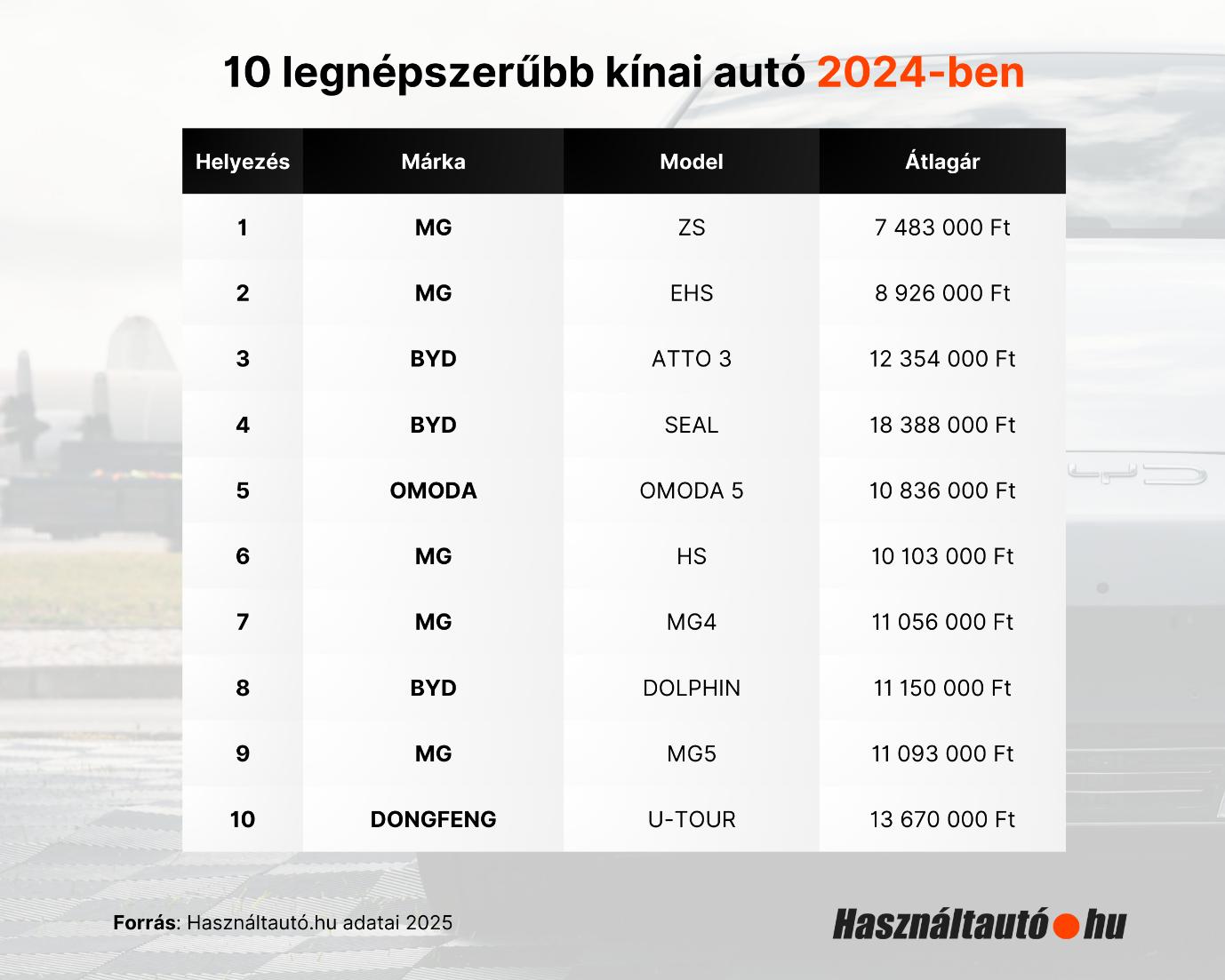 Nem meglepő módon, a már néhány éve magyarországi érdekeltséggel is rendelkező márkákra kerestek rá a legtöbben a Használtautó.hu felületén. 2023-ban és 2024-ben is az MG váltotta ki a legnagyobb érdeklődést a portálon, de a BYD is jelentőset ugrott előre. Előbbi márka a top 10-ben 5 típussal is képviselteti magát, míg utóbbi hárommal. Érdekesség, hogy az Omoda csupán tavaly jelent meg a hazai piacon, ám máris annyian érdeklődtek utána, hogy az 5. helyre kúszott fel az 5-ös Használtautó.hu ranglistáján. A legkeresettebb 10-et a Dongfeng U-Tour teszi teljessé. A közleményben a portál kiemelte, minden a listában szereplő márka átlagára csökkent, kivétel a Dongfeng.