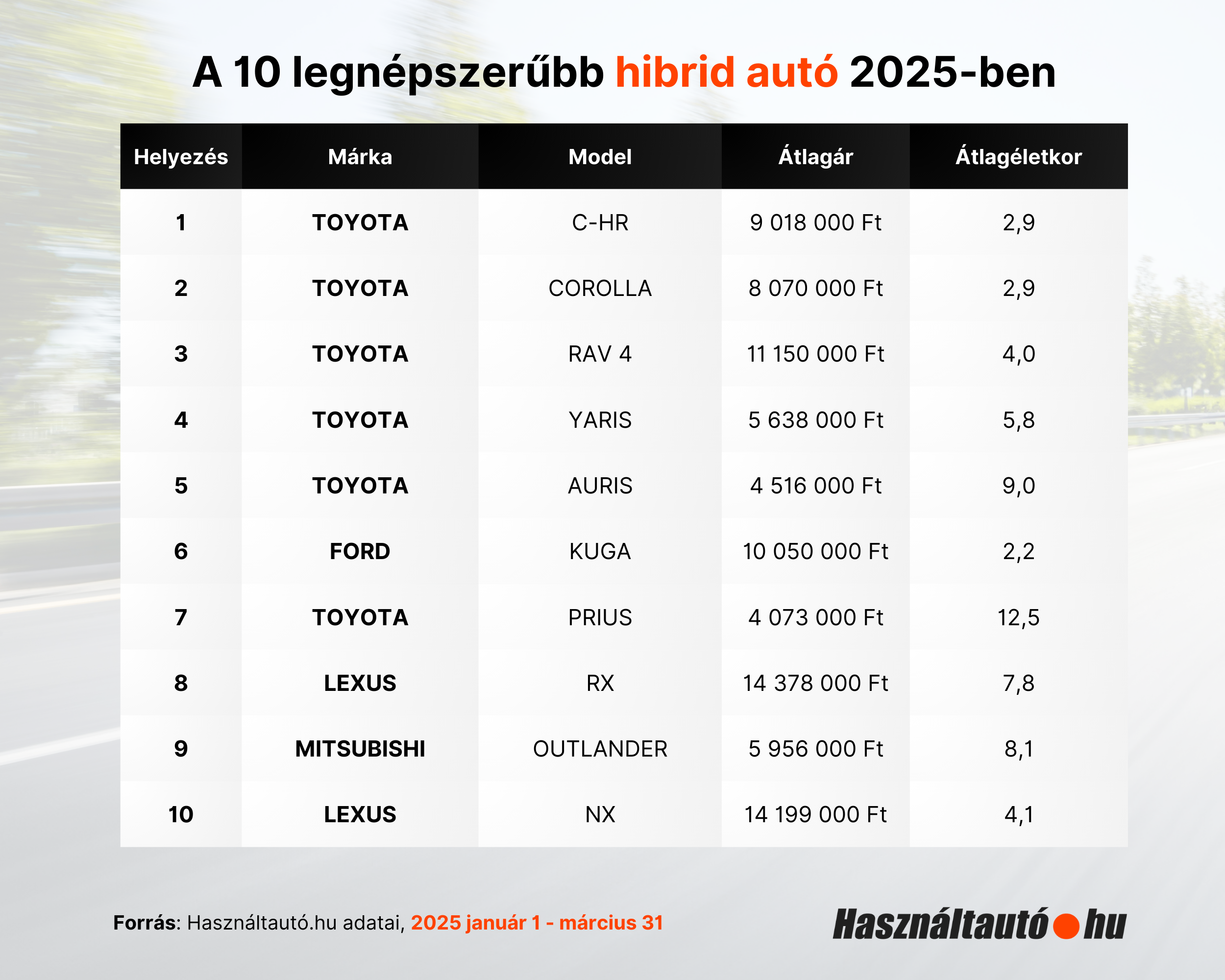 A magyar másodlagos piacon - legalábbis a Használtautó.hu felületén - a Toyotákat keresik a legtöbben. A top 10-ben 6 típuson is a japán márka emblémája figyel, de ha a teljes cégcsoportot nézzük, a Lexus modellekkel kiegészítve 8 helyet sajátítottak ki. A három legnépszerűbb autó a C-HR, a Corolla, valamint a RAV 4, míg az ötös listát a Yaris és az Auris teszi teljessé. Emellett a Prius szerepel még az összeállításban a Toyoták közül - érdekesség, hogy messze ennek a legmagasabb az átlagéletkora a maga 12,5 évével. A legkeresettebb tízesbe még a Ford Kuga, a Lexus RX és NX, valamint a Mitsubishi Outlander fért be.
