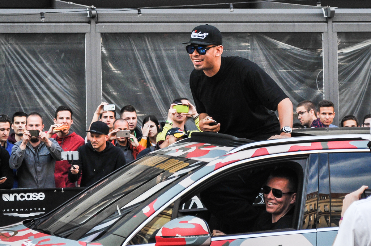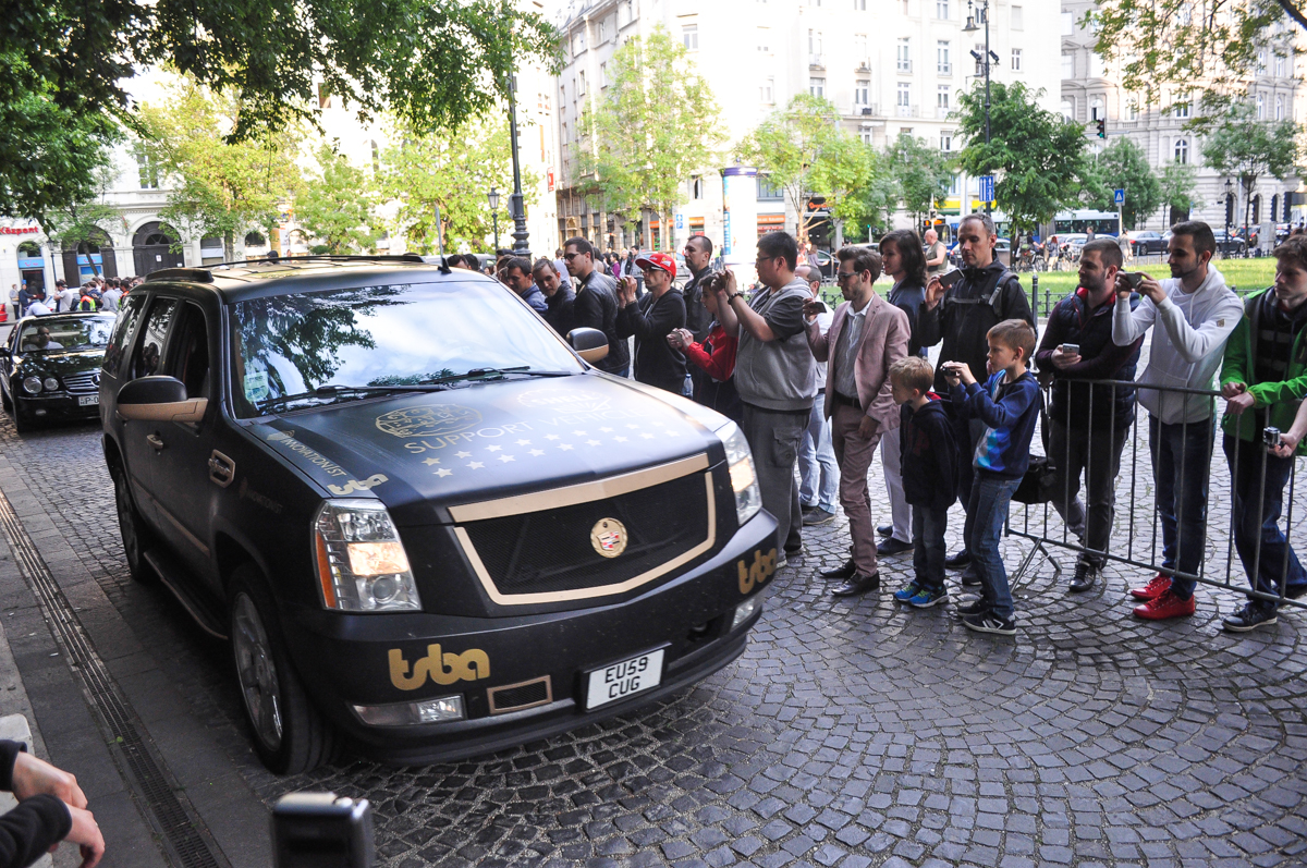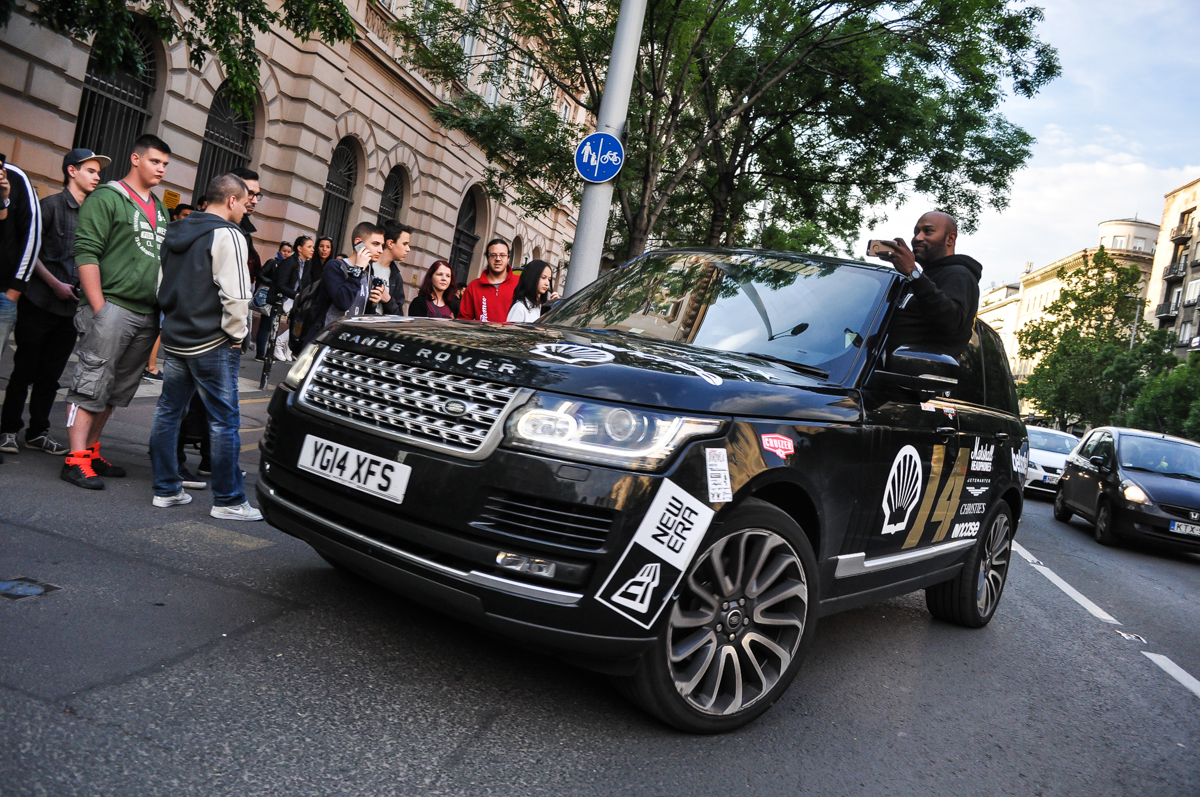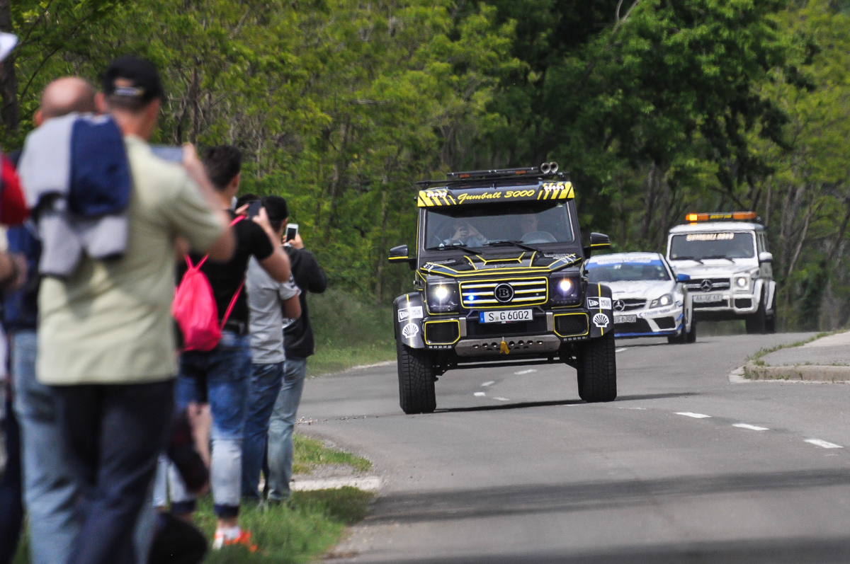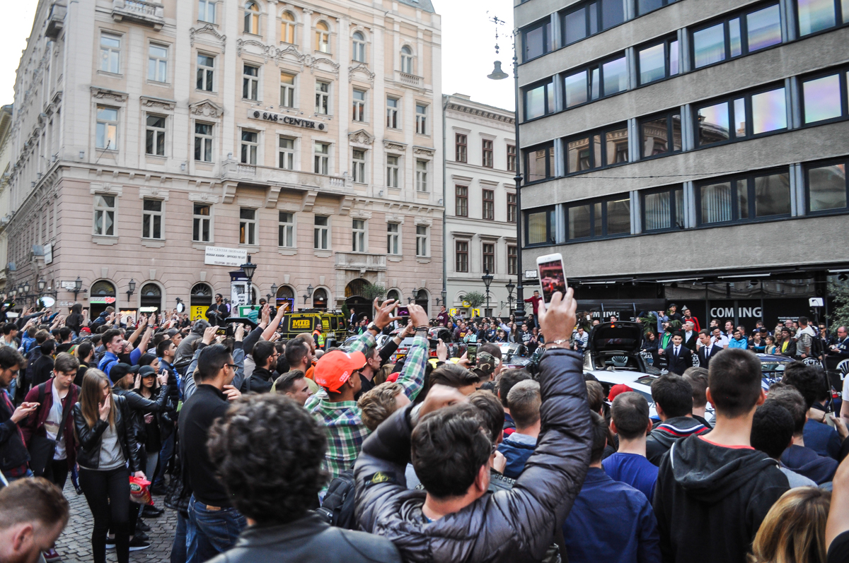 A jótékonyság és talán a verseny, egyébként abban merül ki náluk, hogy még a túra előtt adományokat utalnak a Gumball 3000 alapítványnak, és aki a legmagasabb összeget utalta, az indulhat elsőként – jelen esetben Dublinból. Az idei Gumball az ír fővárostól Bukarestig ment, mintegy 5000 kilométeren át, de úgy vettük észre, hogy senki sem megy időre, így versengés sincs nagyon. 10 év után álltak meg újra Budapesten a flúgos futam résztvevői, és hihetetlenül sok ember várta őket, akármerre jártak. Az utak mellett, a felüljárókon, ablakokban. Mielőtt a belvárosba érkeztek volna, tettek egy kitérőt a Hungaroringen is, ahol már rengeteg néző volt, ők pedig ezt nagyon élvezték. Később a főváros felé vették az irányt, ahová akkora bulival érkeztek, mint még senki sem szerintem. Szólt a zene, lányok táncoltak a Lambókon, konfettit lőttek a fákra egy Mercedes-Benz 280SE-ből, és a pólóosztogatásnál megbolondultak az emberek. Sőt, még iPhone-t is osztogattak… Igen, iPhone-t!