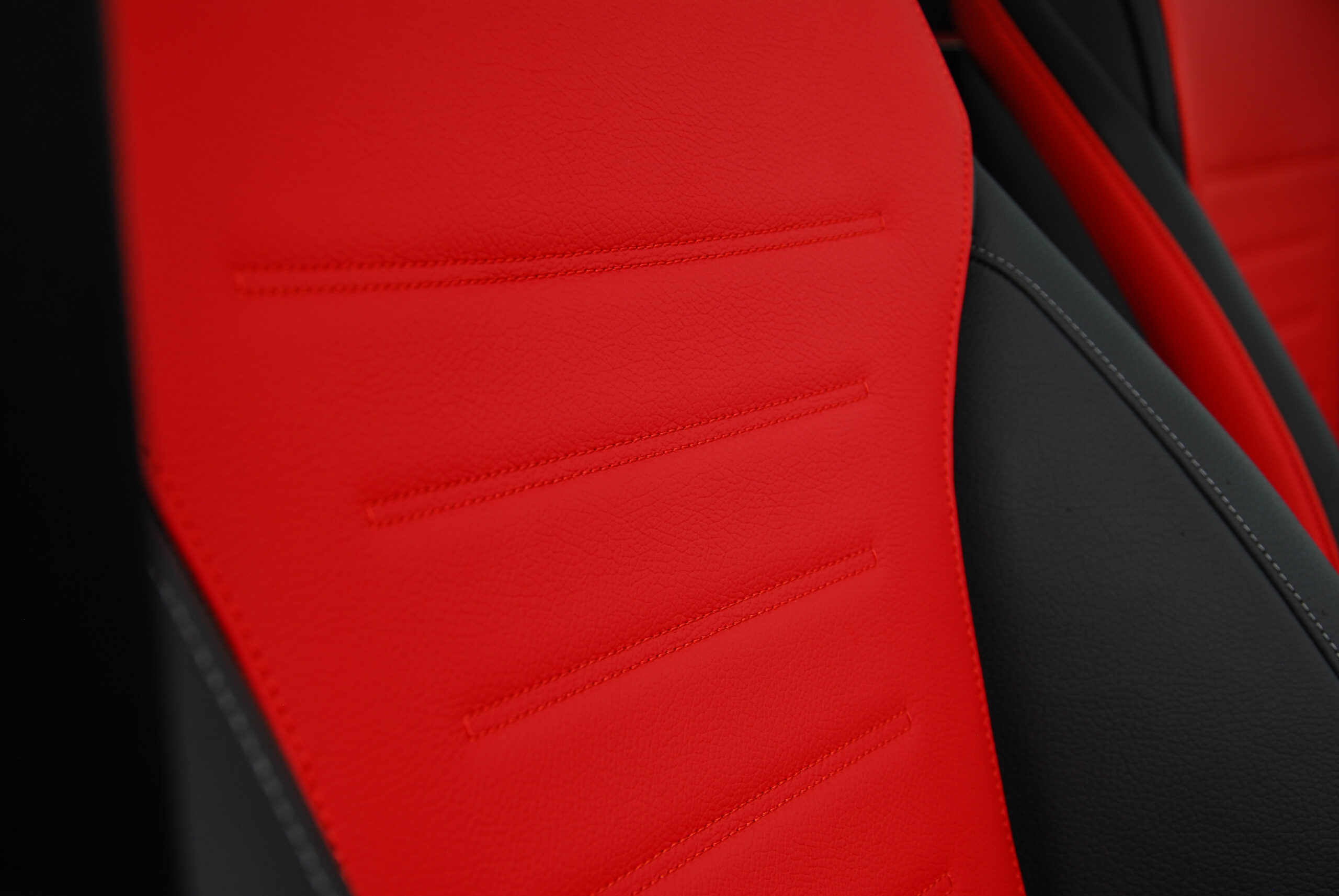 Az ülések remek anyagból készültek, ezt a vörös bőrbelsős tesztautó még némi extra látvánnyal is megfejelte