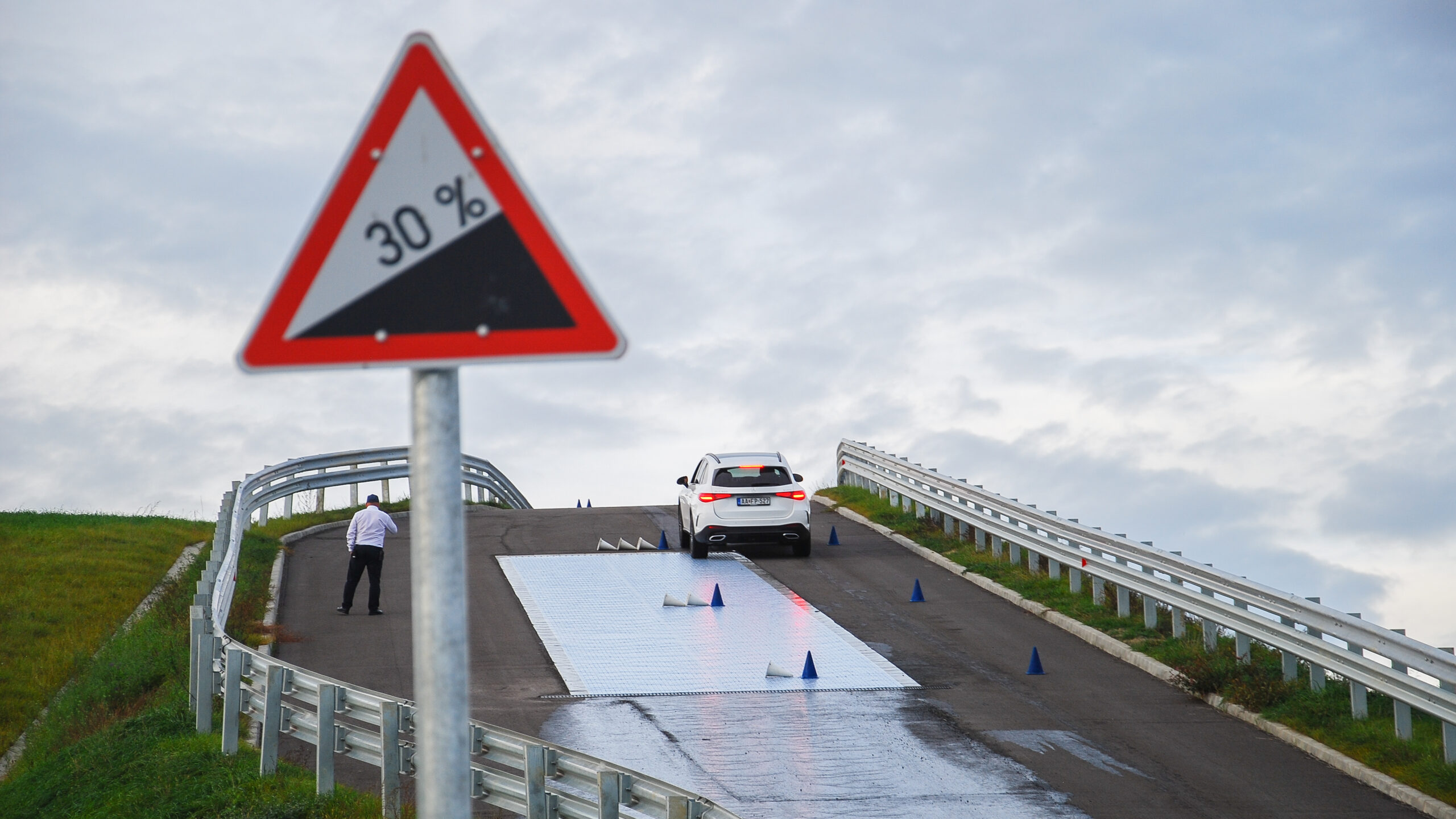 Mintha tükörjégen állnál, olyan csúszós az a világoskék, vizes kerámia, ráadásul egy 30 százalékos emelkedőre tették. Vajon el tud indulni a GLC úgy, hogy két kereke ezen a felületen állt meg?