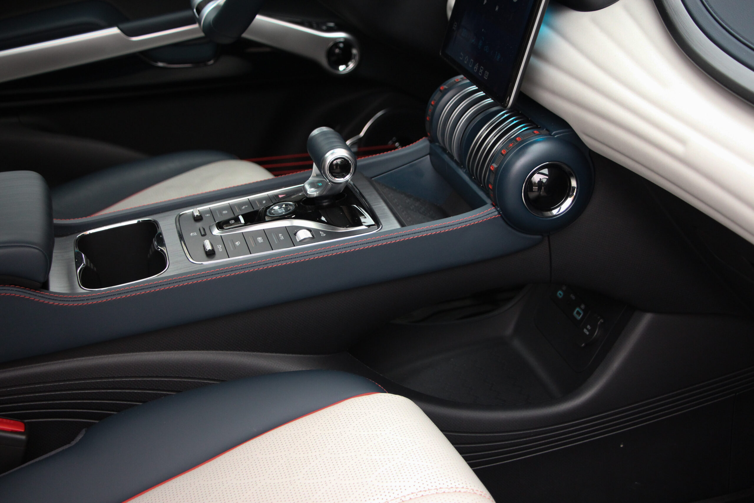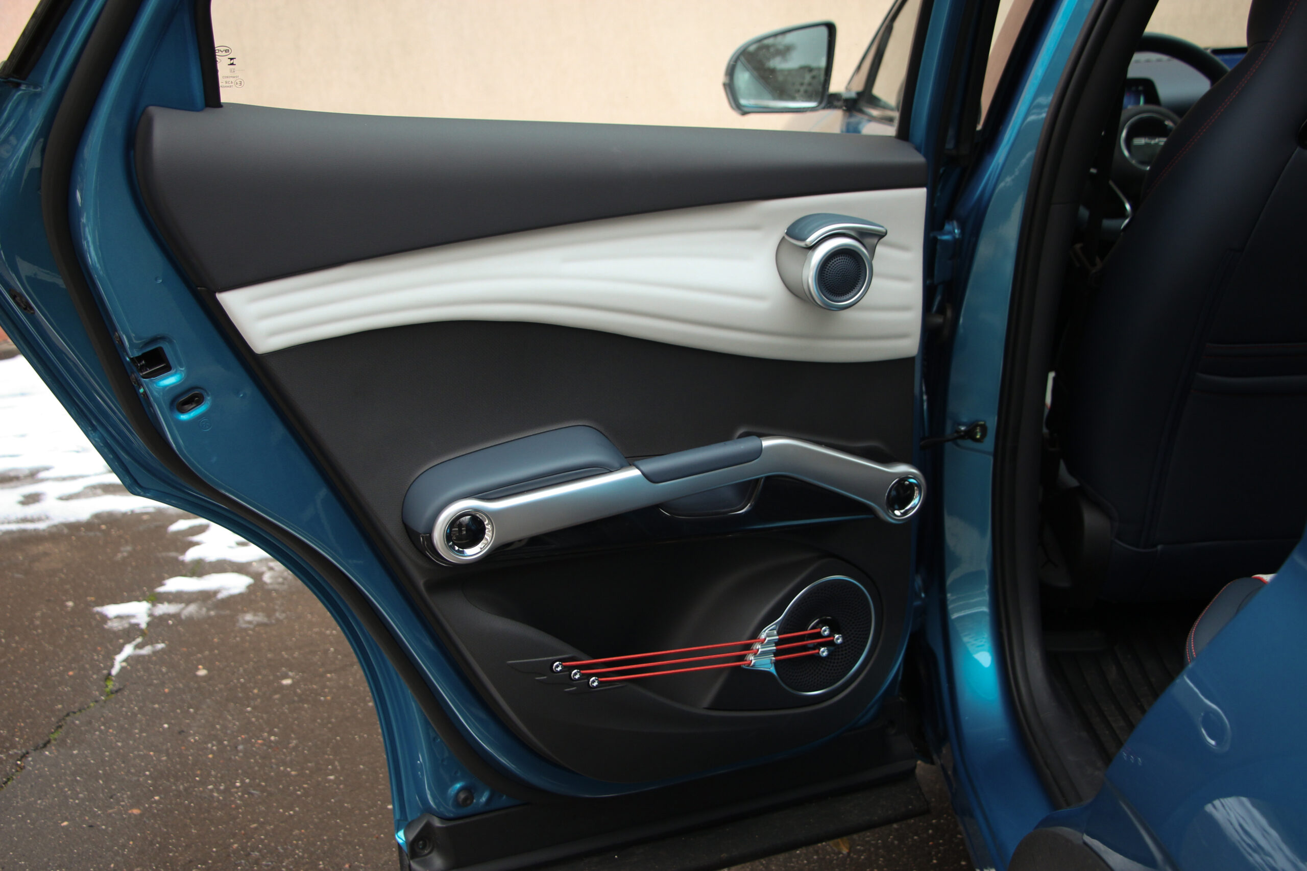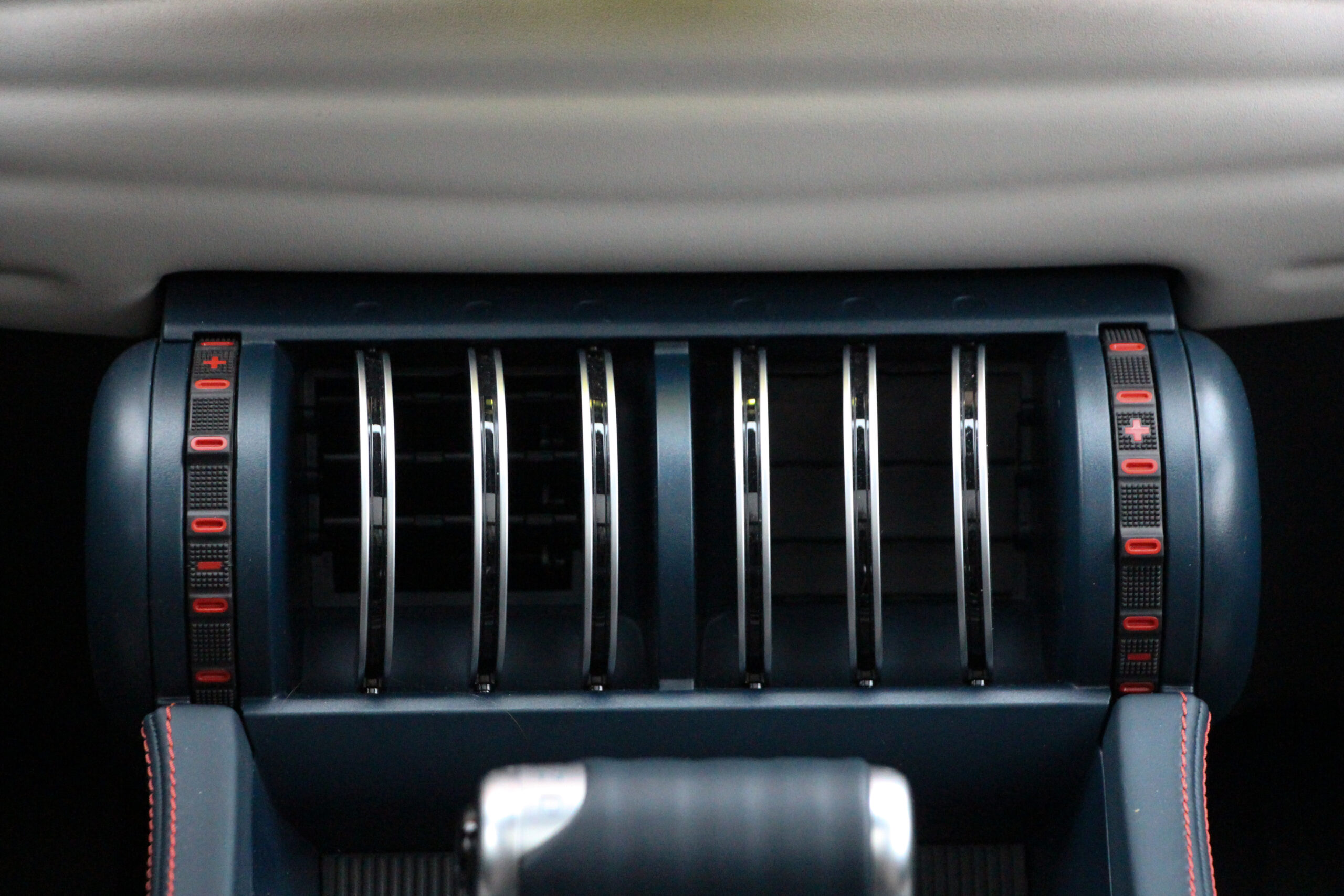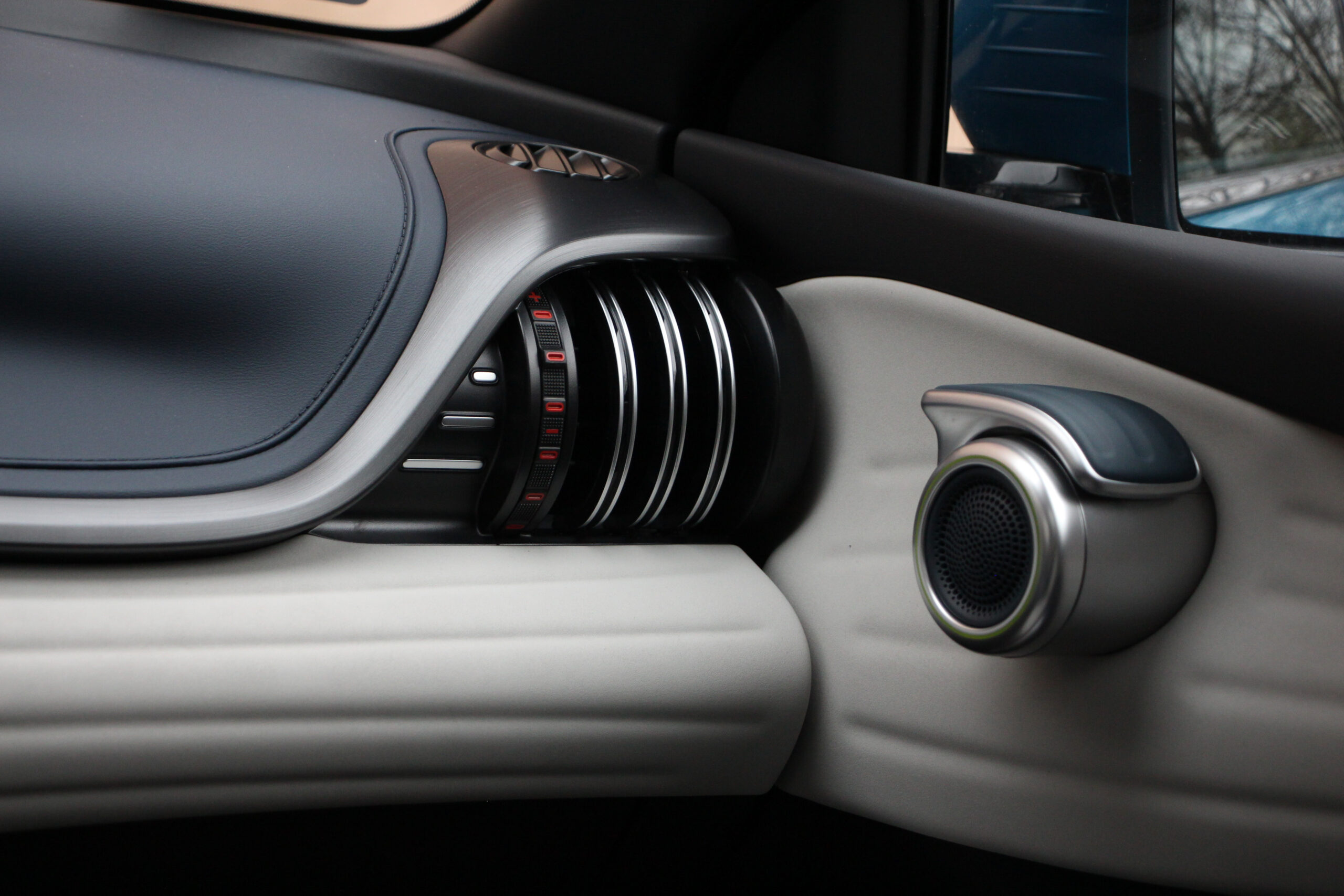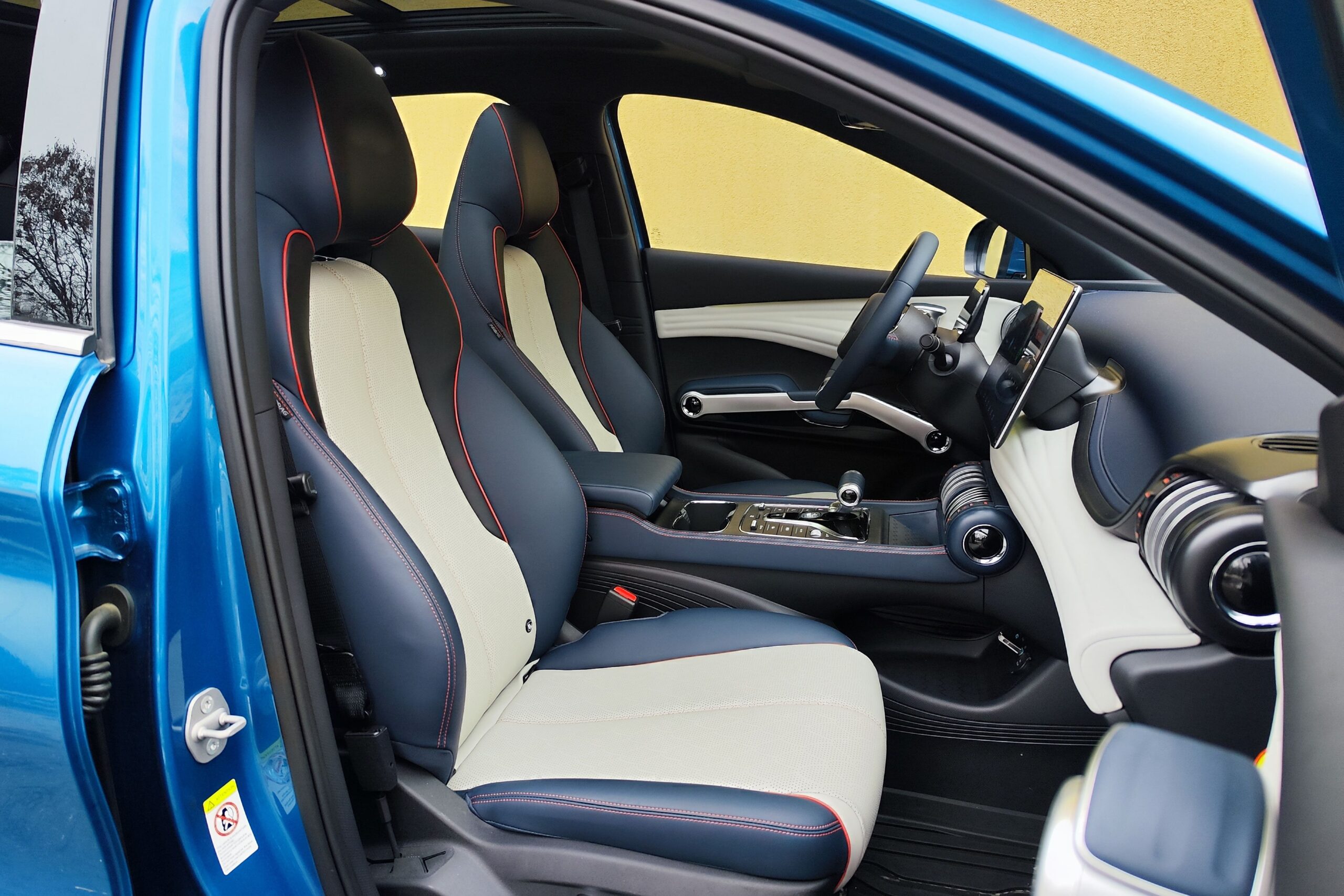 Az igazi tűzijáték bent vár, leginkább erre gondolva írtam, hogy régen láttam ennyire fantáziadús autót. Érdekes, izgalmas formák, színek, emellett kellemes anyagok és eközben minden teljesen logikus, könnyen megszokható. Állítólag az edzőtermek világából merítettek a tervezők, ezért például a szellőzőnyílások a súlytárcsákra utalnak, a kartámasz futópadra, a váltó pedig gömbsúlyzó karjára hasonlít. A tesztautóban sötétkék és fehér (vajszínű?) burkolatok váltották egymást, néhol ezüsttel fűszerezve, és ehhez vörös cérna társult a varrásoknál. Lehet, hogy elsőre ez túltoltnak tűnik, ám számomra nem tűnt annak, mivel ügyeltek a megfelelő arányokra.