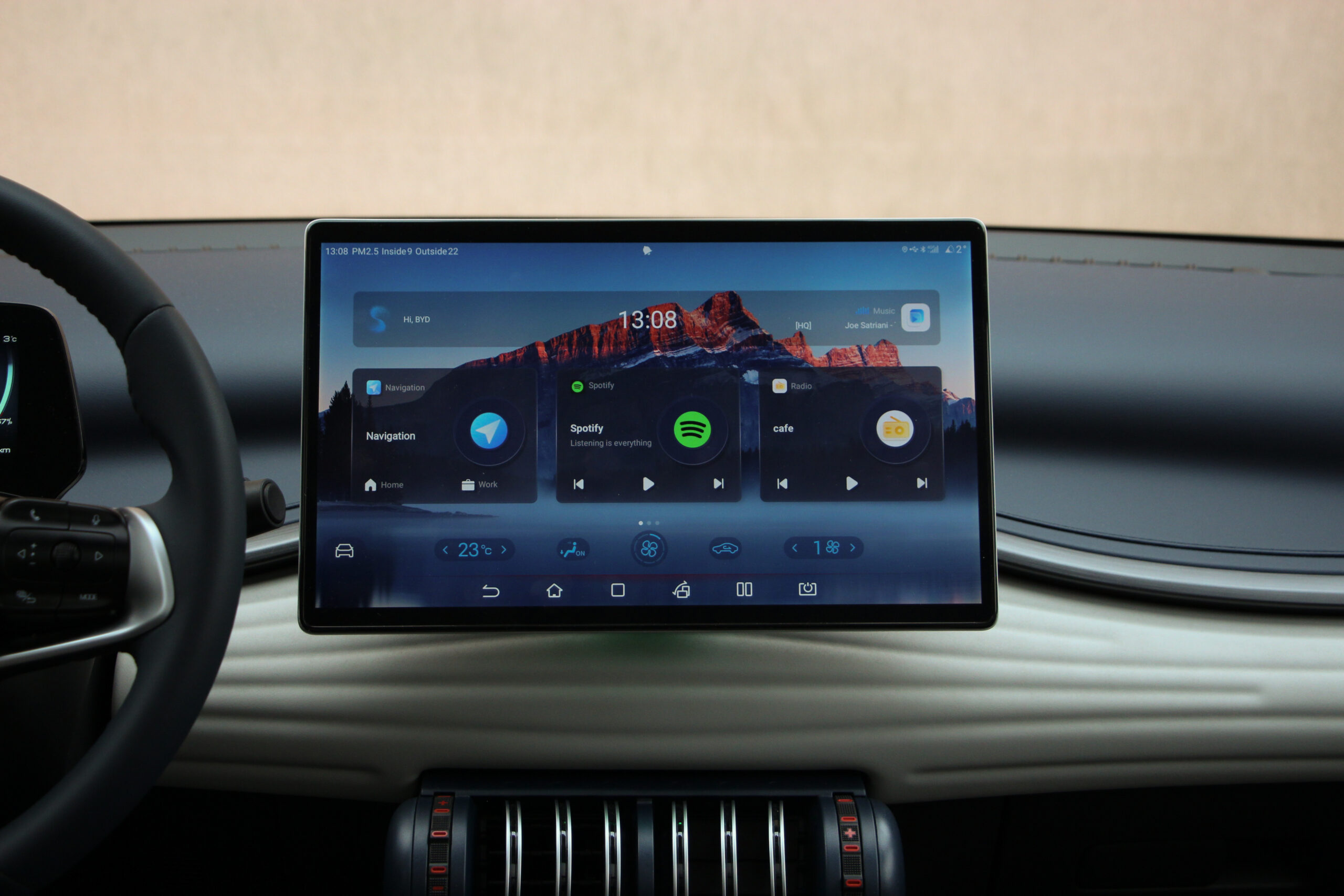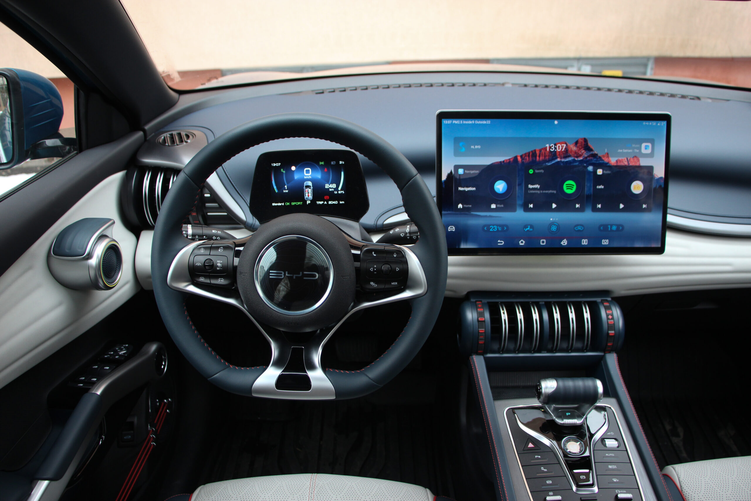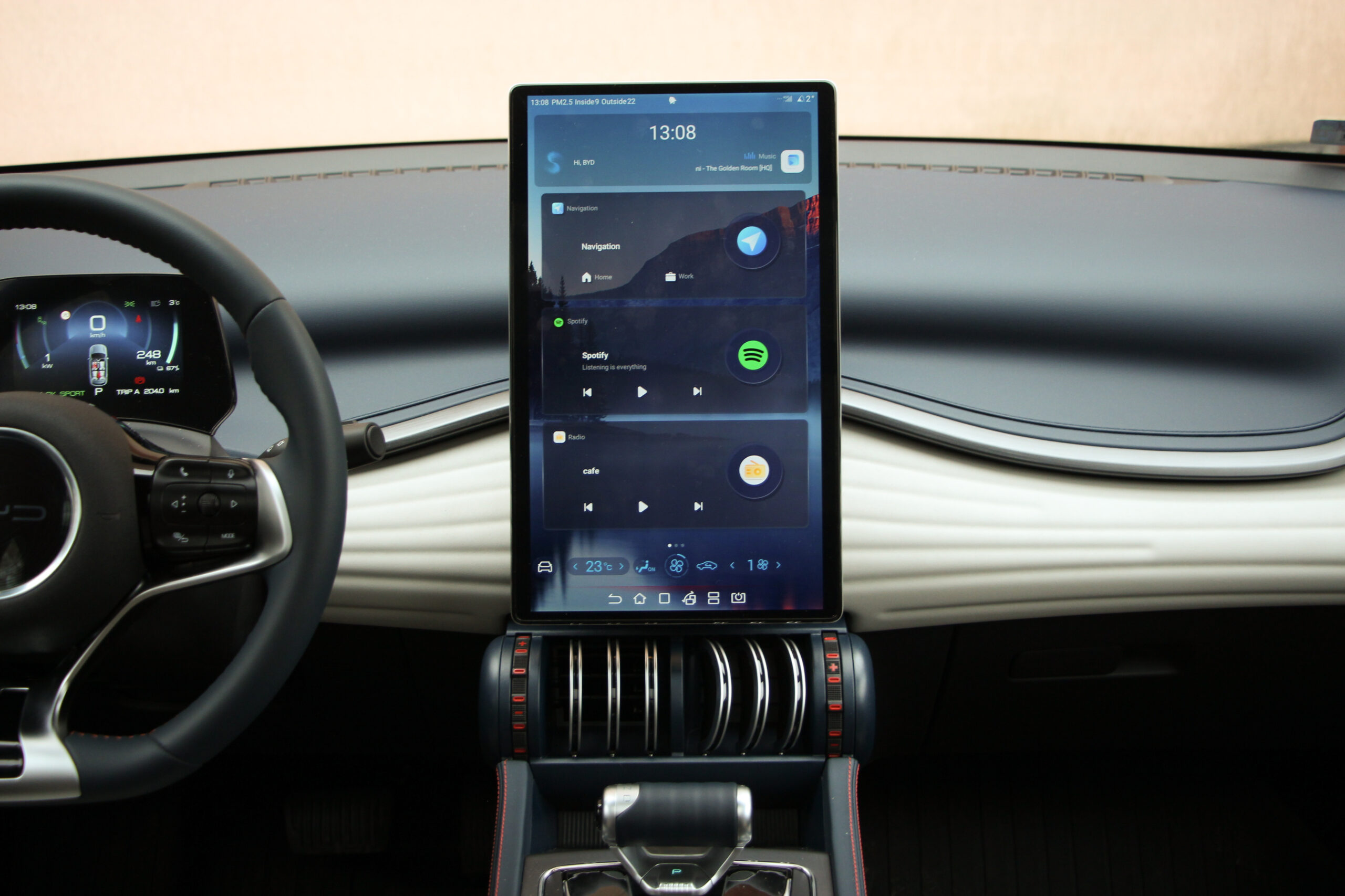 Személyes kedvencem a rögtönzött kis „gitár” az ajtóburkolatokon. Ugyanis a térképzsebeket nem szimplán műanyagból öntötték, oldalfaluk három húrként funkcionáló madzag, amik valóban be is voltak hangolva. De itt még nincs vége a fantáziadús ötleteknek, hiszen hasznosabbakkal is találkozni. Például régóta megy a vita a környezetemben, hogy melyik érintőképernyő a jobb megoldás: az álló, vagy a fekvő? Miért ne lehetne mindkettő? – tették fel a kérdést a BYD-nél, aztán meg is válaszolták. A háromküllős, multifunkciós kormánykeréken megnyomva egy gombot elfordul a 15,6 colos érintőképernyő, így mindenki a saját ízlésének megfelelően használhatja (szerintem egyébként a fekvő a jobb).