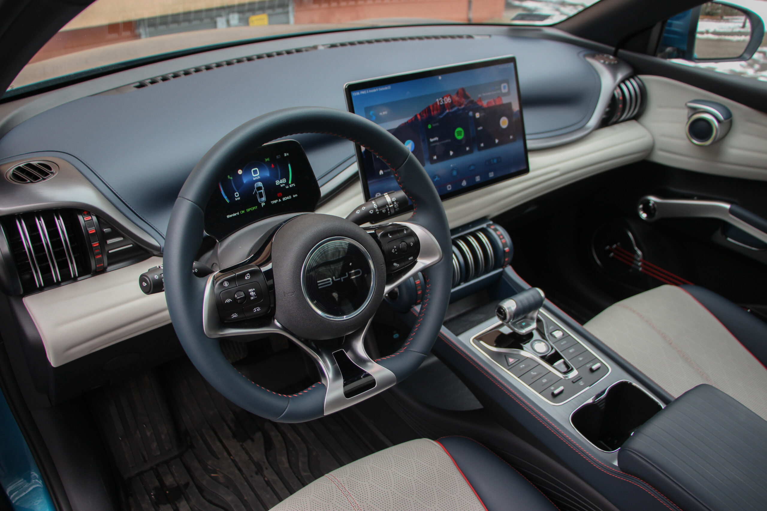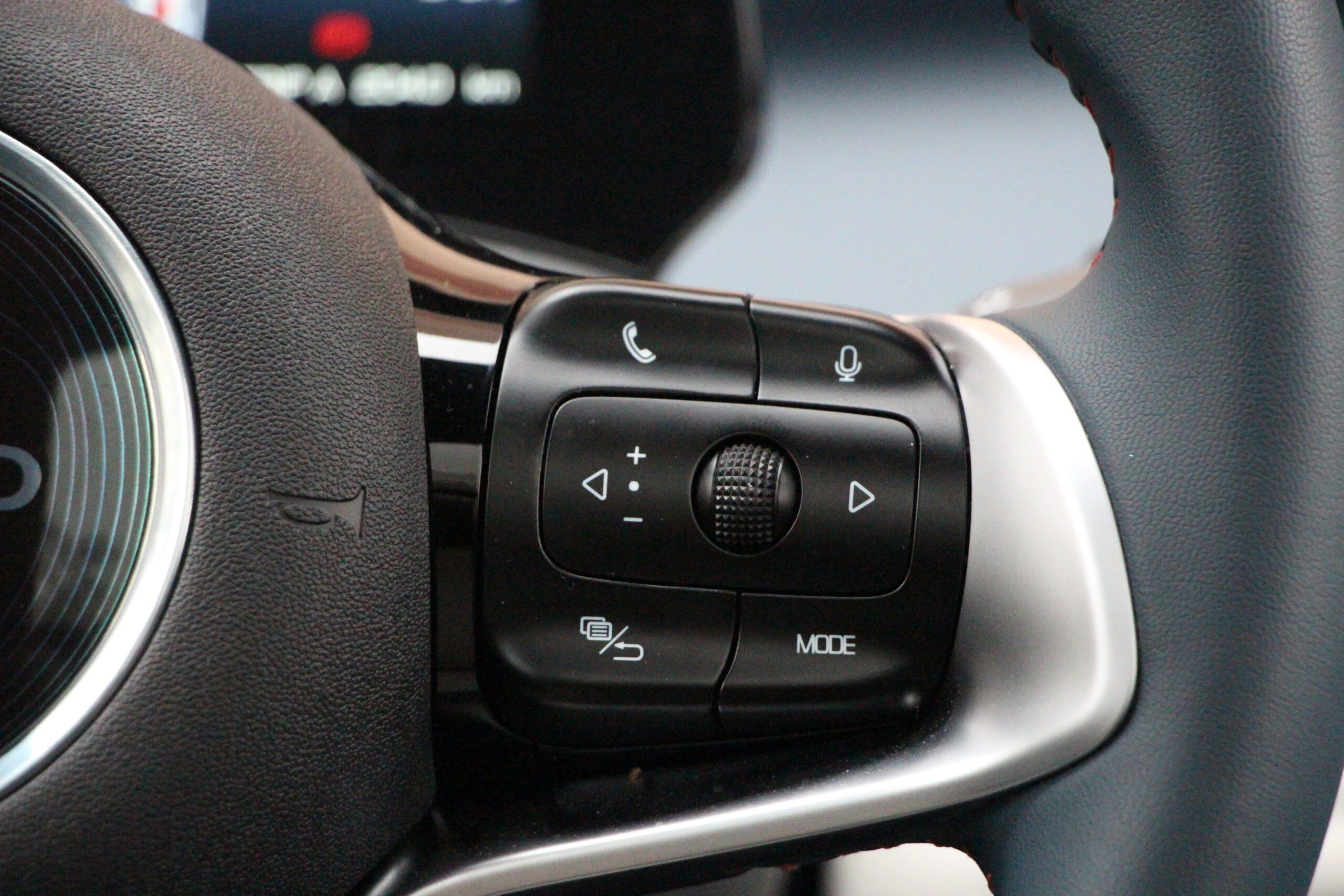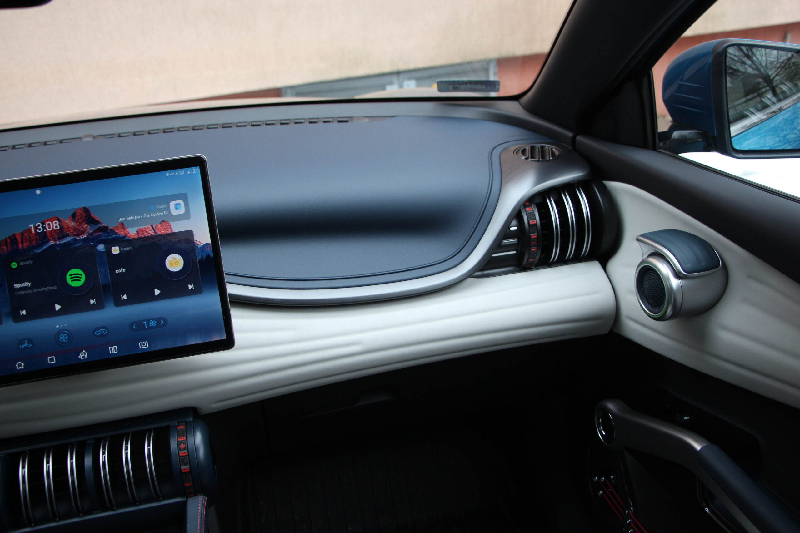 Személyes kedvencem a rögtönzött kis „gitár” az ajtóburkolatokon. Ugyanis a térképzsebeket nem szimplán műanyagból öntötték, oldalfaluk három húrként funkcionáló madzag, amik valóban be is voltak hangolva. De itt még nincs vége a fantáziadús ötleteknek, hiszen hasznosabbakkal is találkozni. Például régóta megy a vita a környezetemben, hogy melyik érintőképernyő a jobb megoldás: az álló, vagy a fekvő? Miért ne lehetne mindkettő? – tették fel a kérdést a BYD-nél, aztán meg is válaszolták. A háromküllős, multifunkciós kormánykeréken megnyomva egy gombot elfordul a 15,6 colos érintőképernyő, így mindenki a saját ízlésének megfelelően használhatja (szerintem egyébként a fekvő a jobb).
