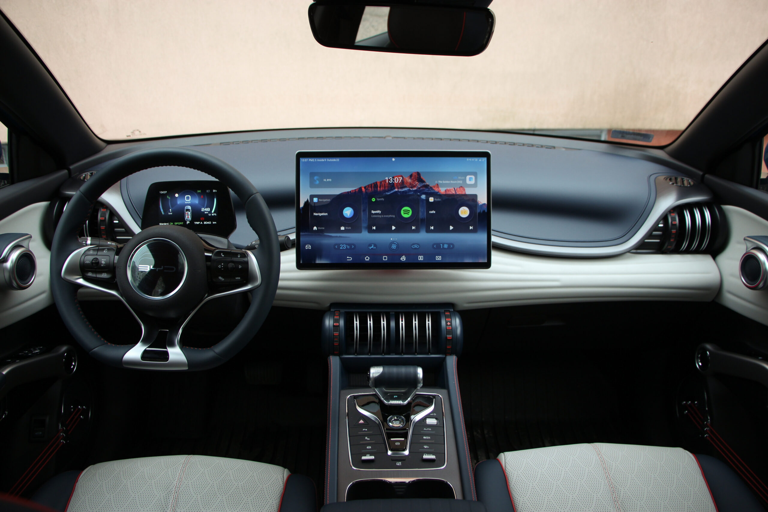 Ezen a DiLink 4.0 nevű rendszer fut, amelynek kezelése mint a mobiltelefonoké, szóval senkit nem fog zavarba hozni. Vezeték nélkül frissül, alapáron kínálja a felhő-alapú navigációt és még hangvezérlést is tud, igaz egyelőre csak angolul. Természetesen Apple CarPlay és Android Auto kompatibilis, utóbbi nálam gond nélkül működött. Alapáron jár a kormányszerkezetre felszerelt digitális műszeregység is, ami így mindig jól látható pozícióban marad, de nem feledkeztek meg a vezeték nélküli telefontöltőről sem, illetve a 8 hangszórós hifi is remekül szól, ráadásul a belső hangulatvilágítás a zene ritmusára változik.