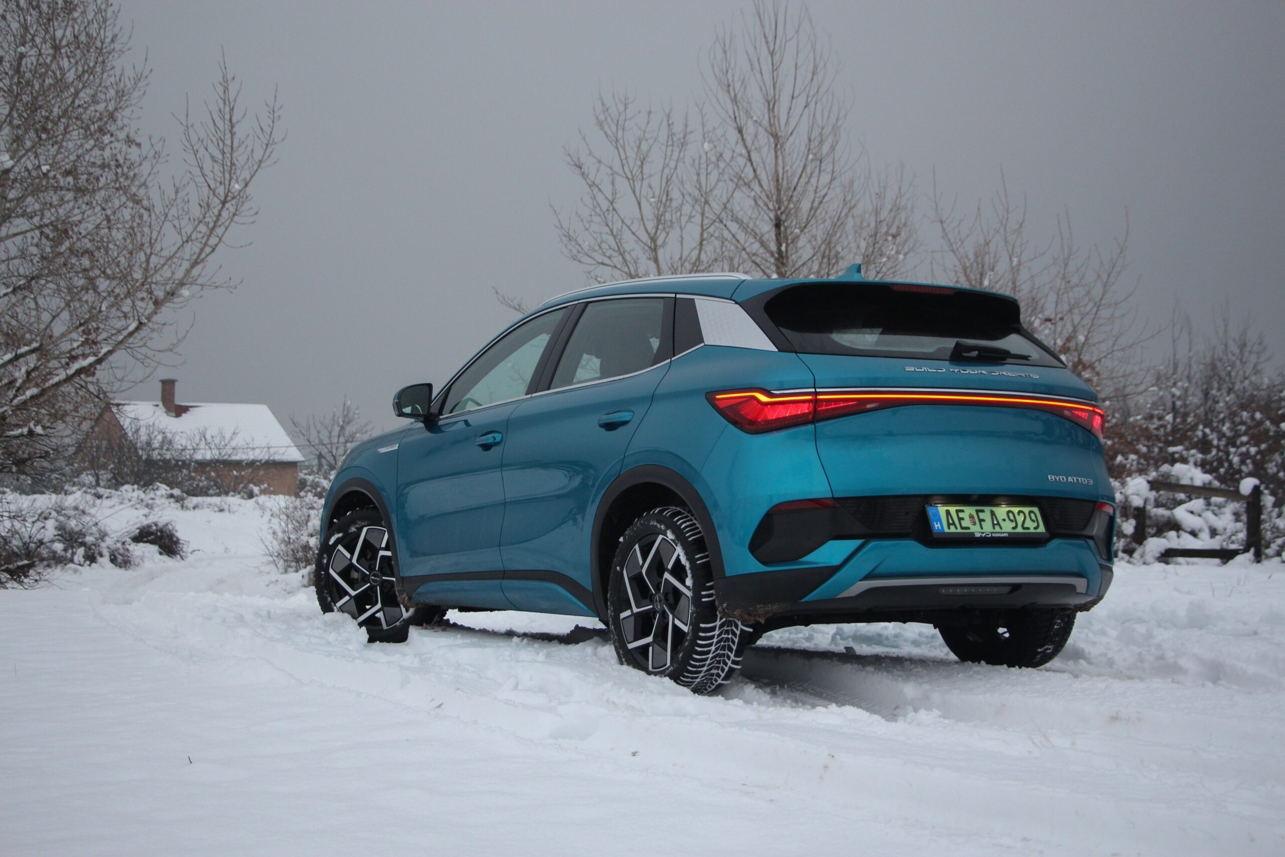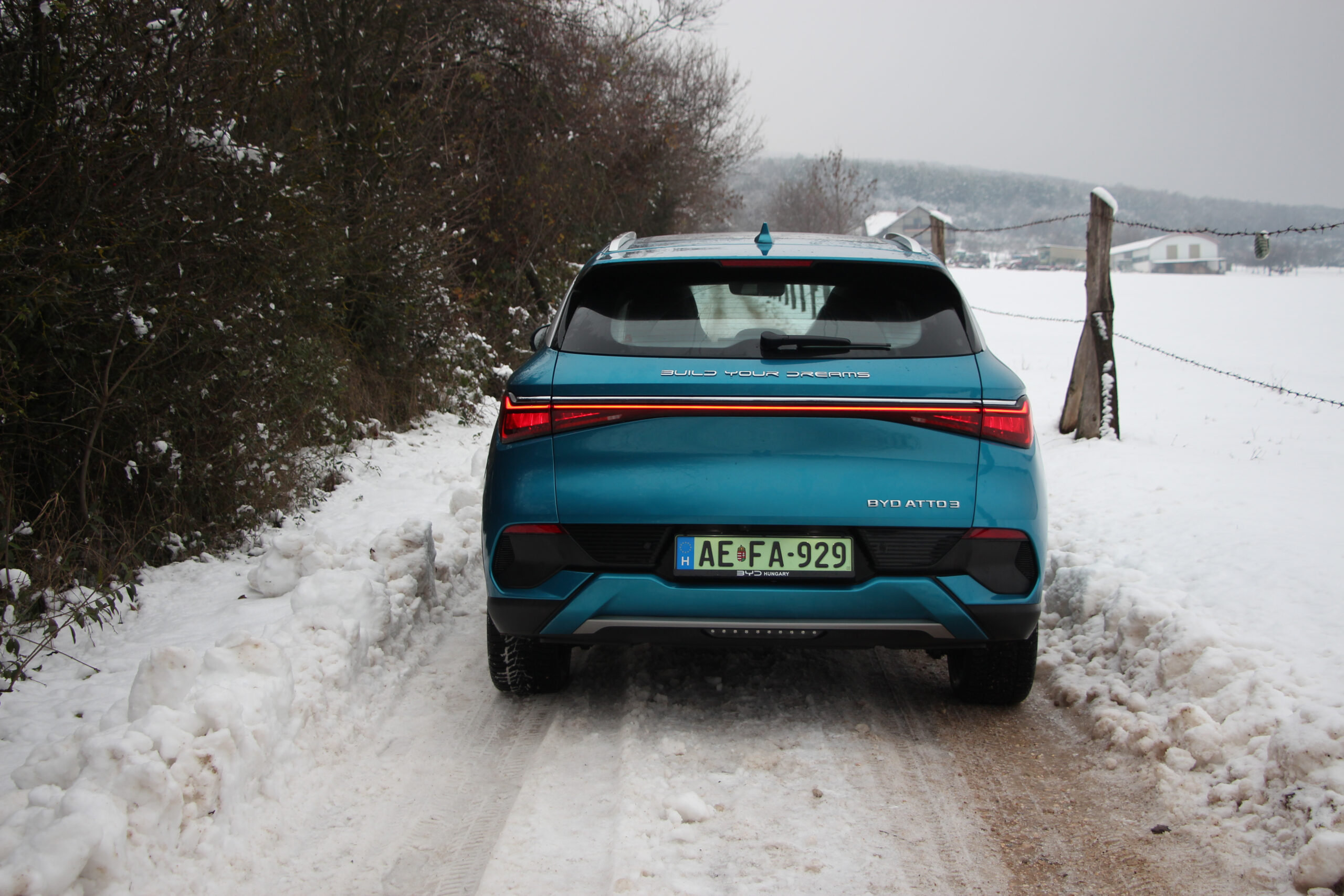 Egyetlen hajtáslánccal érhető el, a 204 lóerős és 320 Nm forgatónyomatékot adó villanymotort az autó orrában helyezték el és csak az első kerekeket hajtja. 7,3 másodperces százas gyorsulást tud, ami lendületes, de mindezt nem ülésbe passzírozó módon teszi, mert nagyon okosan hangolták össze a menetpedál érzékenységével. Sok villanyautónál nem bír a kipörgésgátló az azonnal érkező nyomatékkal, az Attóban viszont szinte soha nem nyikkant meg a gumi. Szóval szép egyenletes a nyomatékleadás, ami nagyban hozzájárul a kényelemhez, ahogy a hátsó független felfüggesztés is. Minden autónak kemény vizsga a hazai úthálózat, de a BYD SUV-ja ügyesen rejti el az úthibákat.