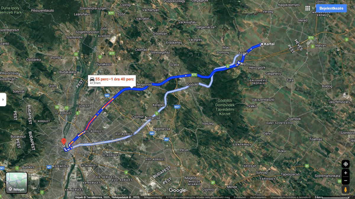 A fenti példán egy útvonal látható az agglomerációból Budapestre. Minden nap két keresőnek két kis fogyasztású autóval két kocsikázás a belvárosba, ami 200 kilométer és minimum 4 óra naponta a családi büdzséből. Ez éves szinten legalább 2,5 millió forint üzemanyagra és autókopásra, továbbá ha egy mellékállással fejenként csak 1000 forintot keresnétek óránként az autókázás helyett, akkor is közel 1,5 millió forinttól estek el évente. Az 12 hónap alatt 4 millió forint, 10 év alatt 40 millió, 20 év alatt 80 millió, annyival pedig nem volt olcsóbb a ház Kartalon, főleg akkor, ha a maradványértéket is nézzük. Ezt a kiadást a villanyautókra váltás a kellő beruházásokkal is legfeljebb csak megfelezni tudja, és 20 év alatt 40 millió forint (infláció nélkül) továbbra is kényelmesen hagy lehetőséget Budapesten belül, a tömegközlekedési rendszert használva élni.