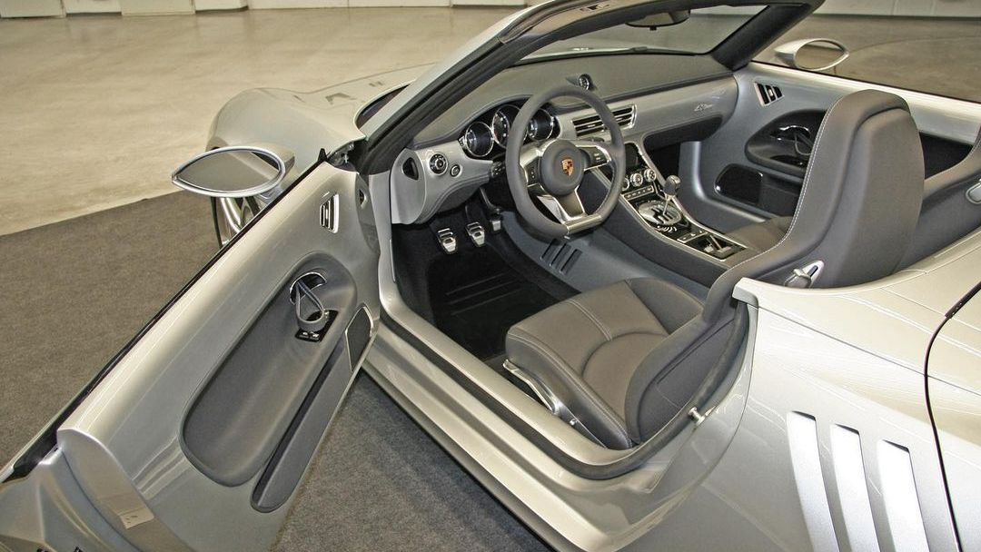 Mit is látunk valójában? Egy, még a Boxsternél is kisebbnek tűnő kétüléses kabriót, mely szemmel láthatóan középmotoros, vagyis vélhetően egy Boxsterre épült. A dizájn egészen más, mint azt a korszak és a márka modelljei mutattak. Elöl megvannak a kerek lámpák, de a többi részlet egészen egyedi. A beltérben nagyon sok az alumínium és a fényezett felület is, sokkal retróbb hatású, mint a legtöbb Porsche. A