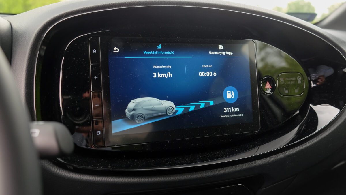 El kell fogadni, az autózás egyre inkább a funkcionalitásról szól, ebben pedig nagyot fejlődött a már nem is olyan nagyon csöppnyi Aygo X is. Étvágya ugyanakkor nem nőtt az első próba szerint, ezt persze inkább egy huzamosabb teszt után lehet majd kijelenteni. Bár Stop-Start rendszer alapáron jár, a klíma használata mellett a szinte nullkilométeres tesztautó még nem állítgatta le a motort. A fotózással, így sok manőverezéssel tarkított tesztkör átlagfogyasztása így is 6 liter alatt maradt városban, de egy rövidebb, városon kívüli szakaszon 5,3-as kiírást is láttam a műszerblokkban, így hosszabb országúti szakaszokon, higgadtabb elővárosi forgalomban simán hozhatók lehetnek 5 liter alatti értékek is.