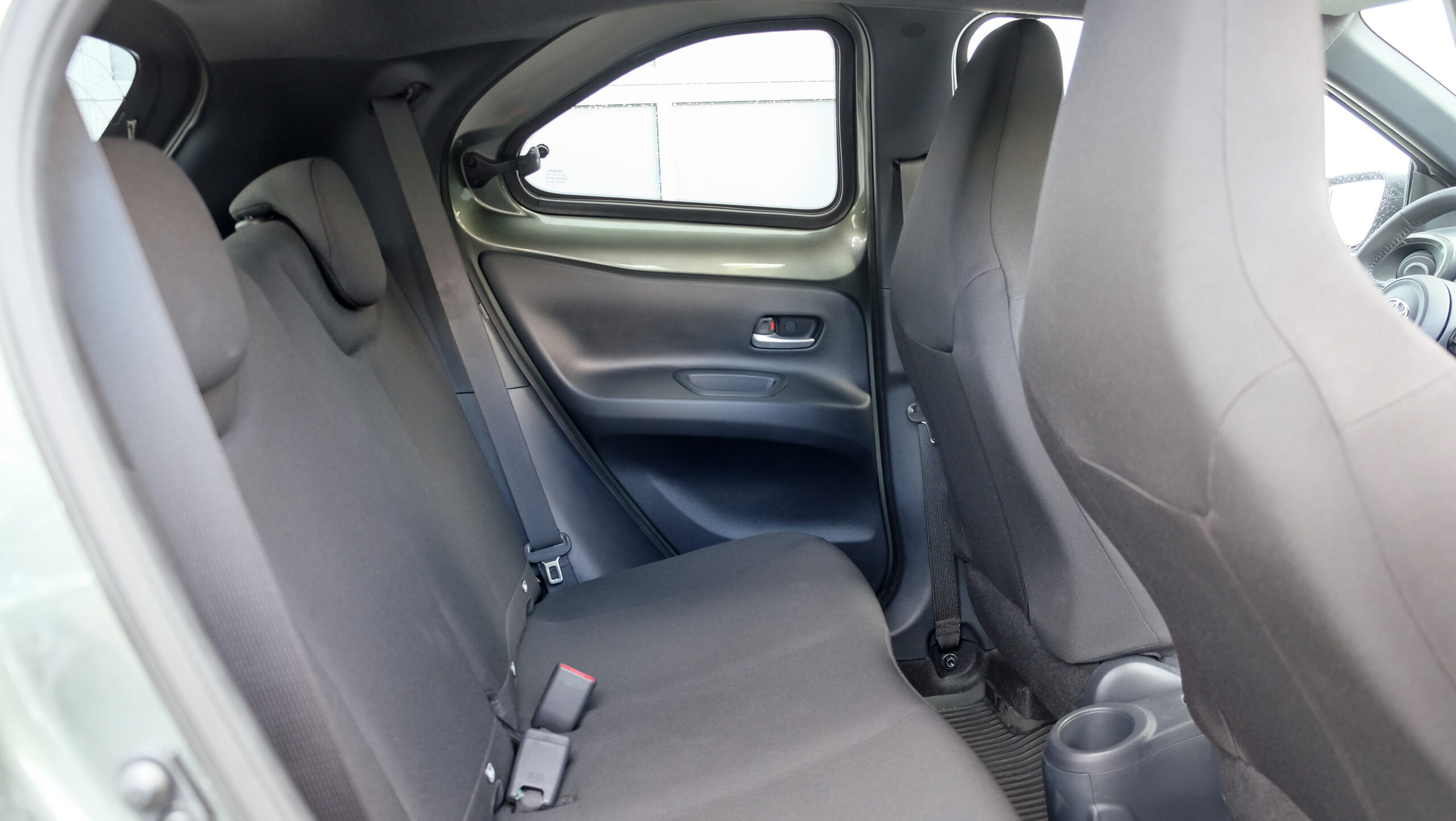Miniautós szokás szerint az Aygo X is csak négyüléses, hátul korlátozott fej- és lábtérrel. Mivel középen semmiképp sem kell helyet szorítani, így rövidebb távokra felnőttek is beültethetők hátra, ahol nem csak helyből van kevesebb, a kárpitozás és az ülés formázása is egyszerűbb, az oldalablak is csak billenthető - manuálisan, míg elöl alapáron jár az elektromos mozgatás. A csomagtér 231 literével túlmutat a miniautóktól megszokotton, már-már kisautós. Dizájntrükk, hogy kívülről teljesen üvegnek néz ki az ötödik ajtó, de annak kerete persze fém. Szatyorakasztókat és egy egyszerű fedőelemet is kapunk, na meg osztott támladöntést, amivel 829 literesre bővíthetjük a rakteret.