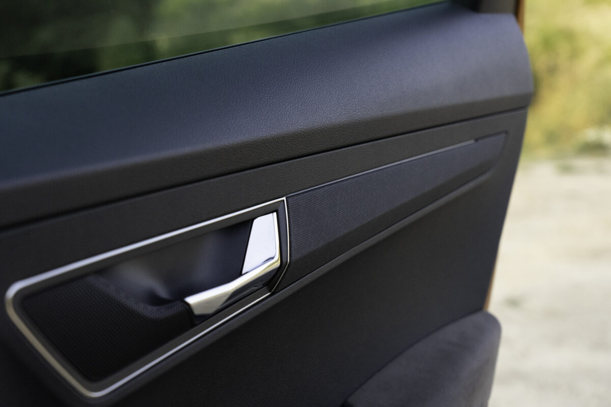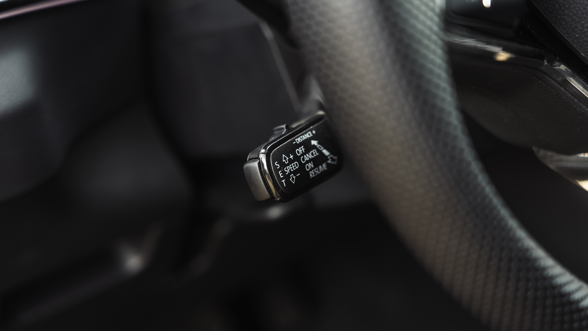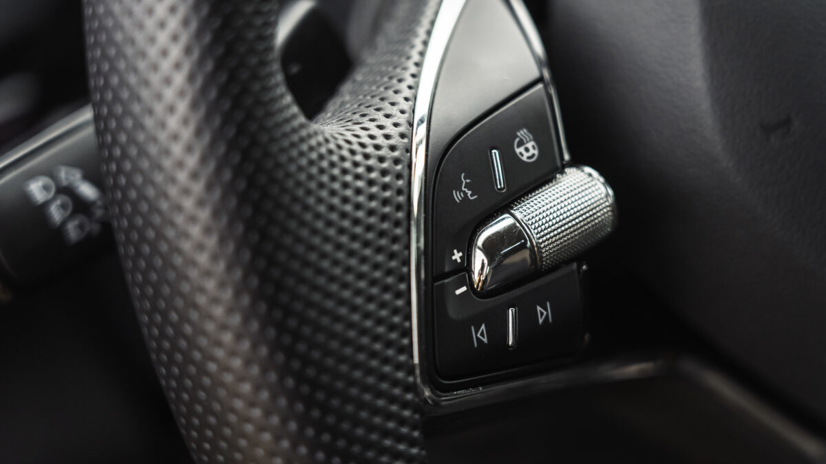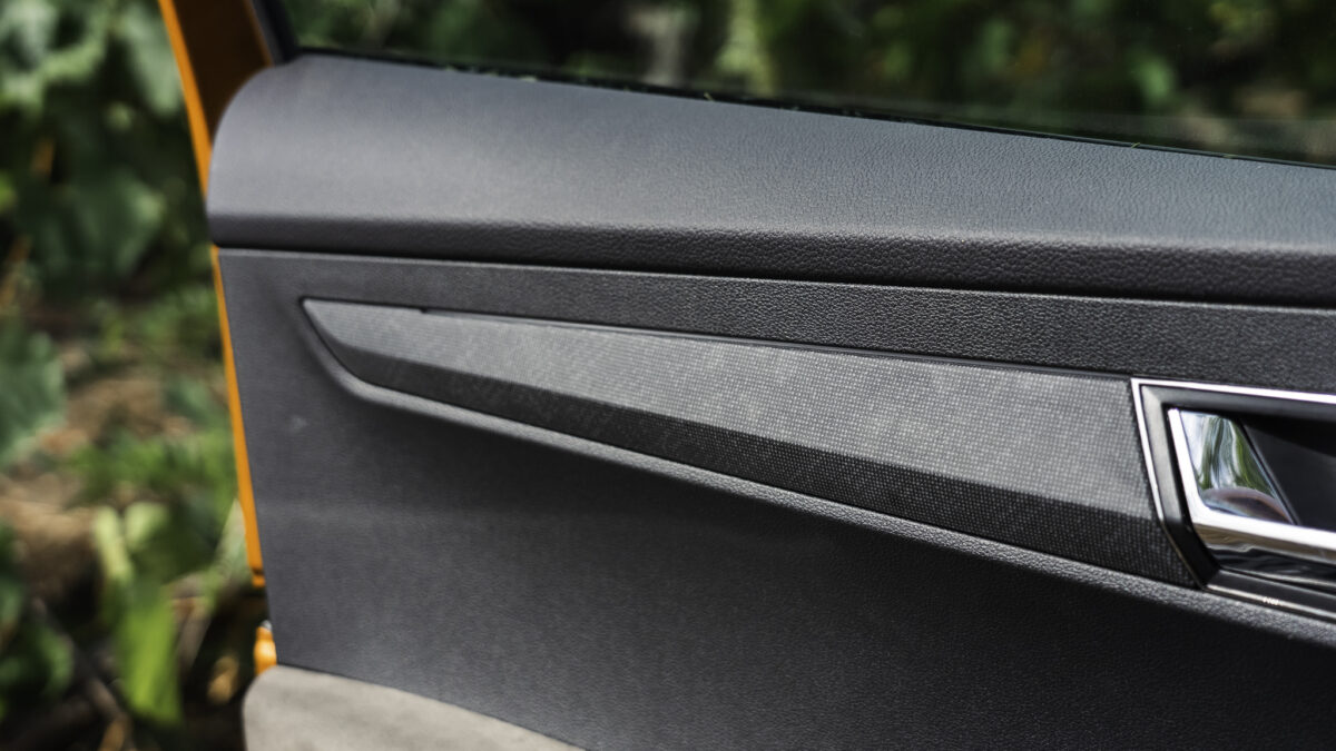 A multifunkciós sportkormány jól mutat, jó a fogása és szerencsére fizikai gombok vannak rajta. Az ajtókra pillantva, megcsodálhatjuk az új, extraként választható, stilizált gyémántokat mintázó dekorbetéteket is, amik szintén feldobják a teret
