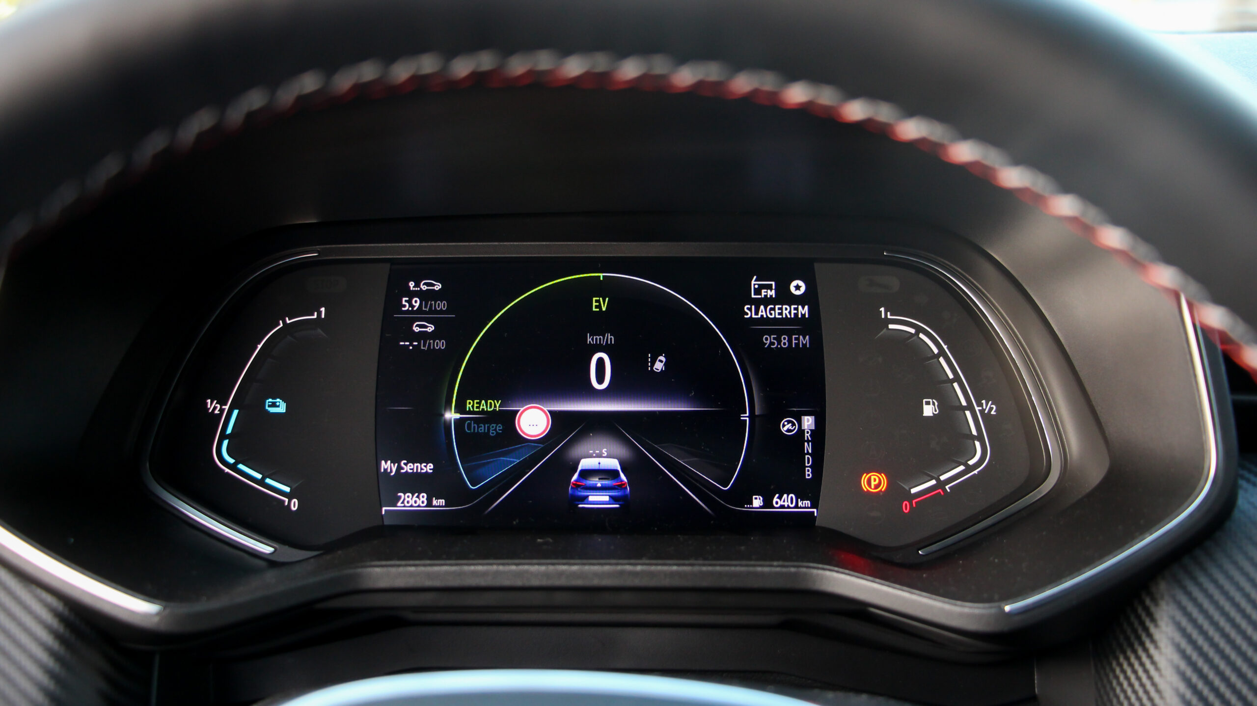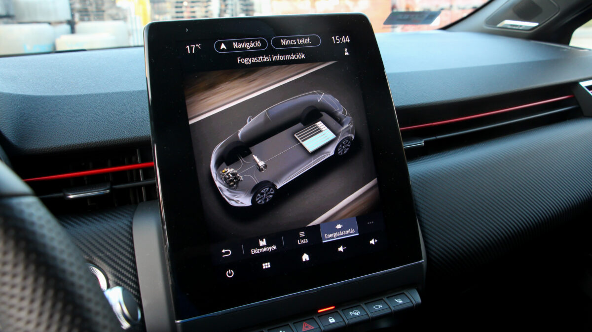 A műszerblokk középső része digitális csak, a tesztautóban a My Sense rendszer nyomkodása ellenére csak egy megjelenítést tudott, a váltó fokozott visszatöltést és motorféket adó B fokozatot is kínál, a központi (felárasan 9,3 colos, állított formátumú) kijelzőn természetesen folyamatábrát és részletes fogyasztási adatokat is kaphatunk