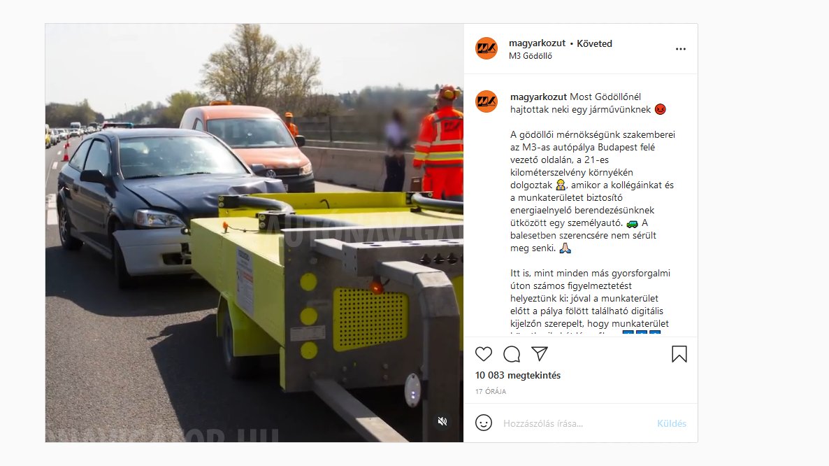Miként azt a Magyar Közút sajtóközleményében írja, a gödöllői mérnökség szakemberei kedd délelőtt az M3-as autópálya Budapest felé vezető oldalán, a 21-es kilométerszelvény környékén dolgoztak, amikor a dolgozókat és a munkaterületet biztosító energiaelnyelő berendezésünknek ütközött egy személyautó. A balesetben szerencsére nem sérült meg senki.
