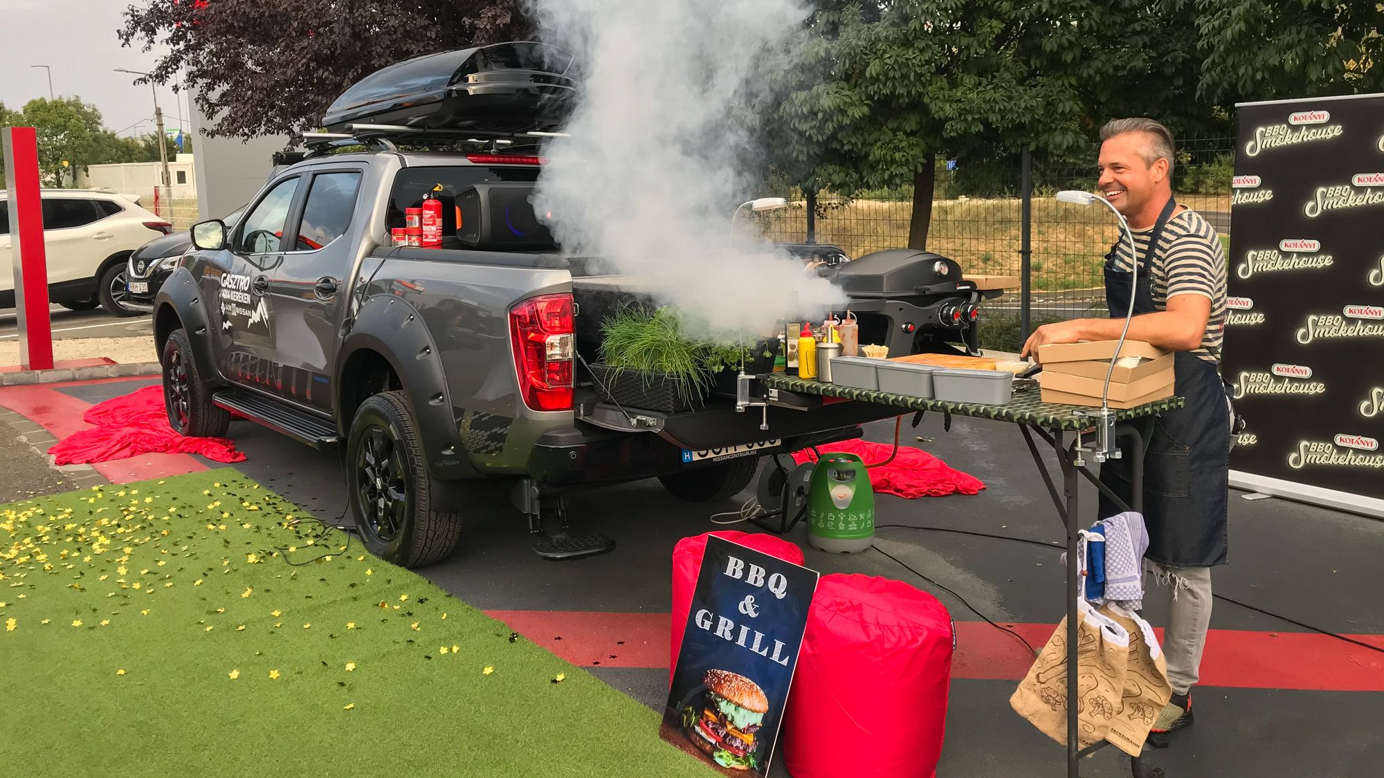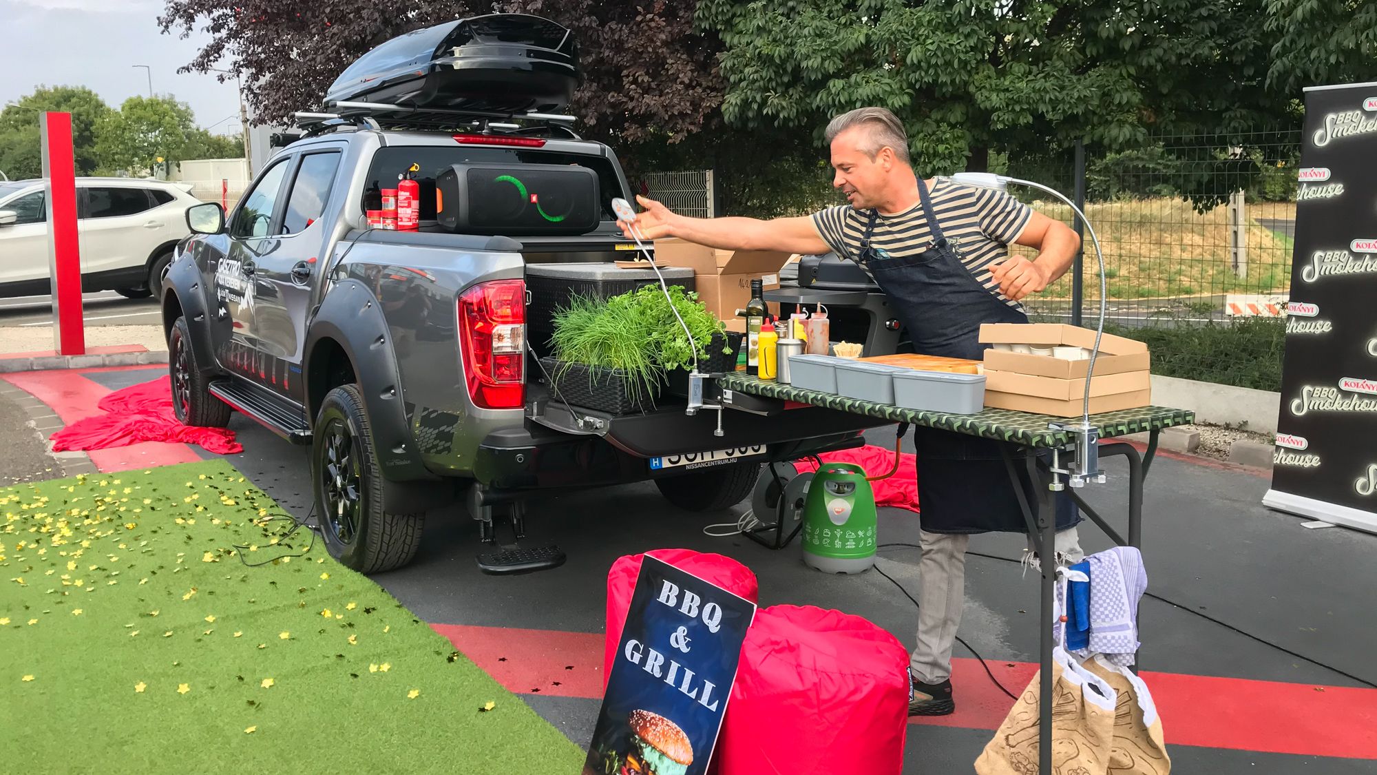 Konyha jellemzően a lakóautókban is van, ám rendszerint csak egy kis saroknyi, amin persze a vérbeli lakóautósok komoly vacsorákat, ebédeket is tudnak készíteni. Ám minden bizonnyal látványosabb főzés alakítható azzal az egyedileg kialakított Navarával, amit a Nissan újdonsült hazai forgalmazójától, a Grand Automotive Central Europe Kft-től kapott a Lázár Chefként híres Kovács Lázár. A Navarát - Kovács Lázár közreműködésével - pont ahhoz építették meg, hogy a YouTuber látványos videókat készíthessen, akár egzotikus helyeken. A platóra kihúzható grill került, amihez természetesen nem kell tüzet rakni, épp az a mini gáztartály használható hozzá, amit akár egy otthoni, teraszon sütögetéshez is megvehetünk a benzinkúton.