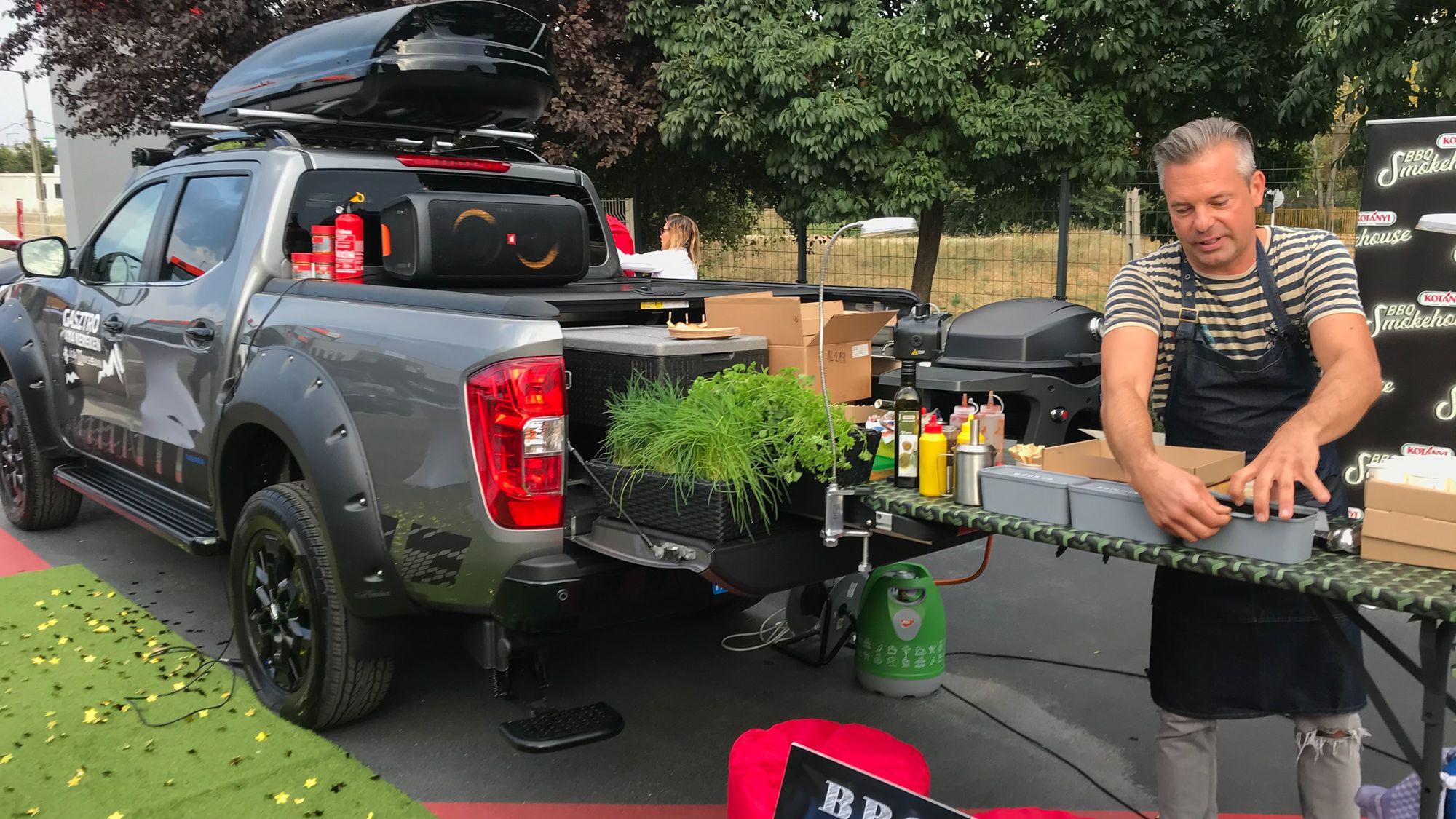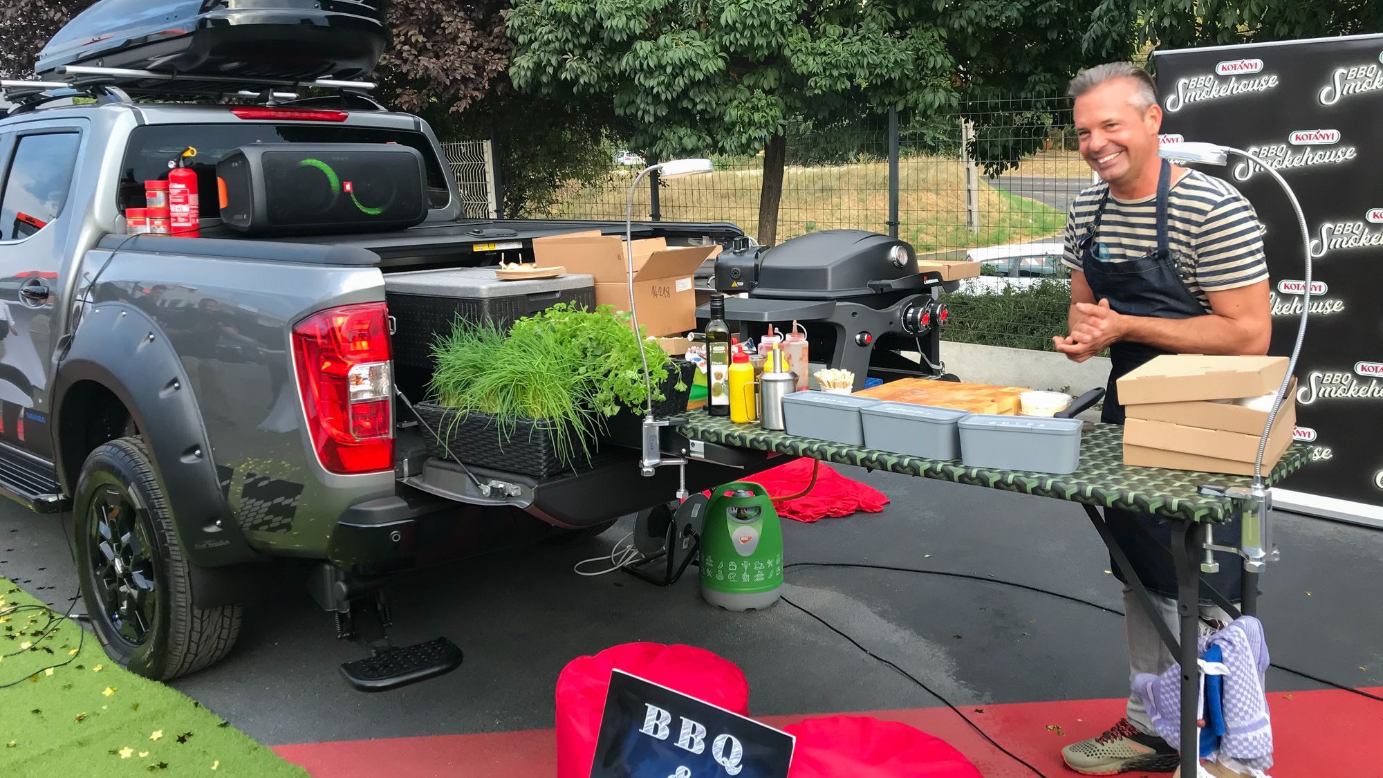 Az amúgy sem szerény méretű Navara némi emelést és sárvédőszélesítést, hátulra lehajtható fellépőt is kapott, fedőrolós platójából pedig nem csak a sütő, az összes konyhai eszköz és kerti partyk elmaradhatatlan kelléke, a hifi is elővarázsolható, a lehajtható platóajtó meghosszabbításaként pedig a munkapultot kapja meg Lázár Chef. Mint elmondta, a Nissan, egészen pontosan a Navara által a jövőben különleges helyeken főzhet majd, természetesen kamerák előtt. A nézők csak egy dolgot sajnálhatnak majd: bár a lenyűgöző tájakat visszaadja a YouTube, az ízeket sajnos nem, ám aki ügyesen követi Kovács Lázár főzését, saját maga által tapasztalhatja meg azokat, vagy legalábbis inspirációt kaphat, miként lehet különlegesen ízletes falatokat készíteni.