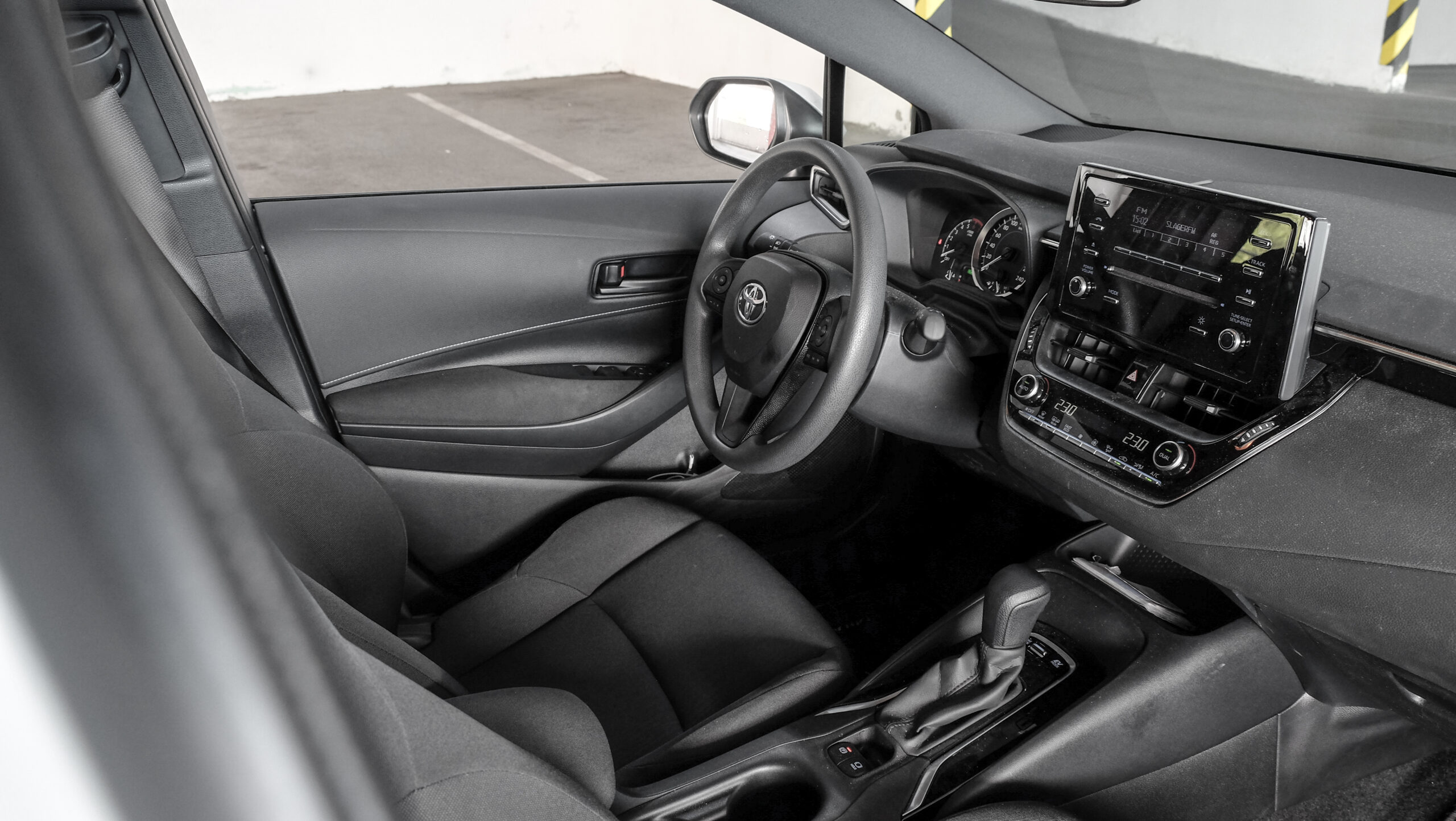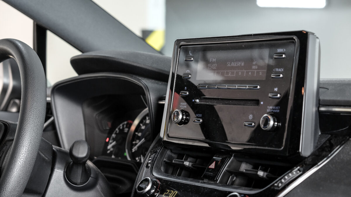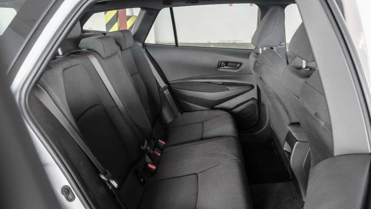 A hibrid rendszer és a váltómű sajátossága, hogy nincsenek fokozatok, a hibrides bőgés jellemző, de már ennél a verziónál sem annyira kínos, mint korábban volt, a 2,0 literesre pedig egyáltalán nem is jellemző. Hozzá lehet szokni, pláne úgy, ha megfelelően vezetik, sok kigurulással, higgadt gázadásokkal és gyorsításokkal. Jó a hangszigetelés, nem sokat hallani abból, ha beindul a benzinmotor, ez az egész rendszer így ahogy van, nagyon élhető. Hogy maga az autó mennyire? Kicsit olyan, mintha a B-oszloptól hátrafelé nem igazán lenne életben, mintha tényleg csak egy puttony lógna rajta. Ez az érzés abból adódik, hogy egyrészt hangszórók sincsenek hátul, másrészt nincs tolatóradar, kamera meg pláne. Aki most vesz belépő szintű Comfort Corollát, az kap kamerát és 8 colos multimédiát is, ezekről az ilyen Active-ok még hírt sem hallottak. A sima folyadékkristályos kijelzős rádió rendesen bénán mutat a műszerfalra biggyesztett táblán, de a rádió végülis szól, a feladatát tökéletesen ellátja.Nagyon egyszerű, funkcionális így a beltér, de használható, és ez a lényeg