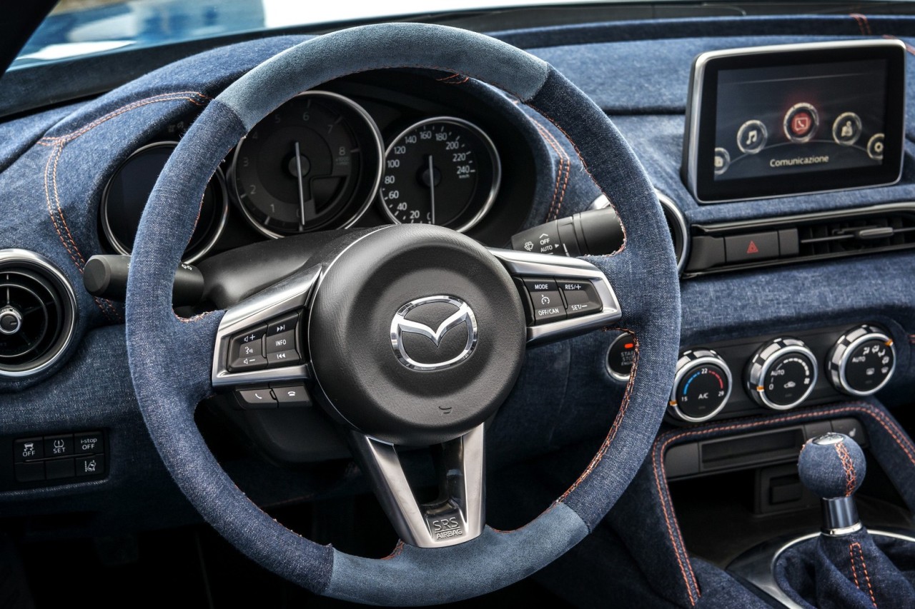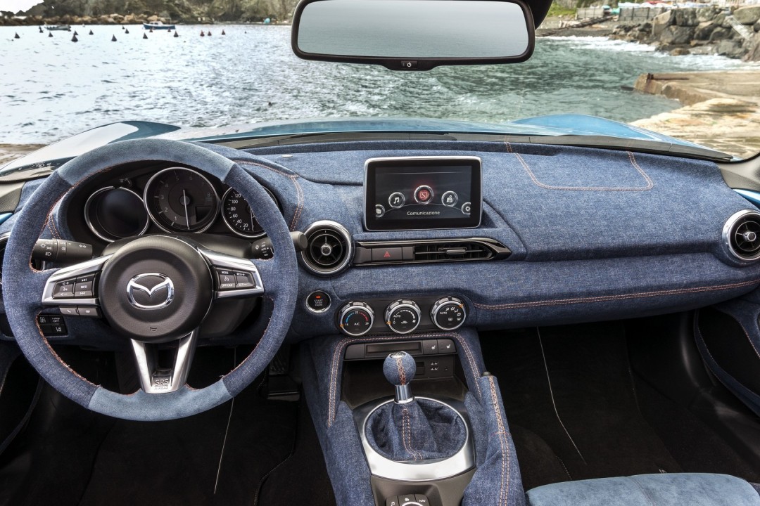 A karosszéria színei az utastérben is visszaköszönnek, igaz csak nyomokban. Az üléseken, a könyöklőkön és a kormányon tűnik fel a kék alcantara, amit mindenütt aranyló narancsos cérnával varrtak össze az utastér domináns farmer anyagával. Még a műszerfalra is jutott bőven a praktikus, strapabíró anyagból, amellyel kétségtelenül egyedi, új karaktert kapott a kétszemélyes utastér. Alkotói a Levanto nevet adták ennek az egyedi MX-5-nek, a kristálytiszta vizű tengerparti olasz település után, ahonnan Olaszországban állítólag hódító útjára indult a szörf.