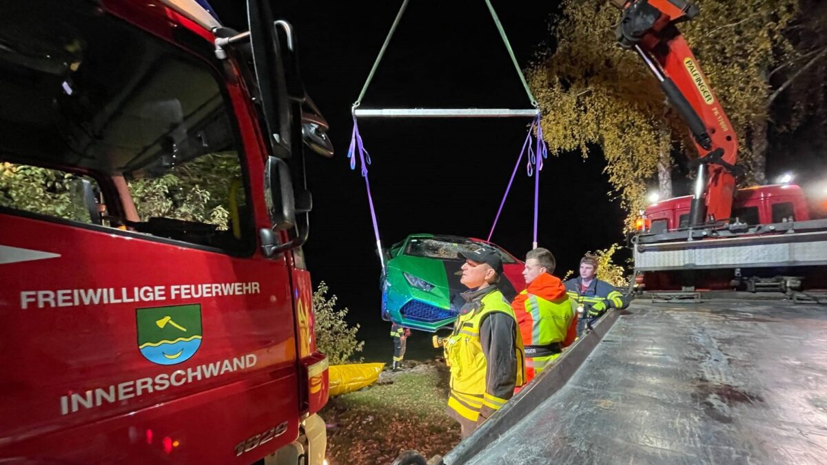 A búvárok próbálják a felszínre hozni a felmatricázott Lamborghinit (Fotó: Abschnittsfeuerwehrkommando Mondsee)