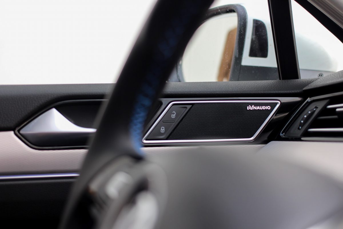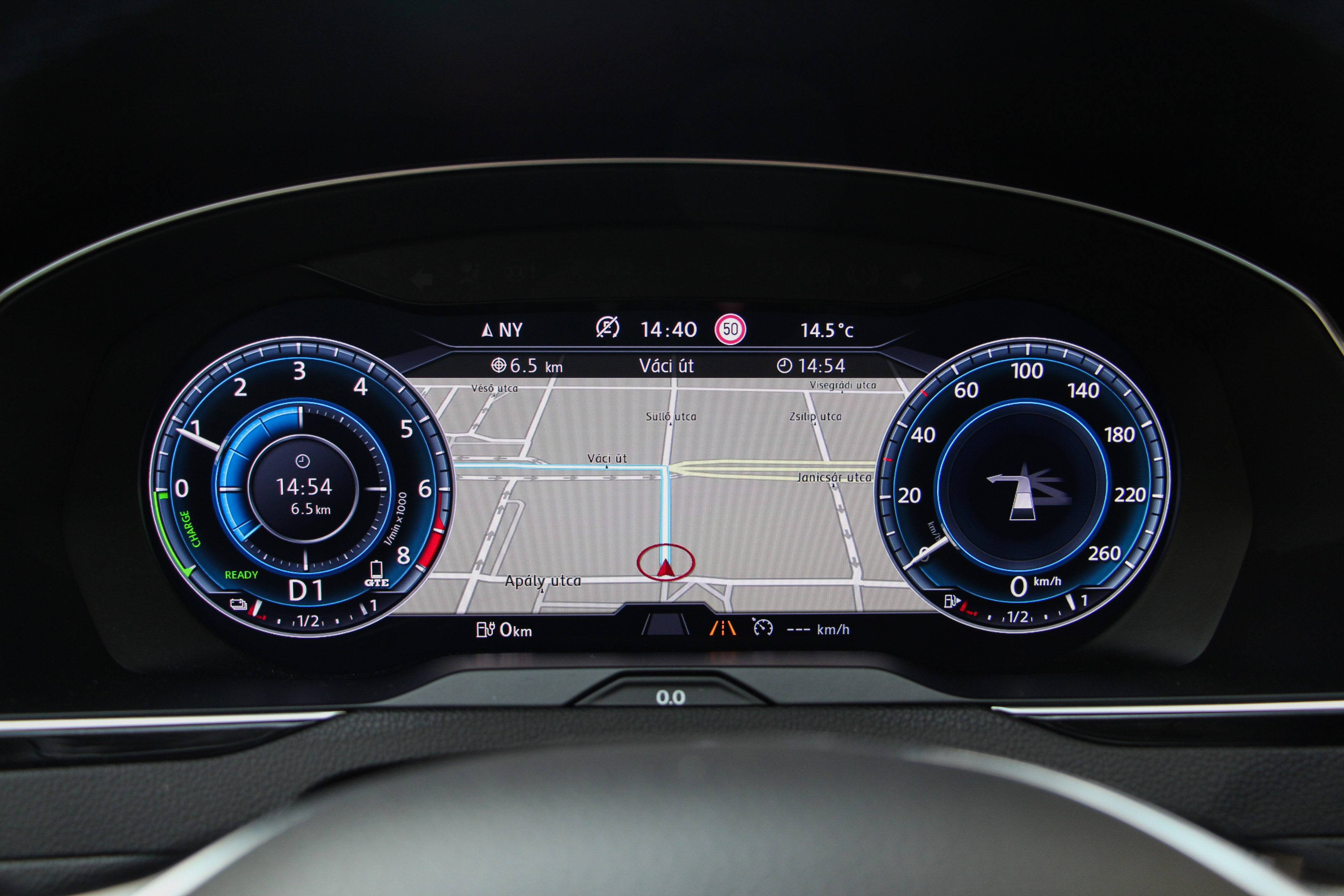 Látványos és széles a műszerfal, hagyományos DSG váltó osztja a nyomatékot, a teljes egészében kijelzős műszerblokk GTE-specifikus, a kormánykerék vágott aljú