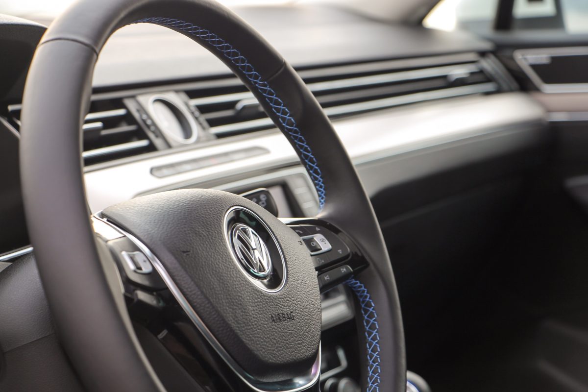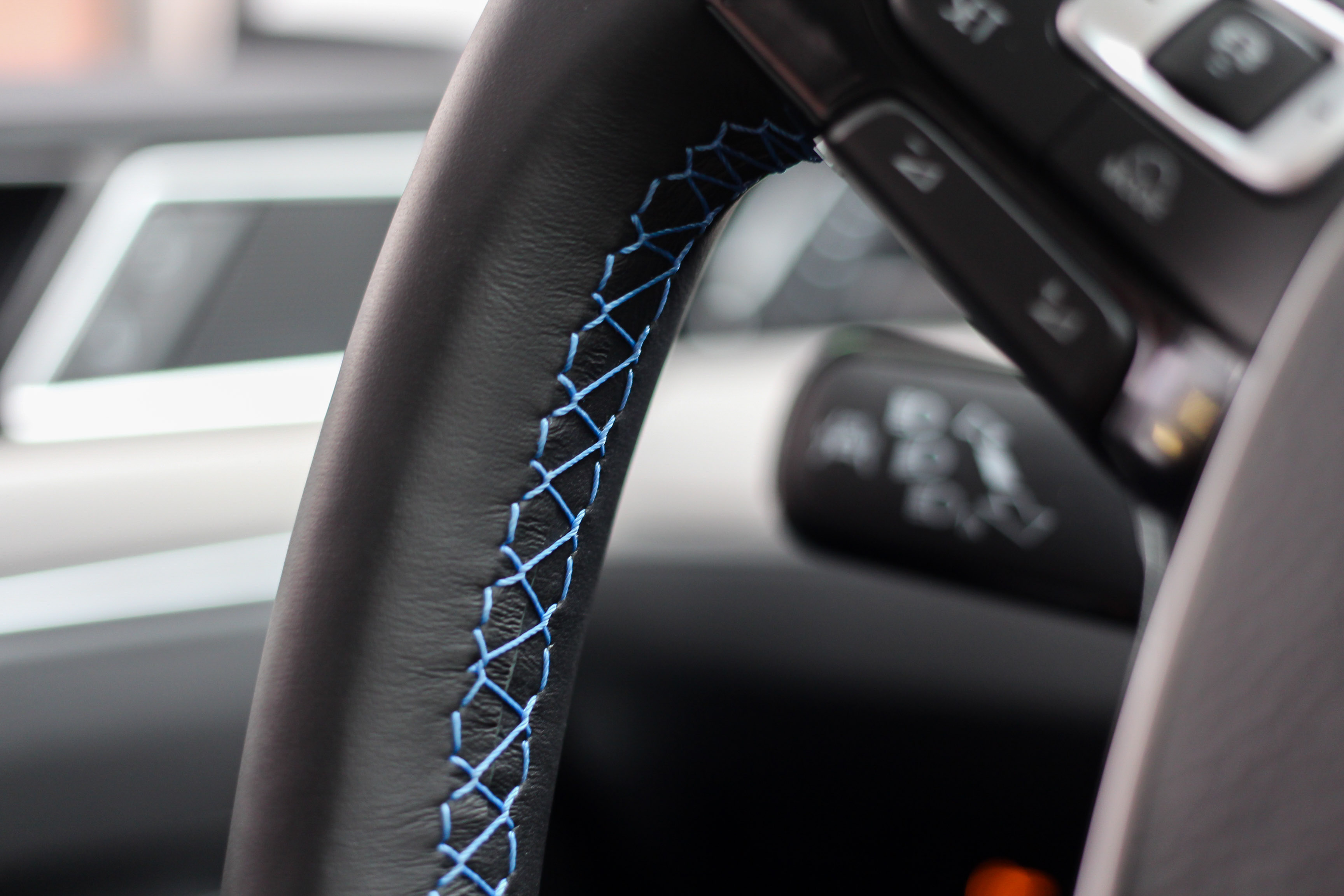 Kék cérnával varrott a kormánykerék bőrhuzata, kékek a GTE-feliratok, a szellőzőrostélyok fémcsíkja pedig a teljes műszerfalon végigfut