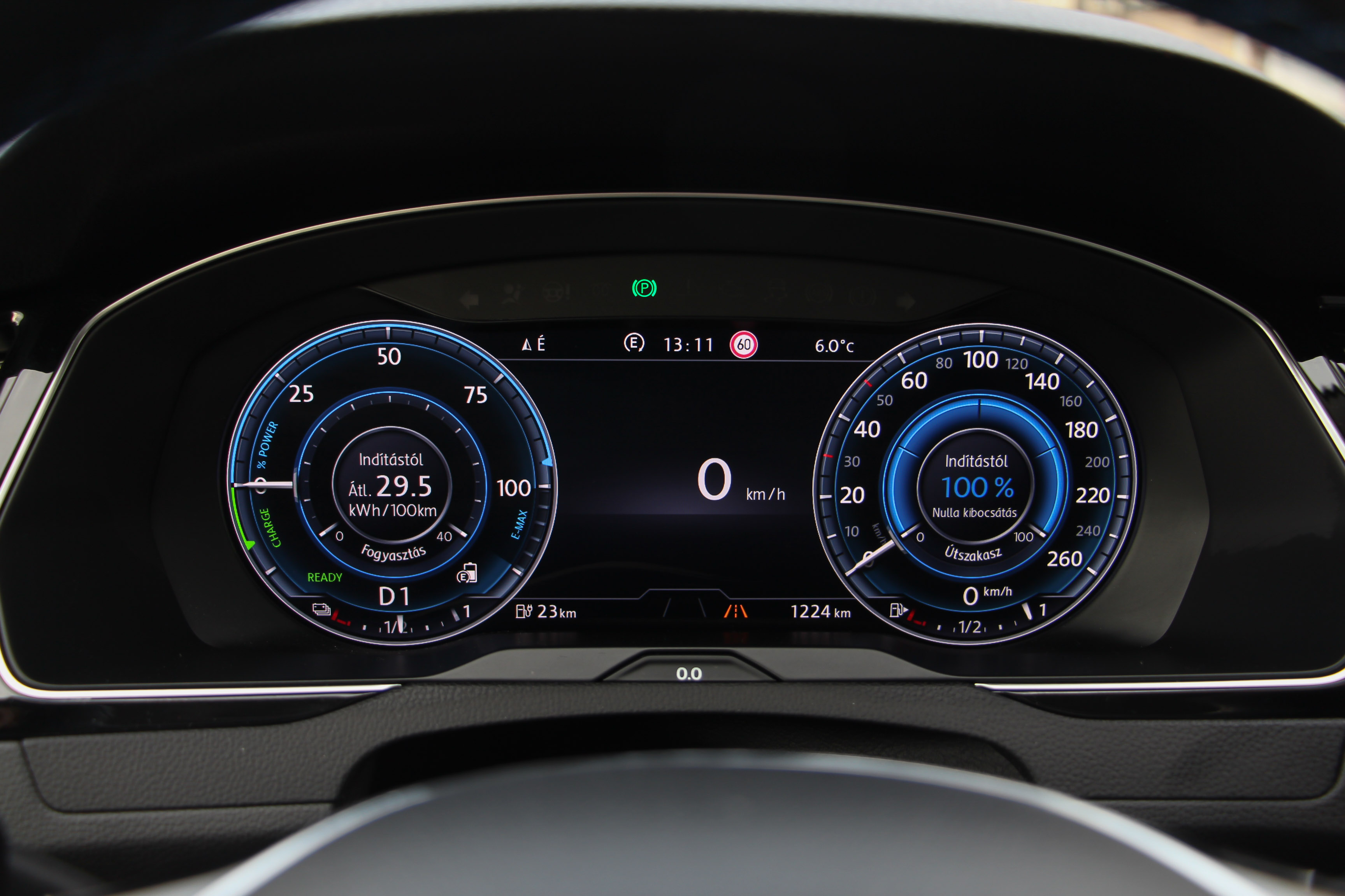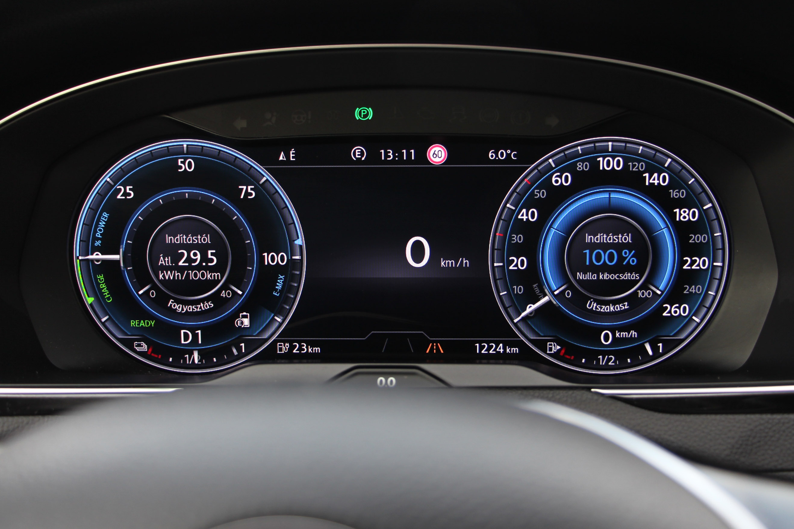 Igaz a katalógusérték? Nem. Az 1,6 l/100 km benzinfogyasztás ugyanis 12,2 kWh áramfogyasztás mellett értendő, a Passatba pedig a Golf GTE-nél látottnál ugyan nagyobb, 9,9 kWh-s lítium-ion akkumulátor került, de könnyű belátni, egyetlen töltéssel semmiképp sem fogunk megtenni 100 kilométert 1,6 liternyi benzinből. Két-három töltéssel azonban akár benzin nélkül is megtehető az említett táv. A katalógus szerinti 50 kilométeres e-hatótáv ugyanis országúton, egyenletes tempóval simán hozhatónak tűnik, az enyhe téli, már-már kora tavaszi időben városban is simán 40 kilométer fölé ment a benzinégetés nélkül megtehető kilométerek száma. A simán persze némi kompromisszummal, a fűtés mellőzésével értendő, de 8-10 Celsius fokon már gond nélkül el lehet lenni nélküle.
