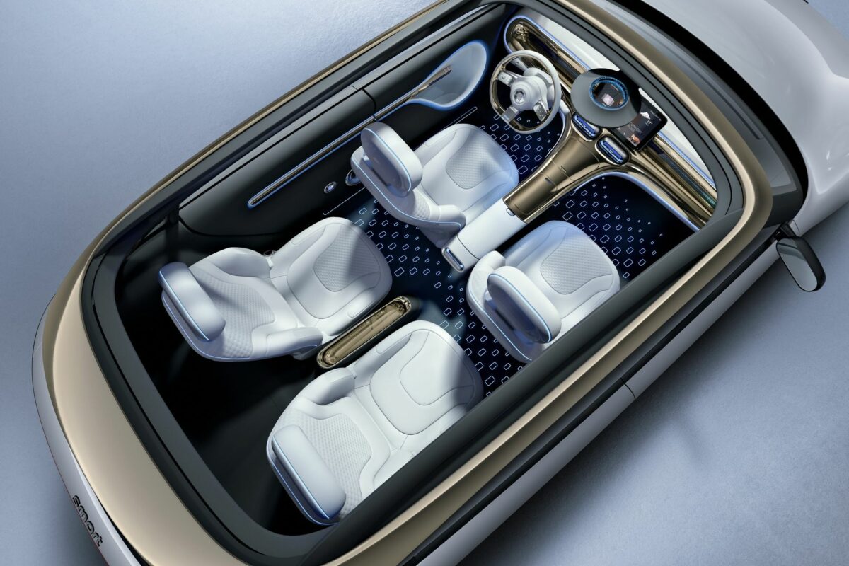 Szinte egyből látszik a koncepcióautó külsején, hogy elhagyták a B-oszlopot, és valóban az alábbi képen láthatók is az egymással szemben nyíló ajtók, amelyek megkönnyítik a beszállást az utastérbe. Itt már feltűnik némi Mercedes rokonság a „lebegő” középkonzol hatására, illetve a 12,8 colos érintőképernyő is stuttgarti vonás, de a kormánykerék mögött nincs folytatása, az első fotókon nem látni digitális műszeregységet.