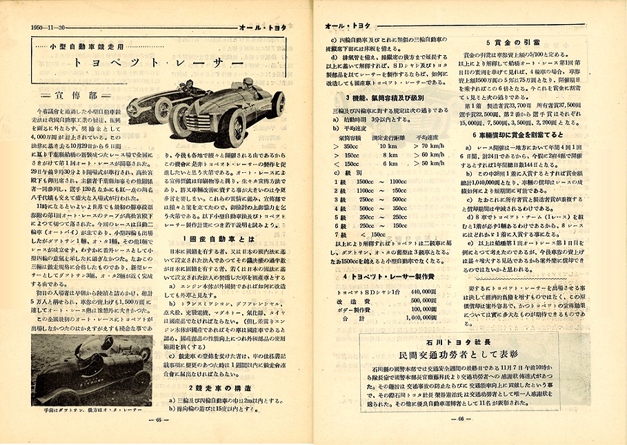 Amikor az 1940-es évek végén fennállásának legsúlyosabb gazdasági válságával küzdött a Toyota, Kiichiro Toyoda úgy döntött, a kedvezőtlen feltételek ellenére megvalósítja régen dédelgetett álmát, és megépíti első versenyautóját. Kiichiro-szan meggyőződése volt, hogy a motorsport a társadalom széles rétegeinek körében segíthet népszerűsíteni az automobilt, ezzel megteremtve az autógyártók számára nélkülözhetetlen vásárlóbázist. Abban is biztos volt, hogy a könnyű, takarékos autóké a jövő, és az ezekhez szükséges motortechnológiát szintén az autóversenyzésen keresztül remélte kifejleszteni.