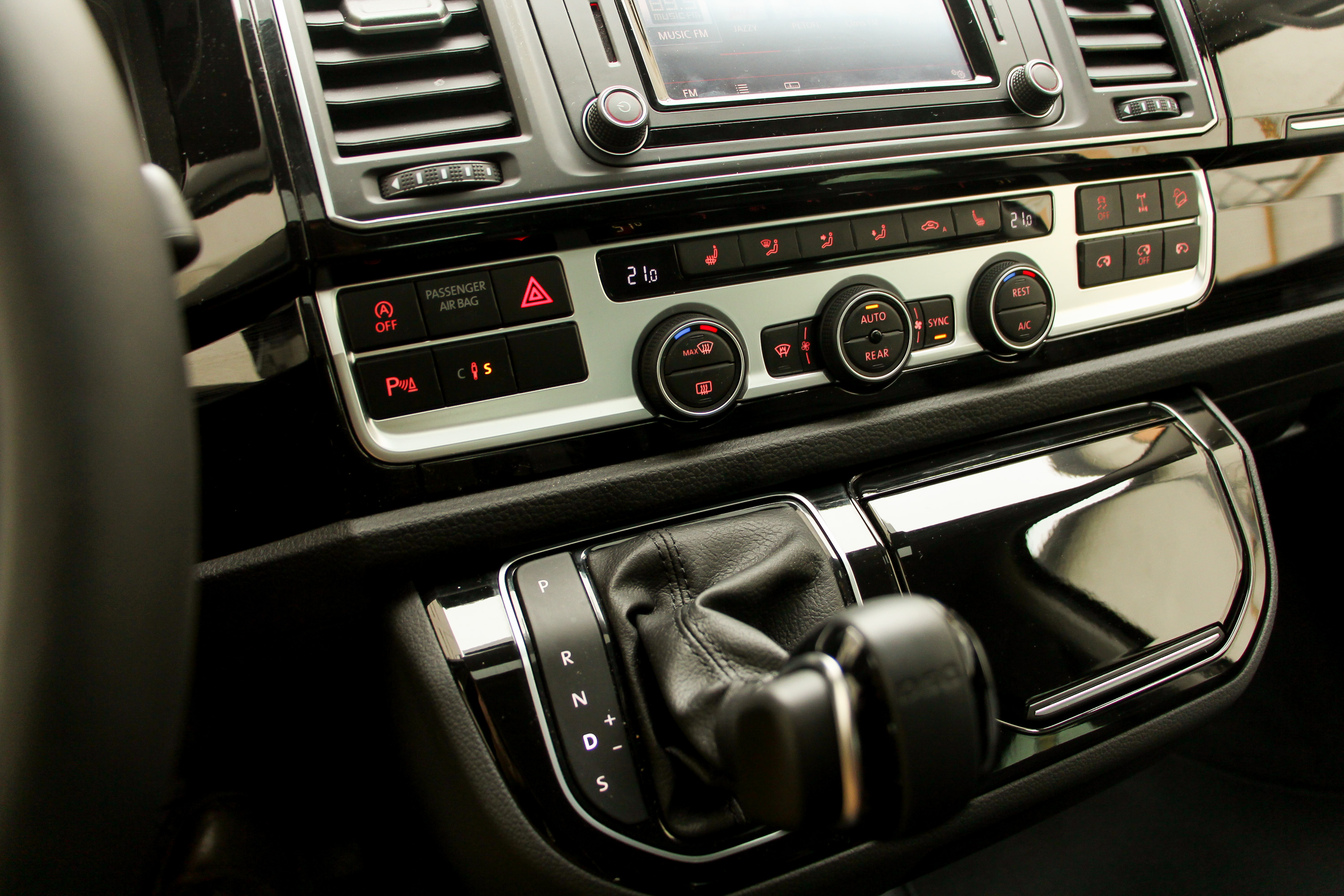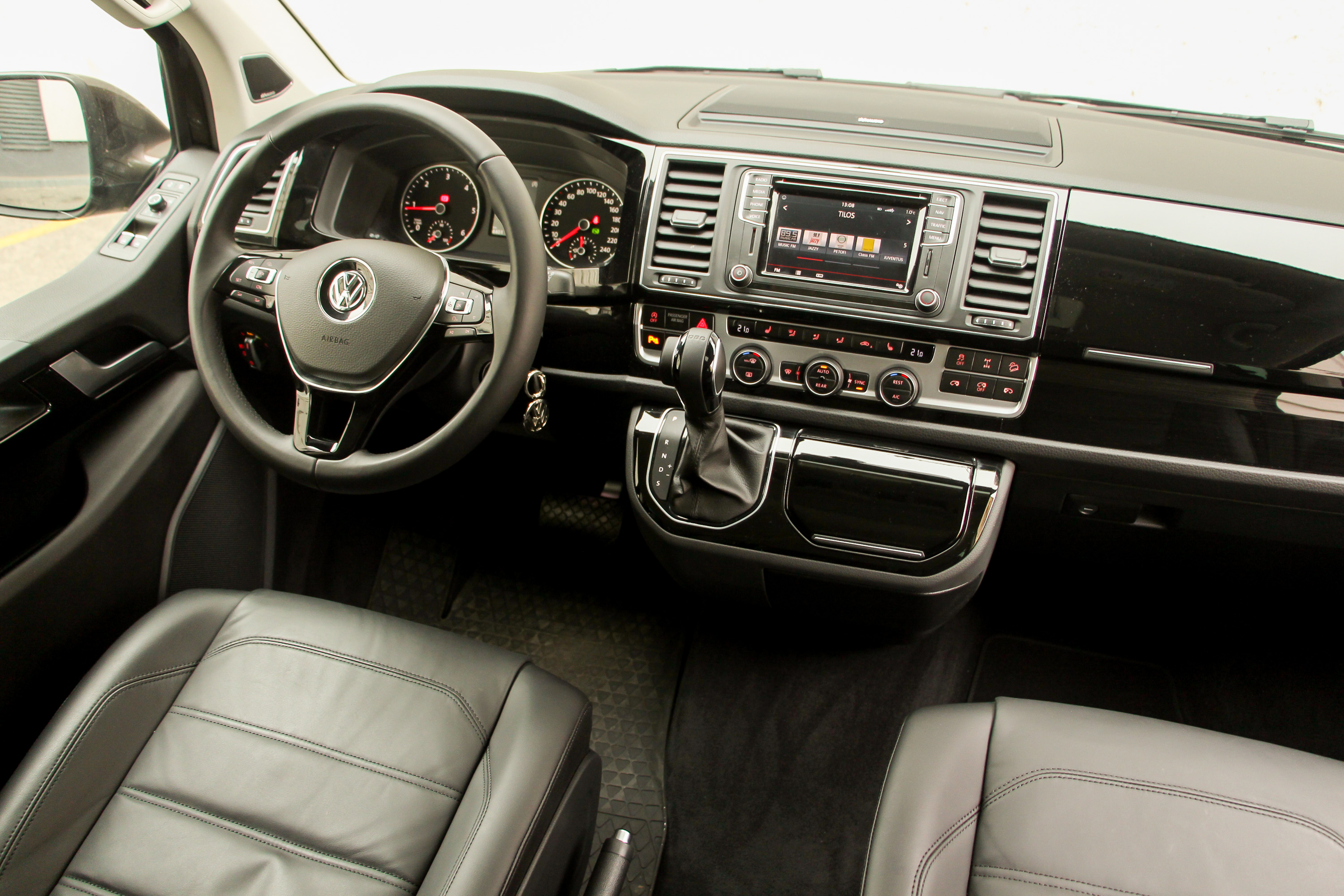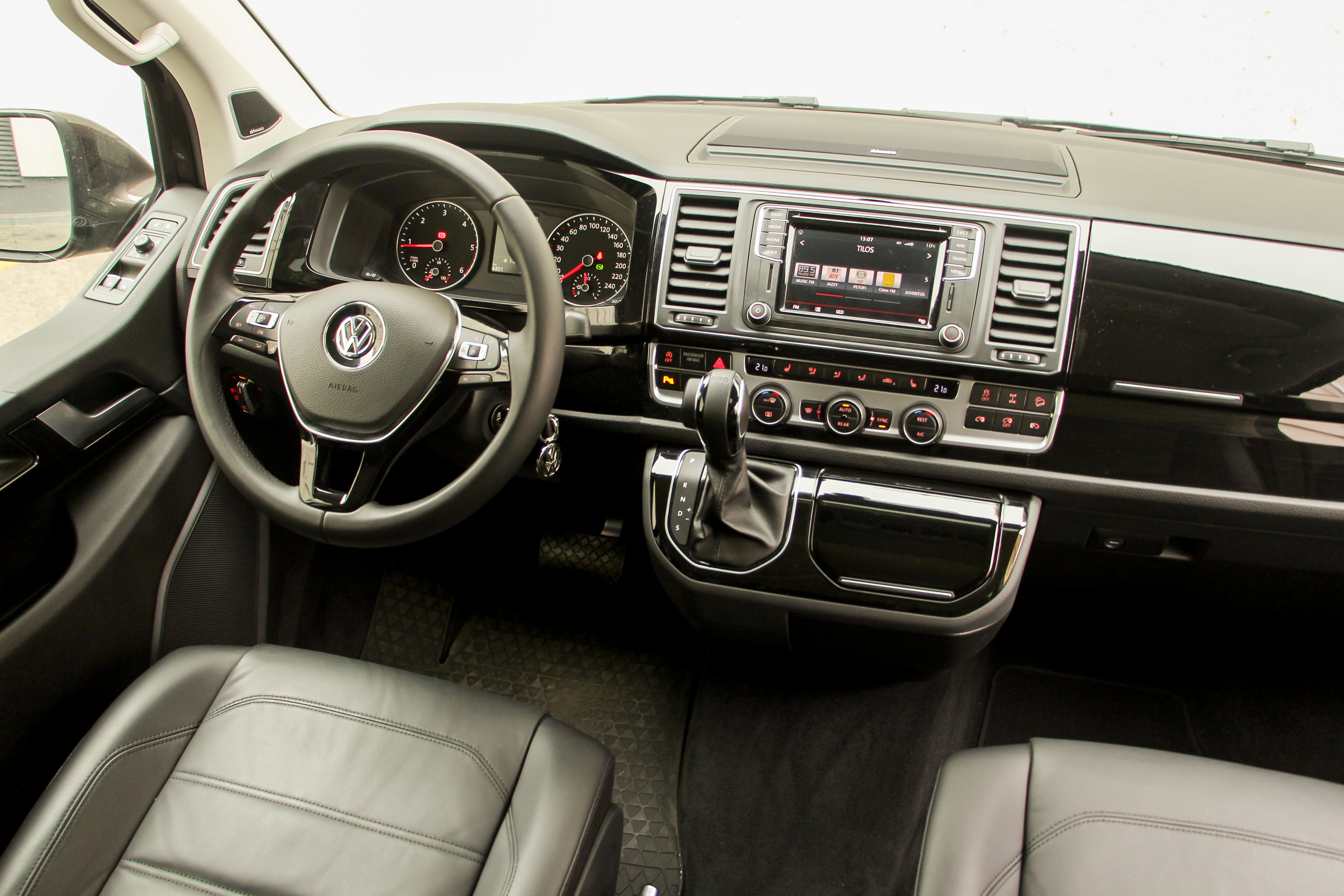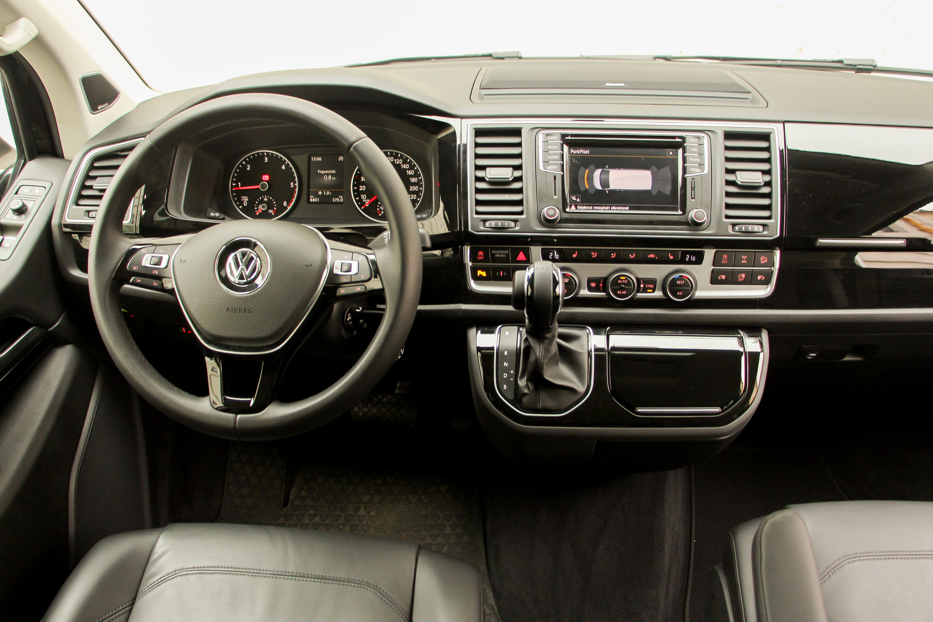 Nem csak elődjétől, a többi Transportertől, de még a családibb Caravelle verzióktól is különböző a Multivan műszerfala. Vonalaival egy kicsit a T1 felé kacsint, mai divat szerint sok-sok zongoralakkos műanyaggal