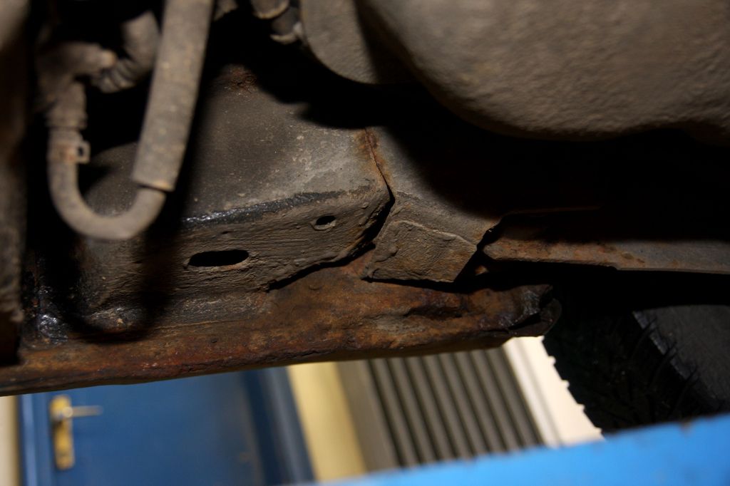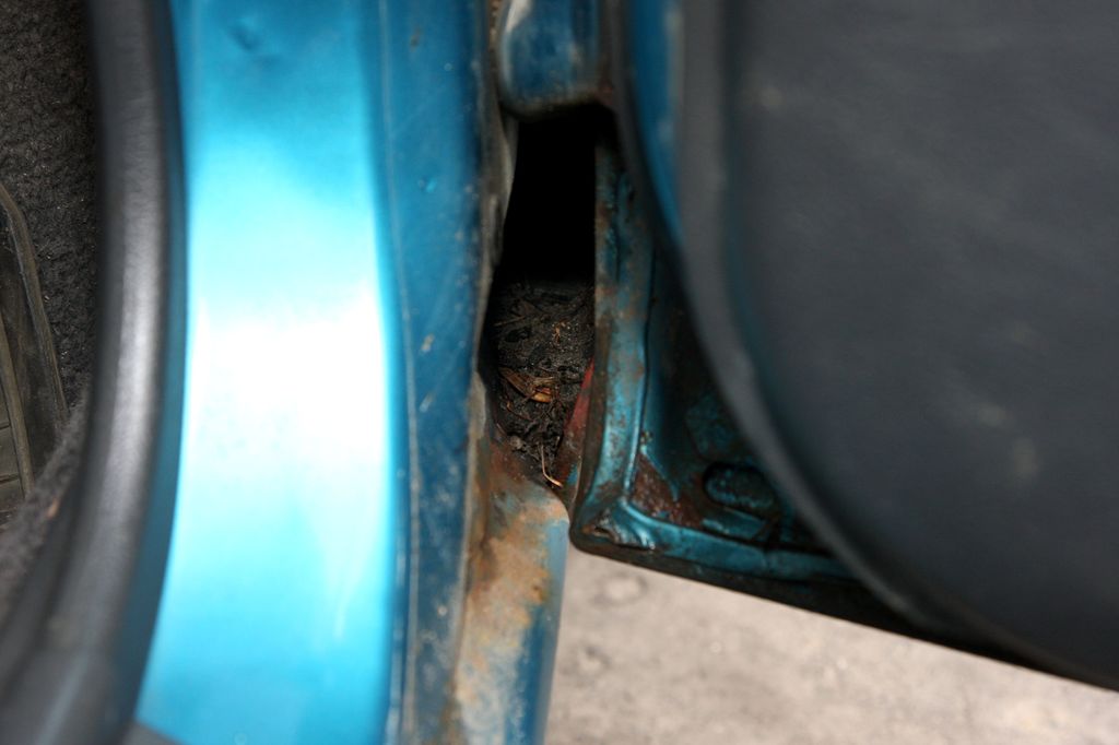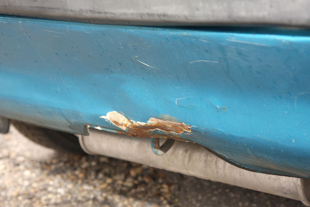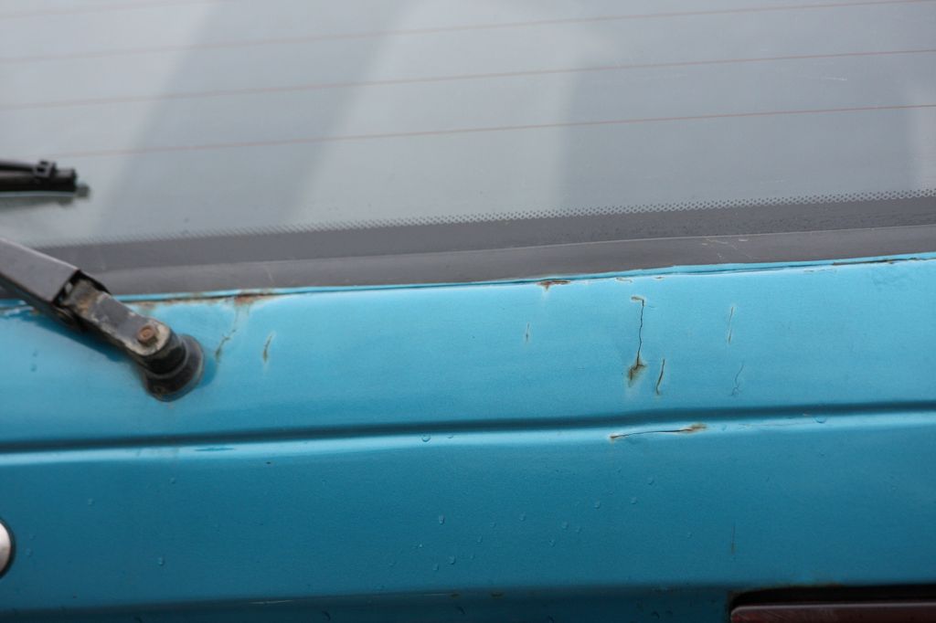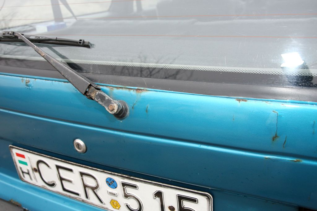 Hátulról volt sajnos egy-két apróbb és egy komolyabb sérülés is, a köténylemez és a csomagtérajtó fényezése sem a gyári, a kittelt elemek sajnos rozsdásodnak is. Nagyobb baj, hogy már az amúgy sértetlen küszöböket is kikezdte az oxidáció. Hamarosan elkerülhetetlen lesz a lakatolás