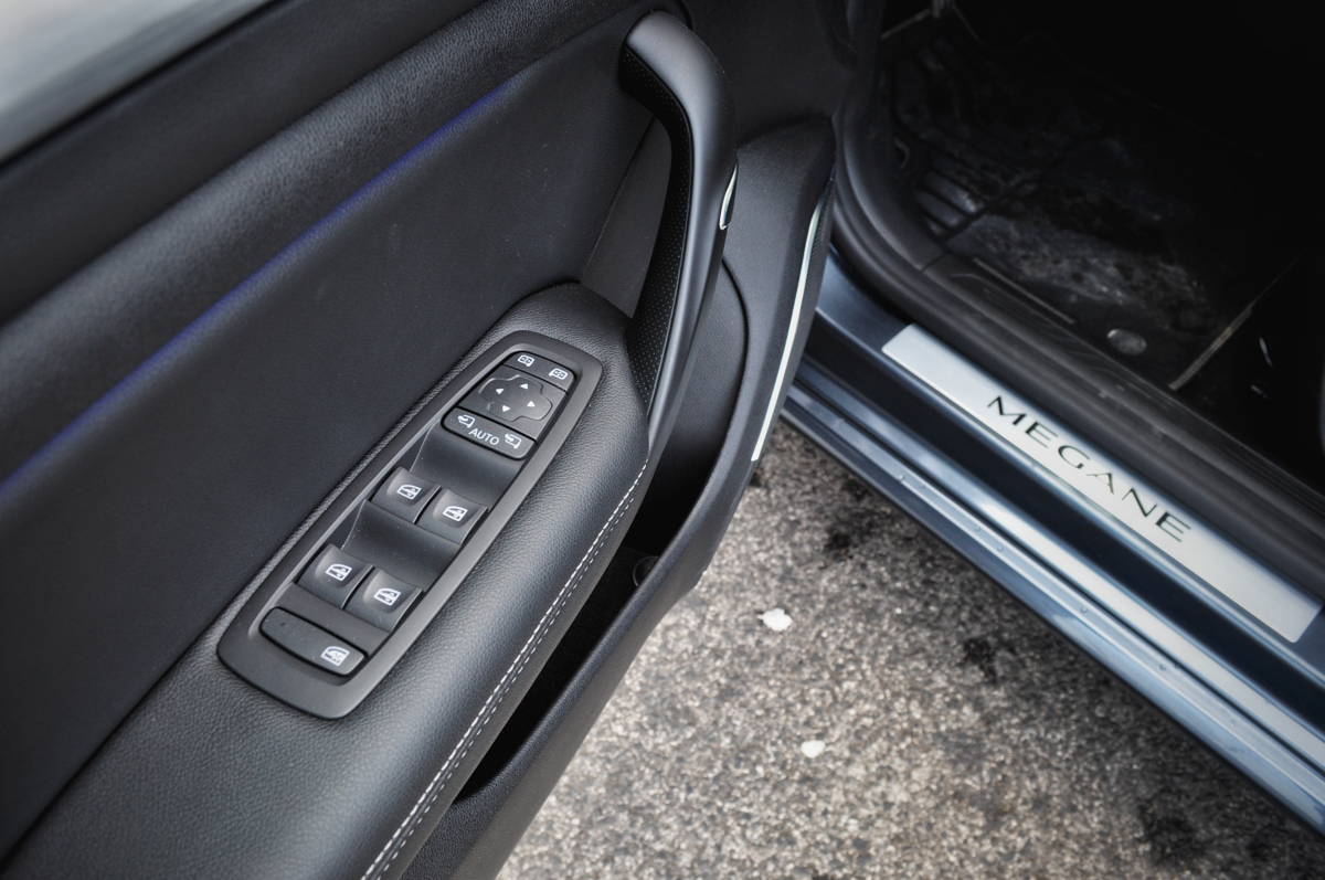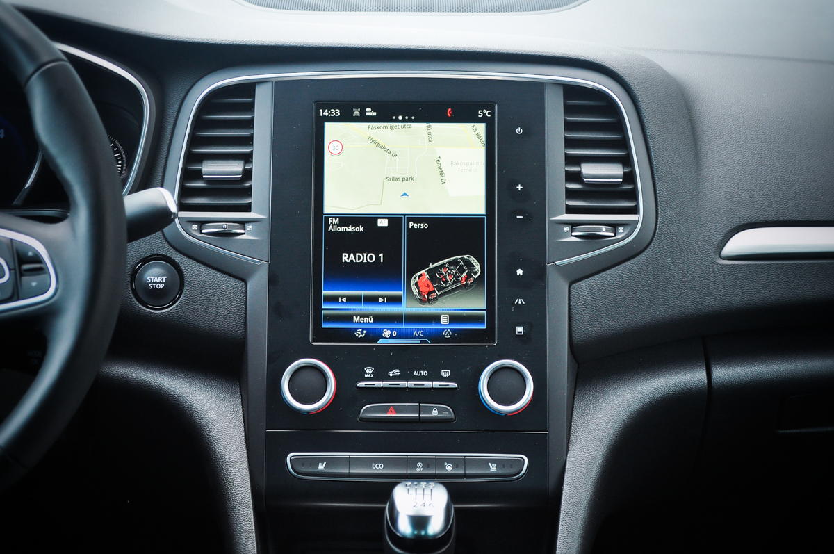 Micsoda belső! Az utastér hozza az alsó-középkategóriában elvárható minőséget, sőt igényes dizájnnal is megfűszerezték a franciák. A legtöbb helyen puha műanyag vagy puha bőrborítás fogad, a Corolla minőségével simán vetekszik a Mégane szedánja. A középkonzolt matt műanyag borítja, és egyáltalán nem igénytelen króm szegélyezi. Itt és az ajtókon is visszaköszön az általunk beállított, a központi 8,7 colos tableten választható hangulatvilágítás-szín. Továbbra is nagyszerűnek tartom a Renault R-Link 2 rendszer kezelését, bár a méretes érintőképernyős tablet 280 000 forint felár még az Intens csúcsfelszereltséghez is. Kezelése nem meglepően az okostelefonok világát hozza, hiszen Android alapú. A végtelen variálhatóság, a sokrétű menürendszer, a widgetek mind megvettek, ráadásul minden vezetés közben is fontos funkció gombnyomásra elérhető. A hagyományos műszerblokk egy részét képernyő váltja, rajzolata változtatható, nem csak a színe, de ha akarjuk fordulatszámmérő, sebességmérő, vagy Eco-mutató jeleníthető meg. Az Eco-mód egyébként különálló gombot is kapott a tablet-kijelző alatt, közvetlen a volánpörgetős parkolássegéd mellett, ami nem csak párhuzamosan, de merőlegesen és halszálkás parkolóba is képes parkolni.